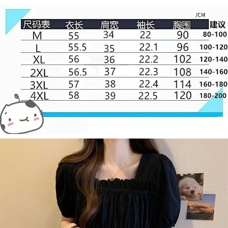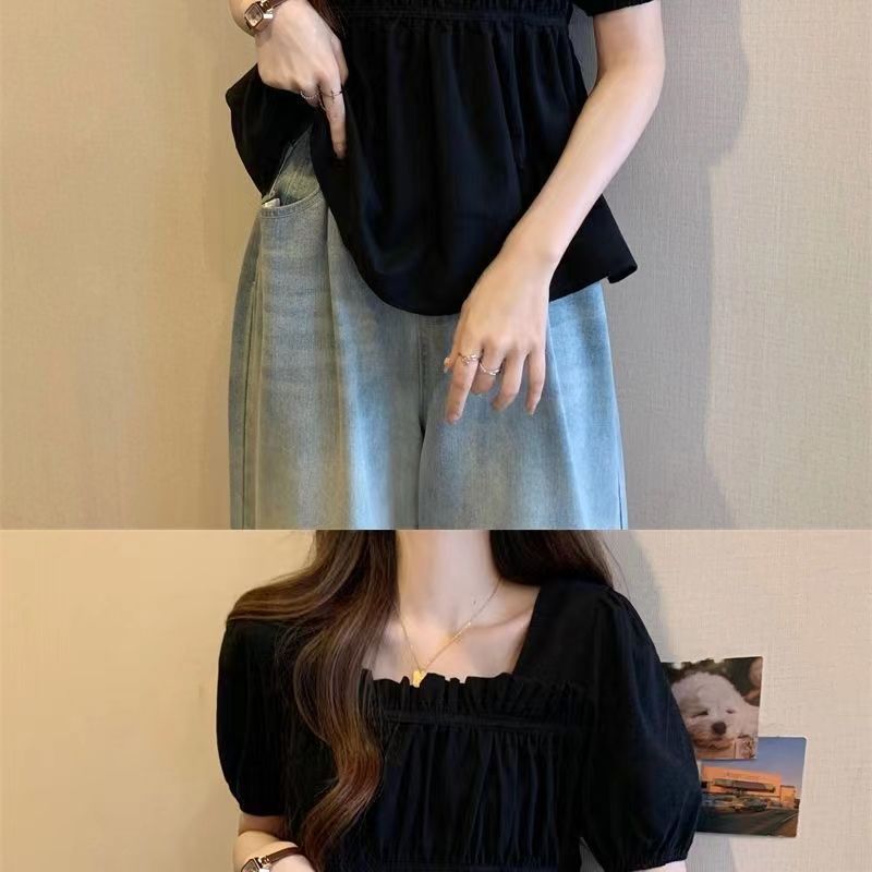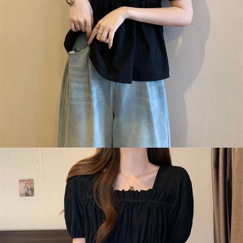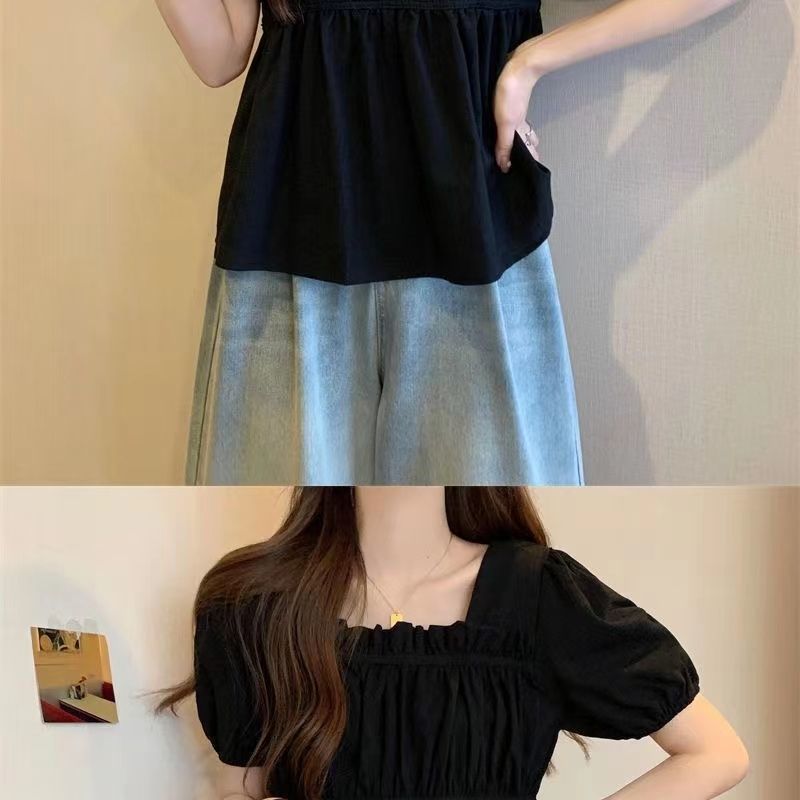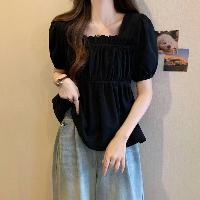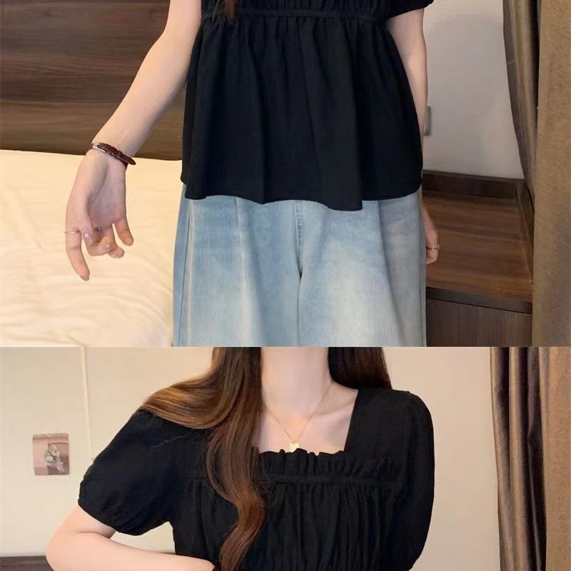 새로운 여성 스퀘어 칼라 주름 반팔 인형 셔츠 여성의 여름 디자인 감각 느슨한 배 덮음 뚱뚱한 소녀를위한 새로운스토어 가기