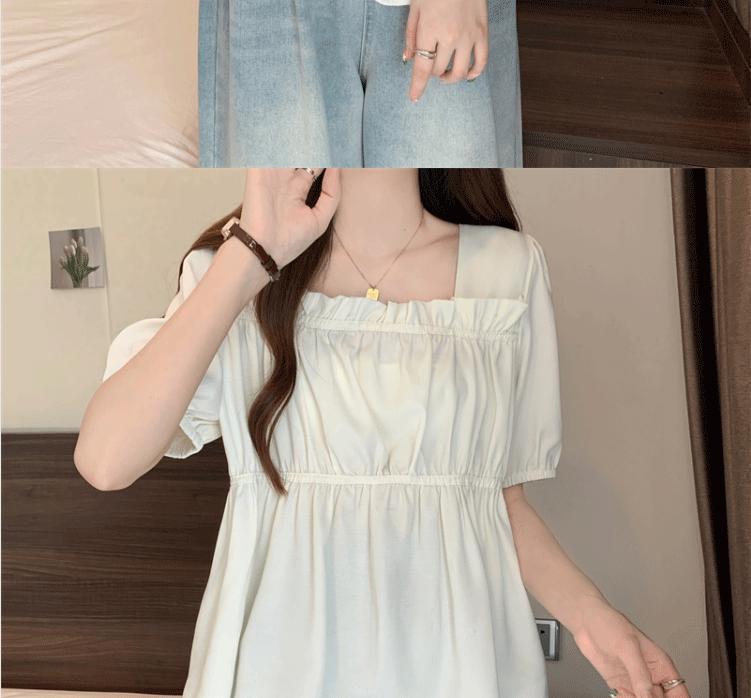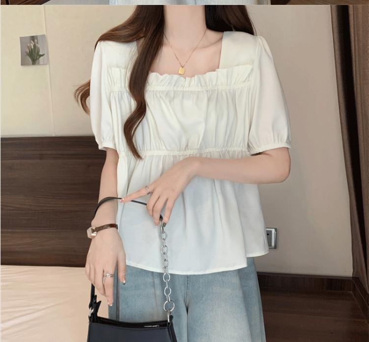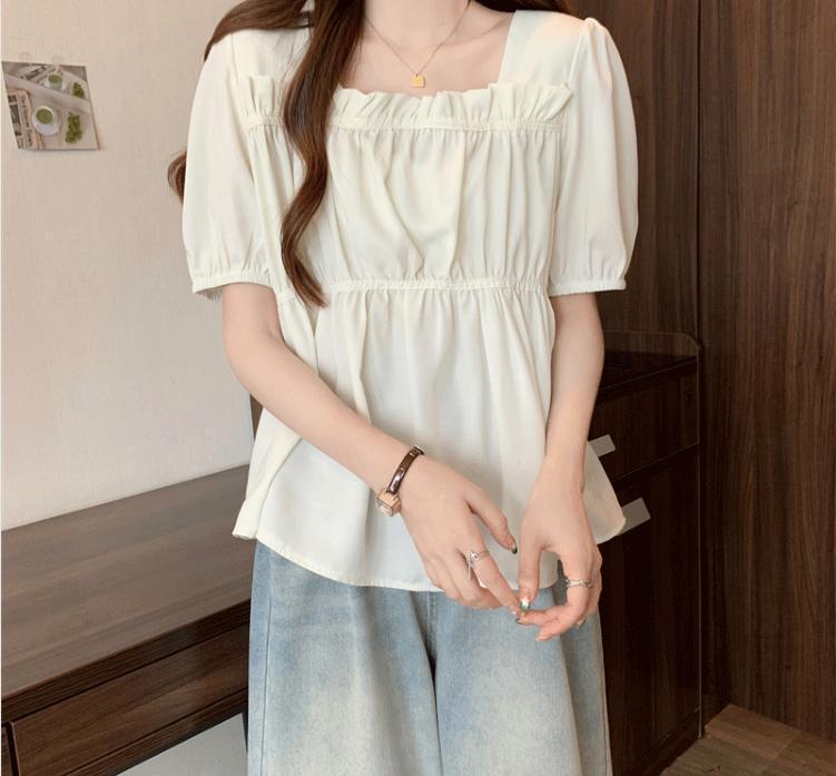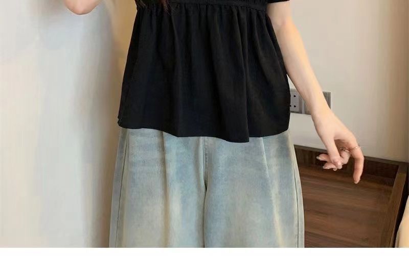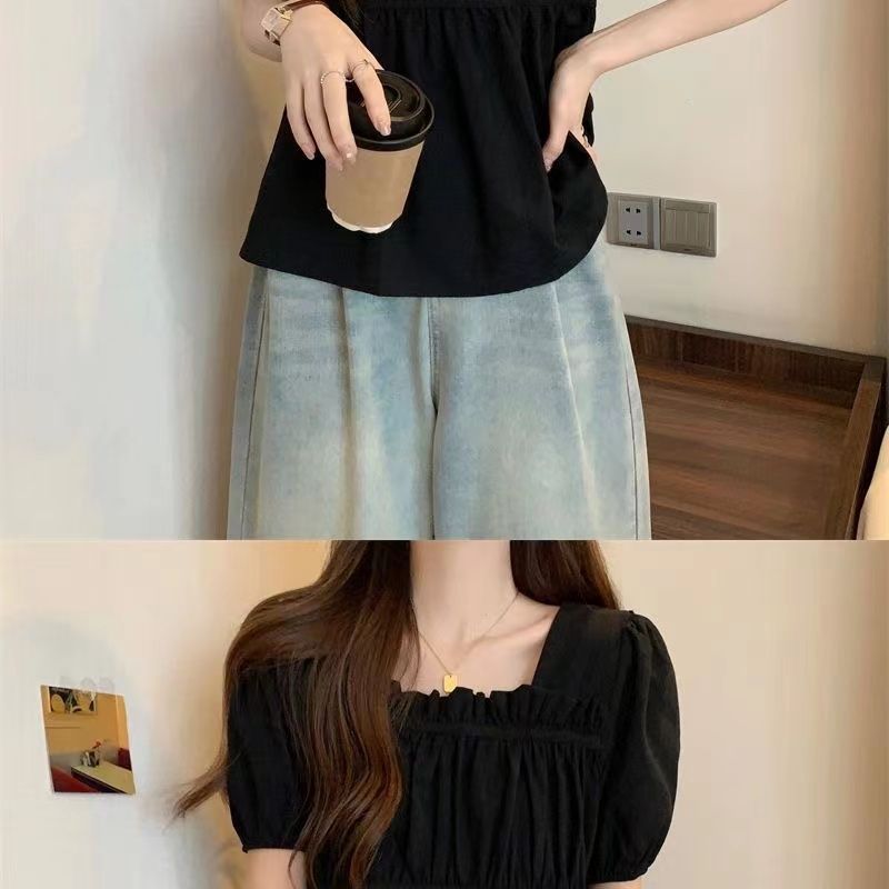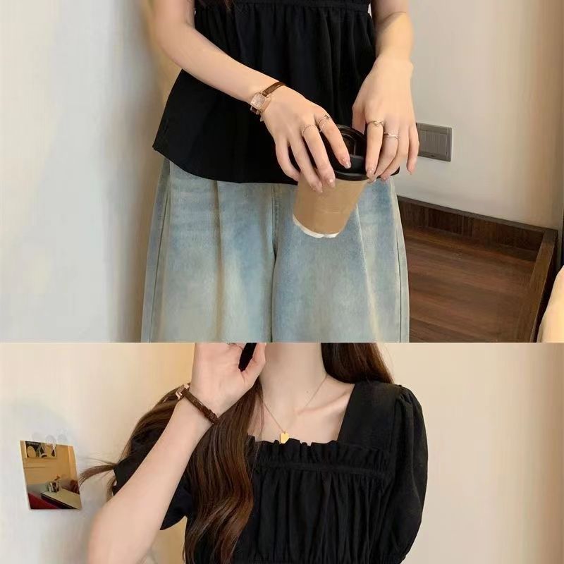 새로운 여성 스퀘어 칼라 주름 반팔 인형 셔츠 여성의 여름 디자인 감각 느슨한 배 덮음 뚱뚱한 소녀를위한 새로운스토어 가기