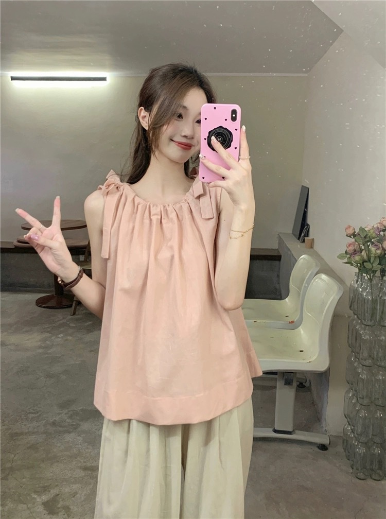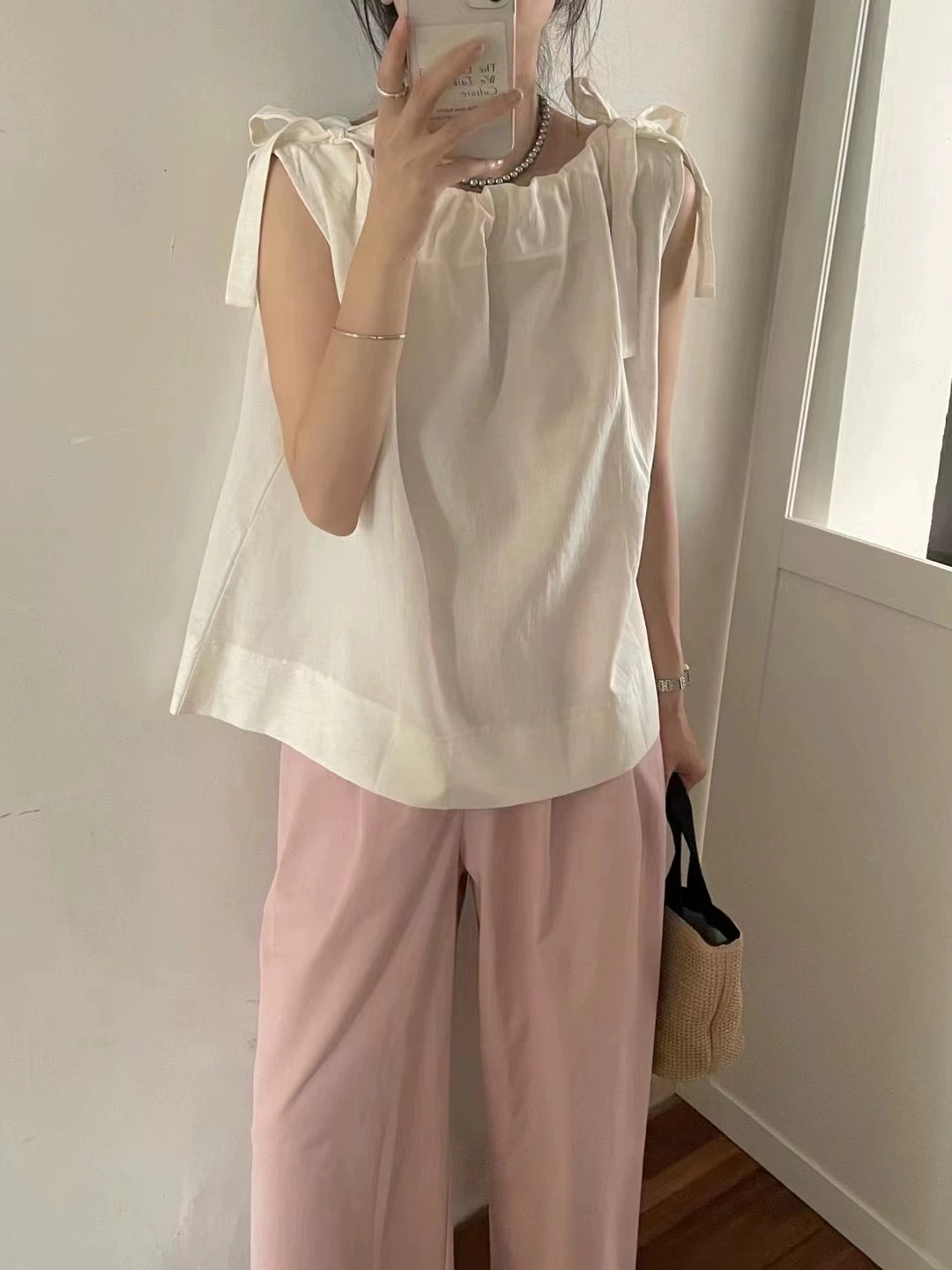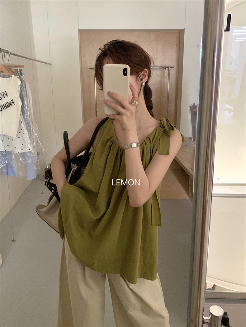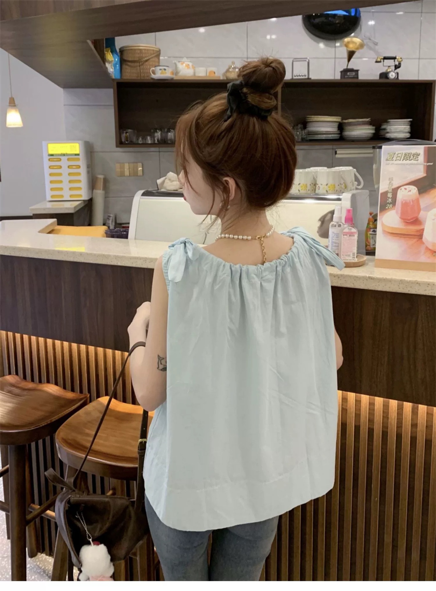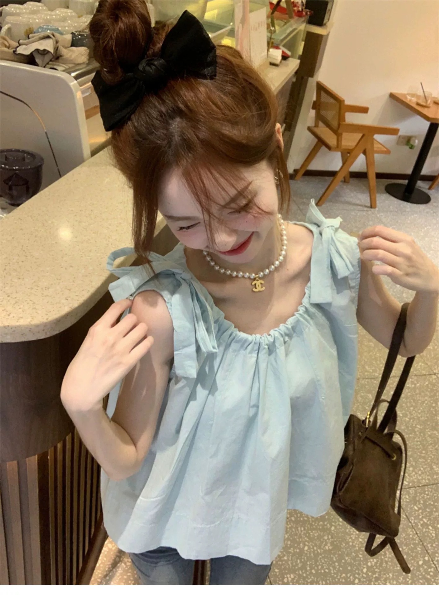 달콤한 스타일 리넨 느슨한 민소매 셔츠 여성용 여름 얇은 캐주얼 살포 인형 셔츠 끈 조끼 여성 셔츠