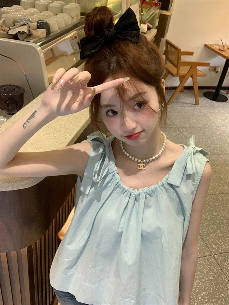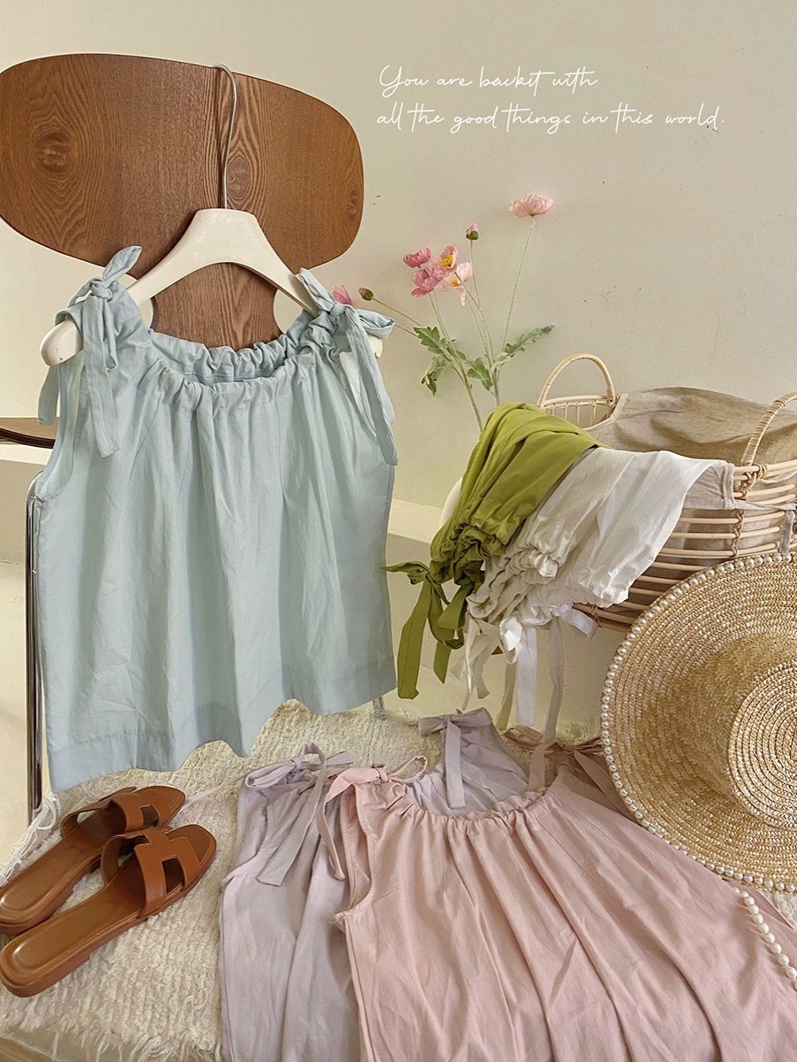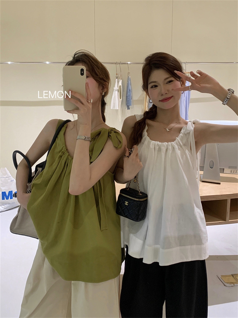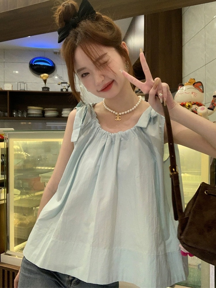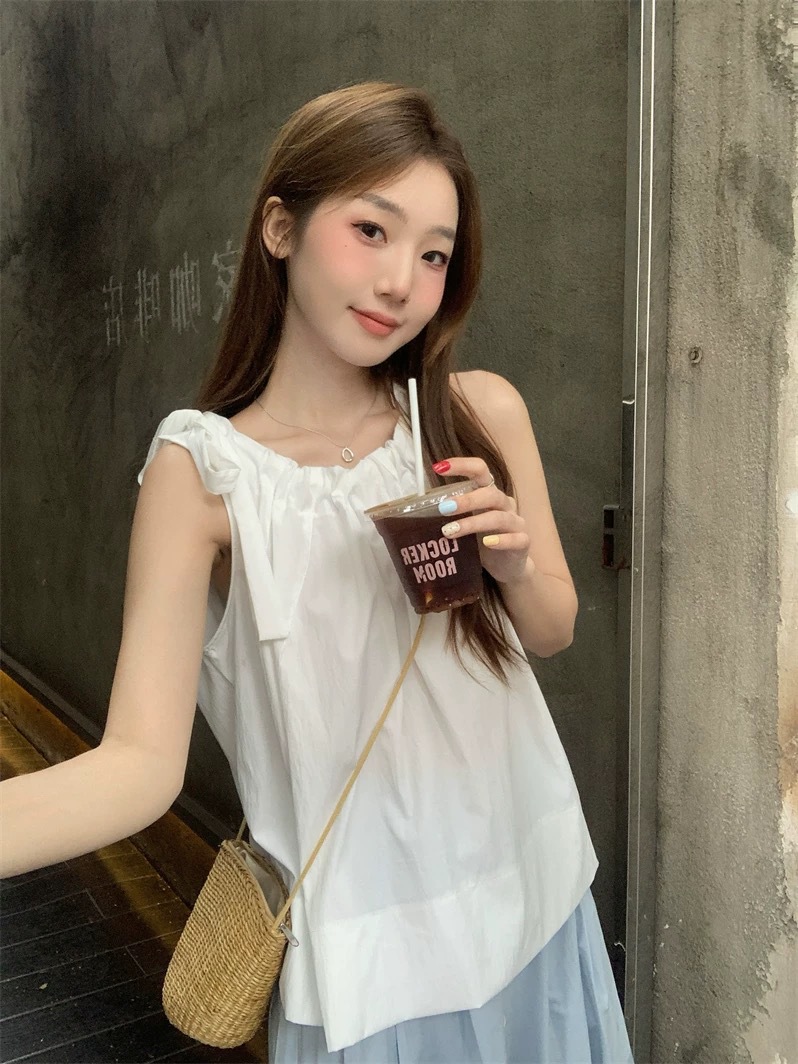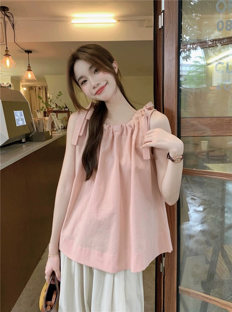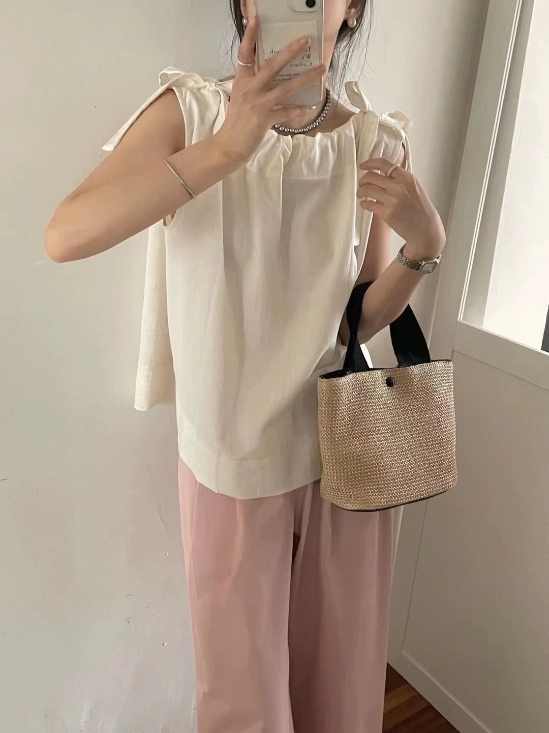 달콤한 스타일 리넨 느슨한 민소매 셔츠 여성용 여름 얇은 캐주얼 살포 인형 셔츠 끈 조끼 여성 셔츠