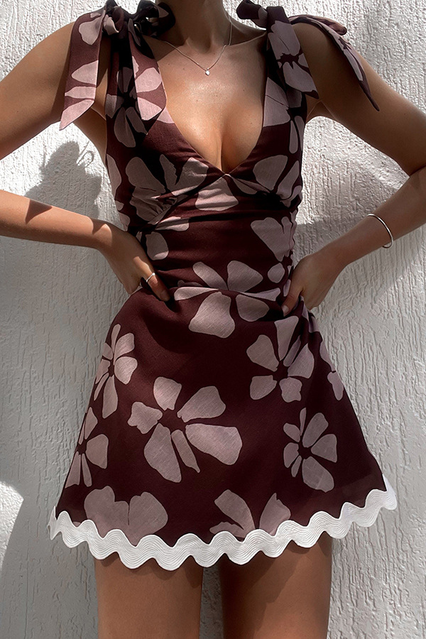 소스 공장 유럽과 미국 2024 독립 역 봄과 여름 새로운 레이스 업 인쇄 스위트 스타일 v 칼라 미니 원피스 여성