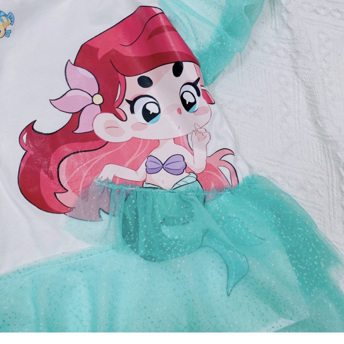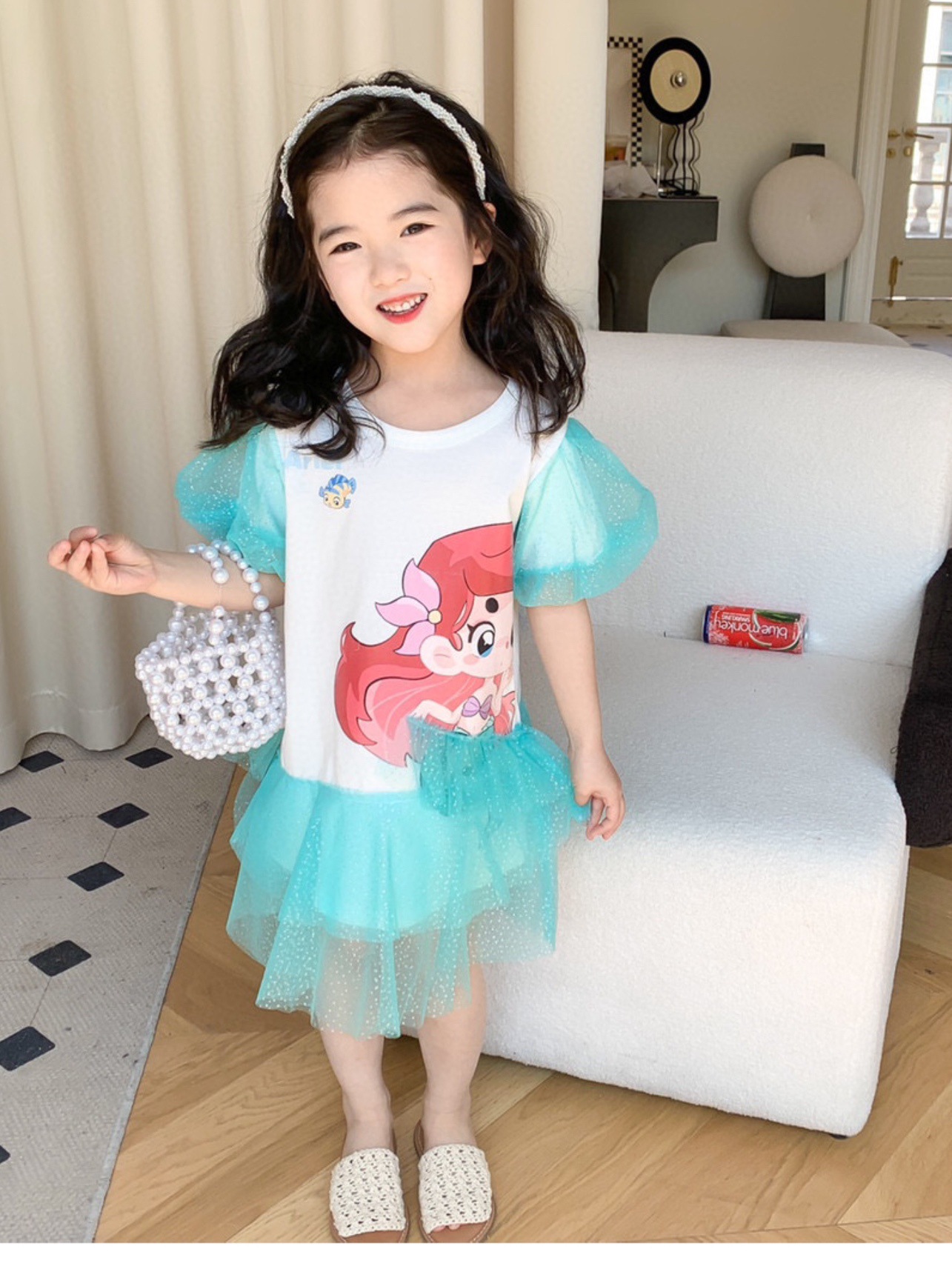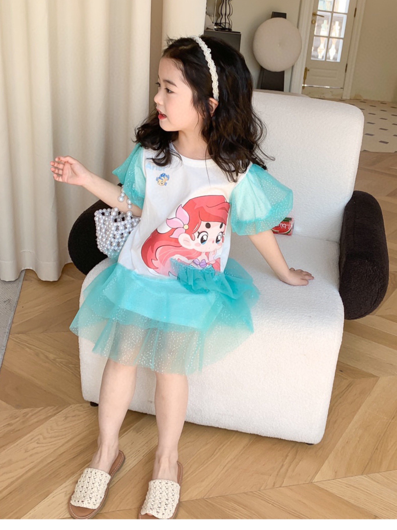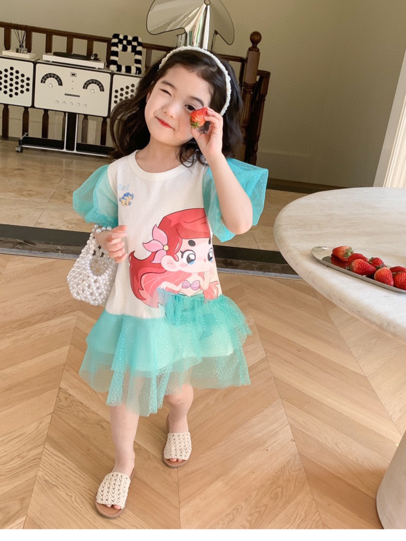 2024 새로운 여름 소녀 아기 인어 티셔츠 원피스 만화 귀여운 트렌디 올매치 웨스턴 스타일 퍼프 슬리브 원피스
