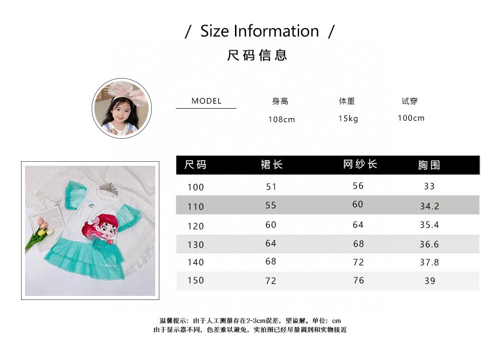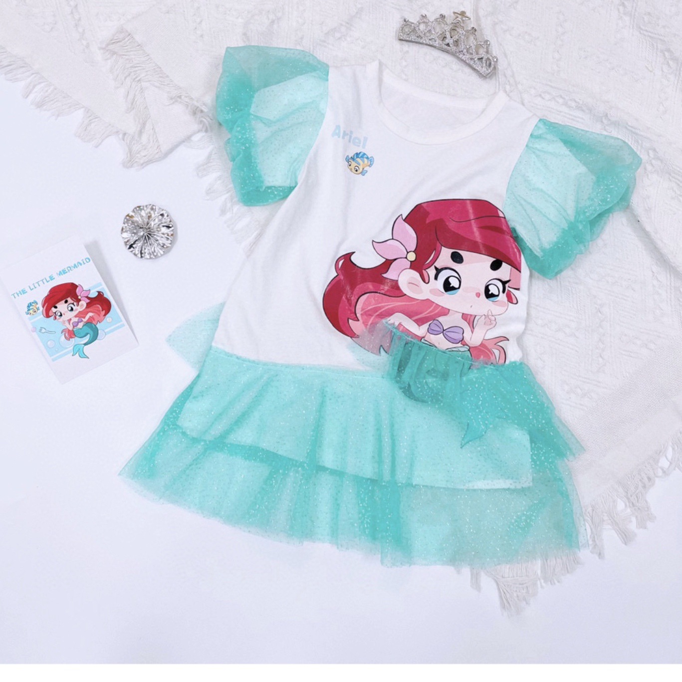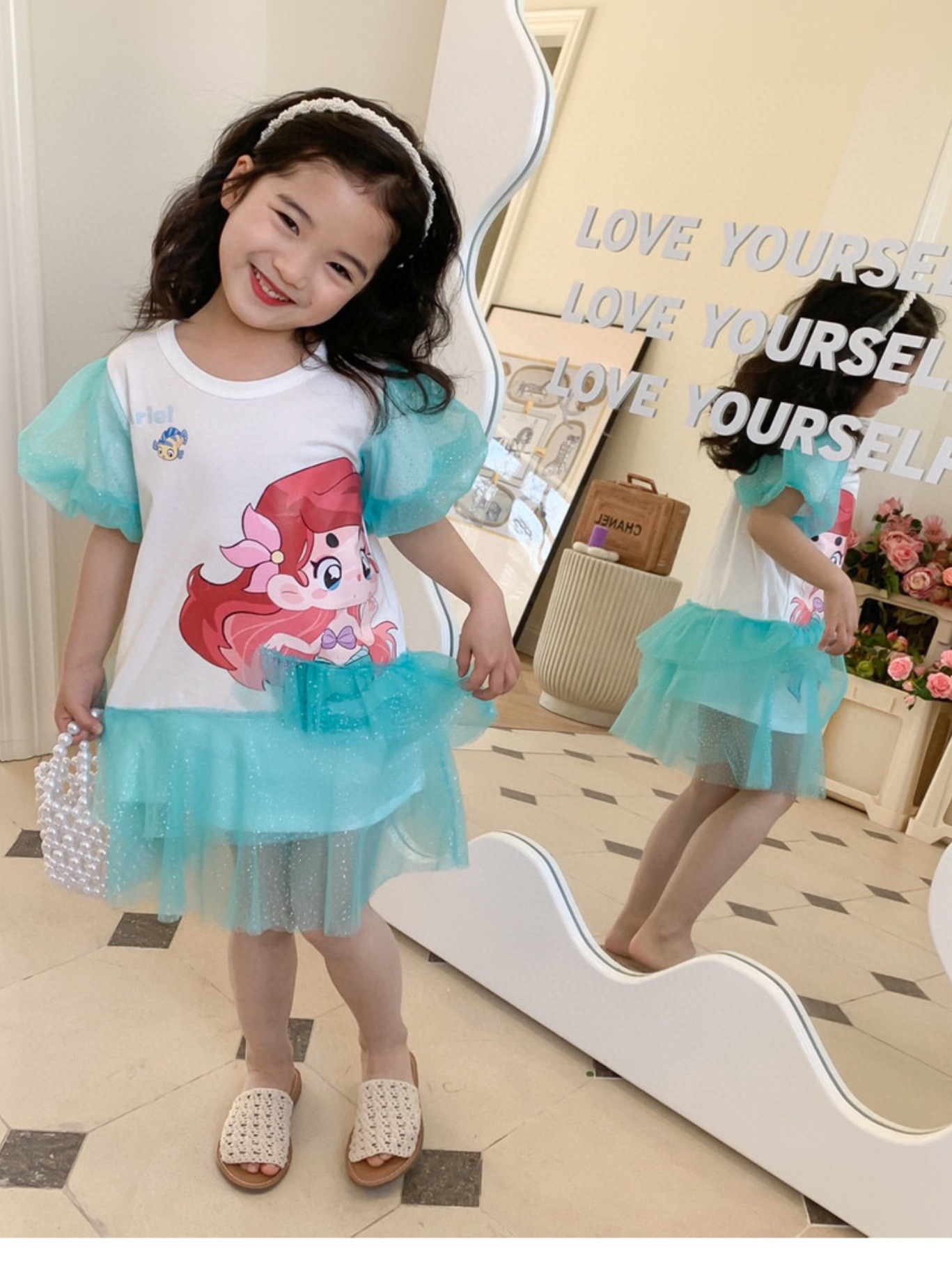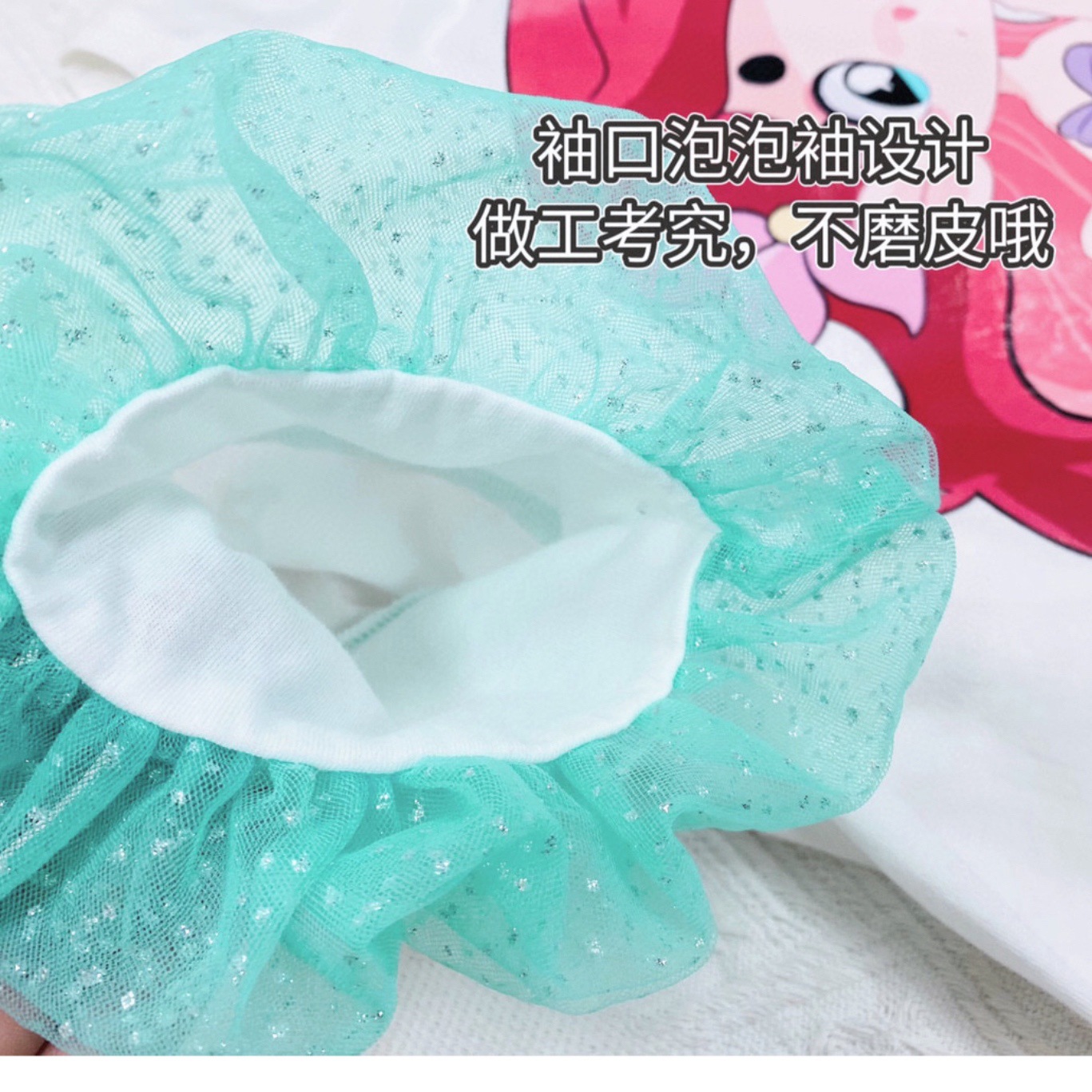 2024 새로운 여름 소녀 아기 인어 티셔츠 원피스 만화 귀여운 트렌디 올매치 웨스턴 스타일 퍼프 슬리브 원피스