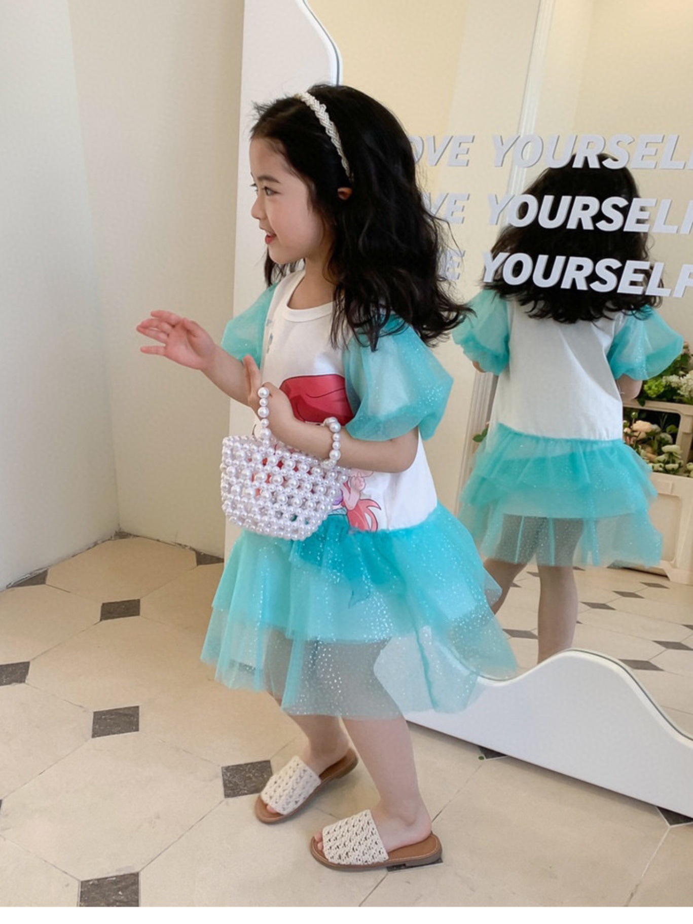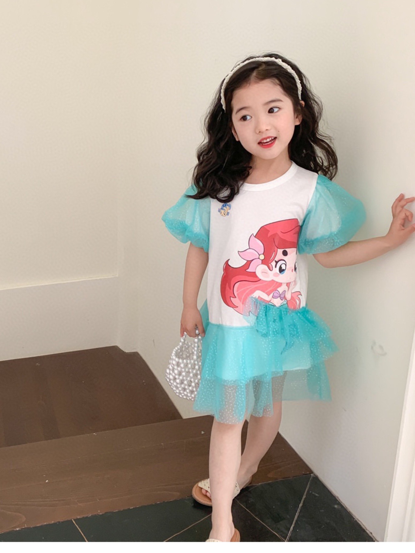 2024 새로운 여름 소녀 아기 인어 티셔츠 원피스 만화 귀여운 트렌디 올매치 웨스턴 스타일 퍼프 슬리브 원피스스토어 가기