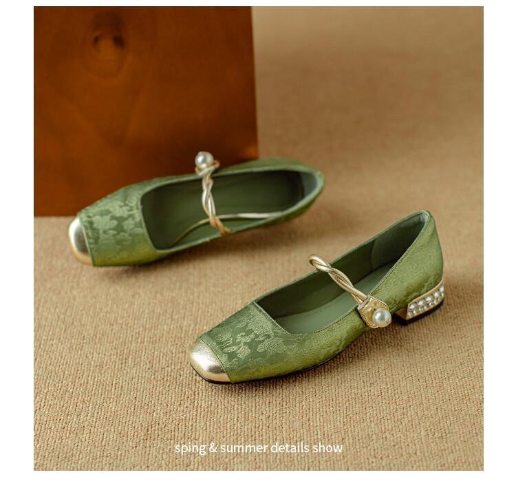 진정한 부드러운 가죽 국가 스타일 수제 신발 여성의 2024 새로운 여름 원피스 메리 제인 신발 라인스톤 플랫 슈즈 그린