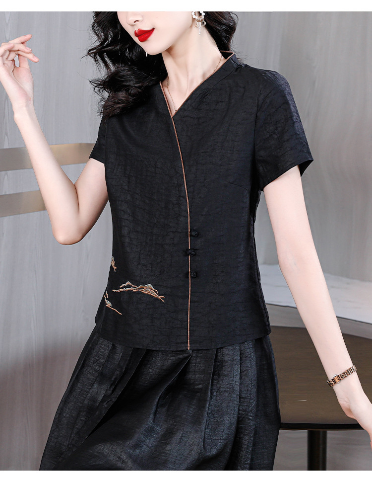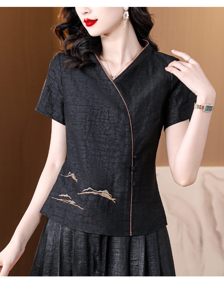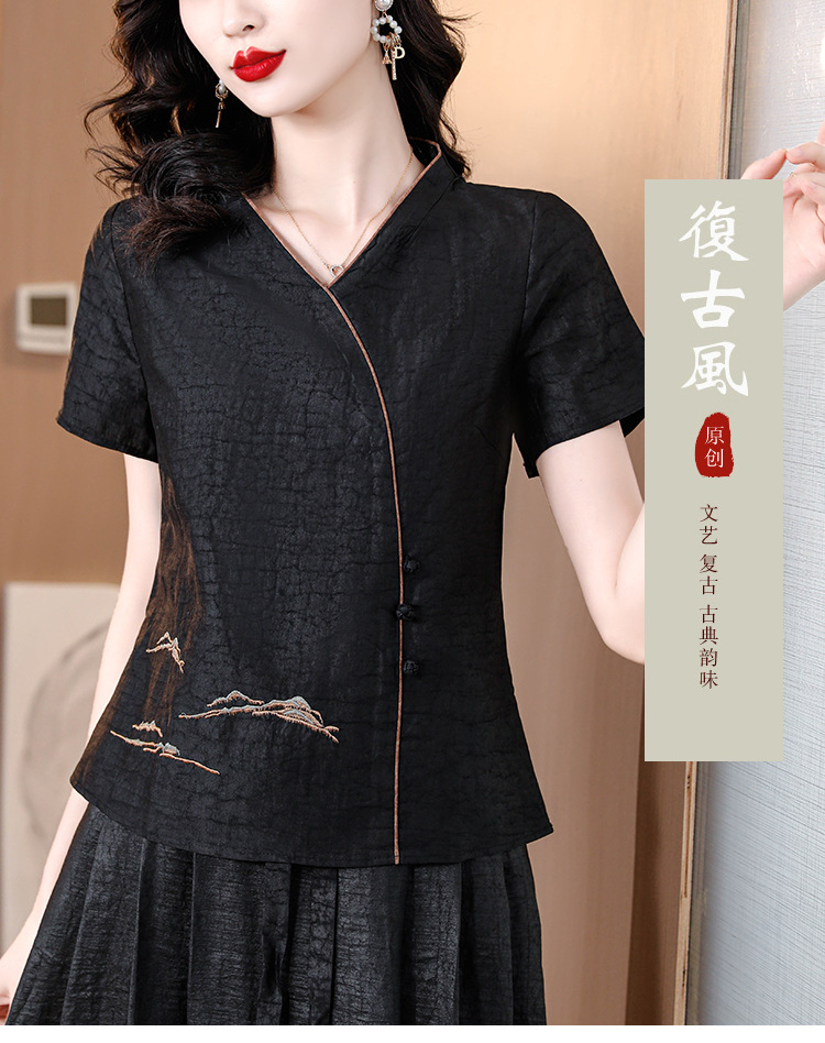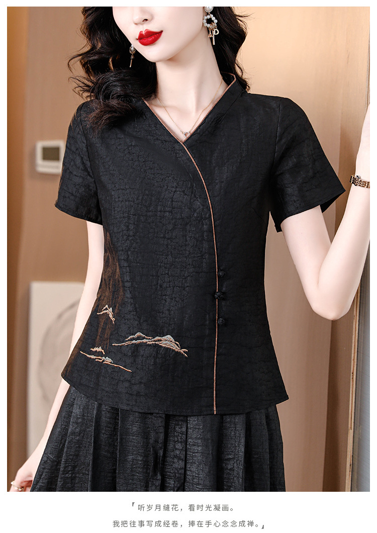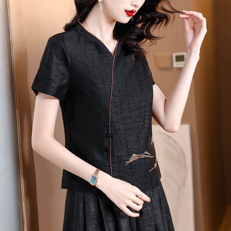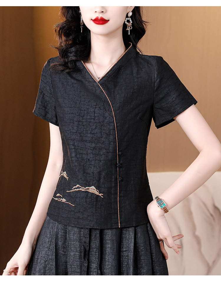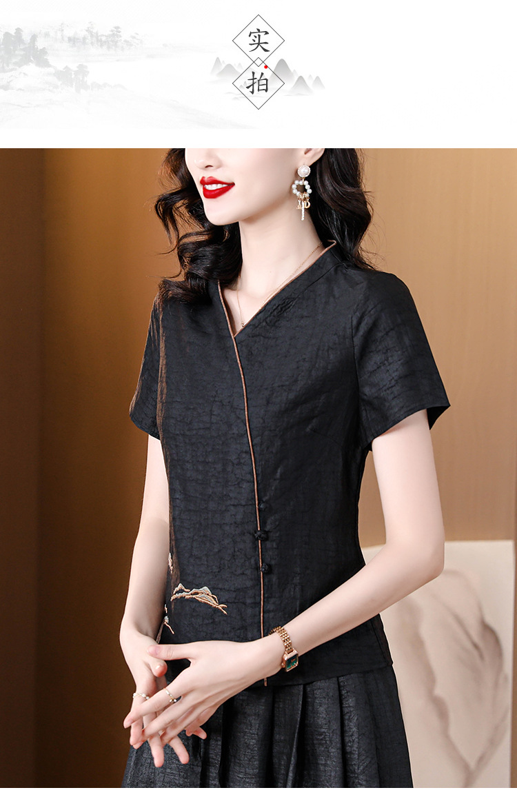 하이 퀄리티 새로운 중국 판 자수 기술 V-neck 짧은 소매 실크 거북 균열 Xiangyun Veil 여름 티셔츠 여성용 셔츠