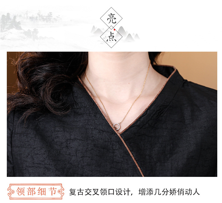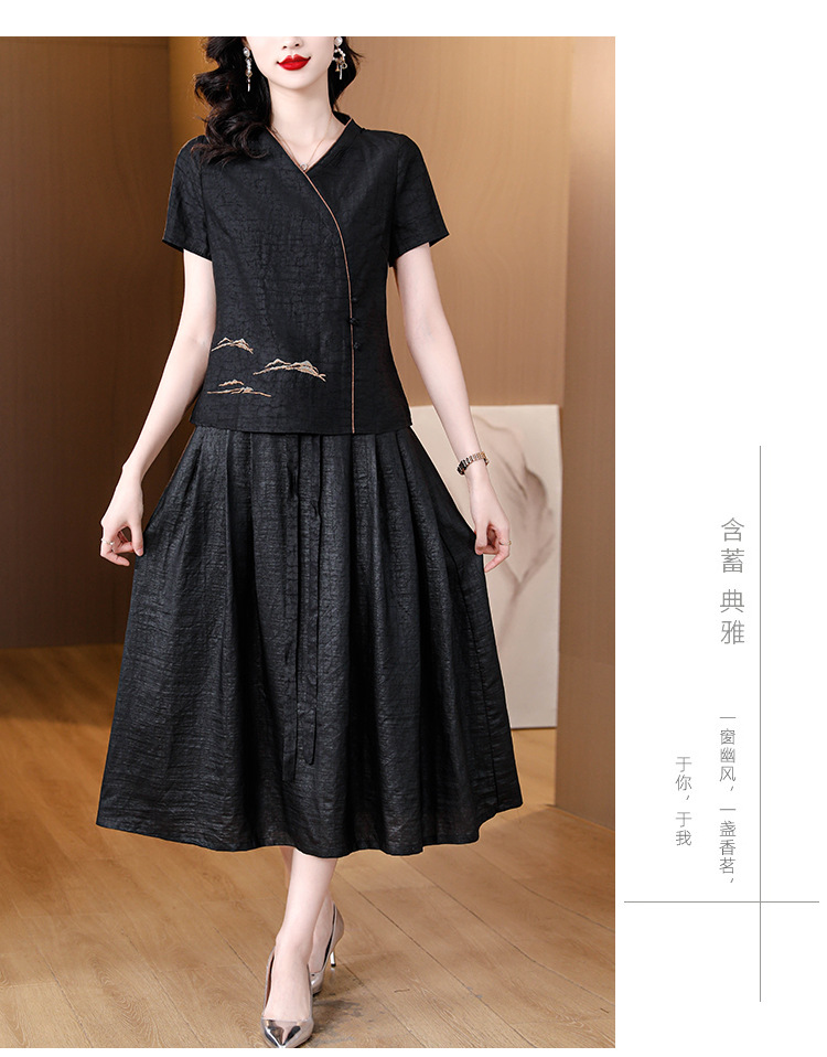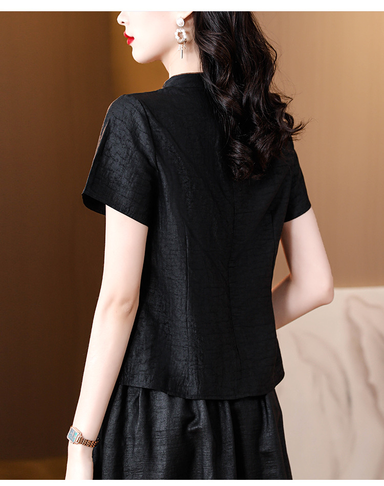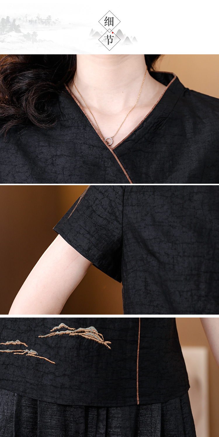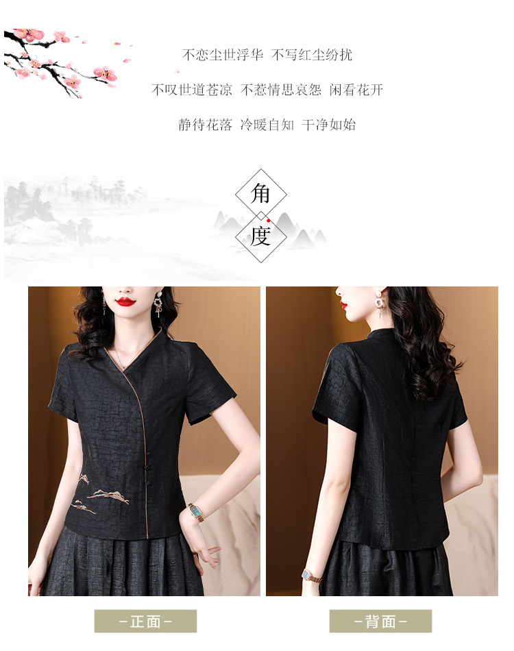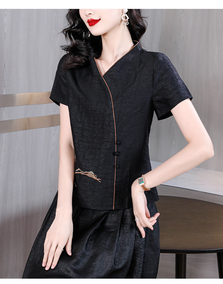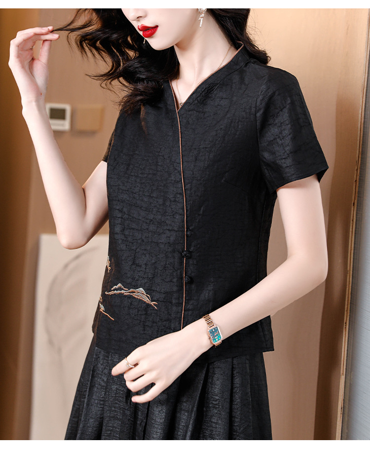 하이 퀄리티 새로운 중국 판 자수 기술 V-neck 짧은 소매 실크 거북 균열 Xiangyun Veil 여름 티셔츠 여성용 셔츠