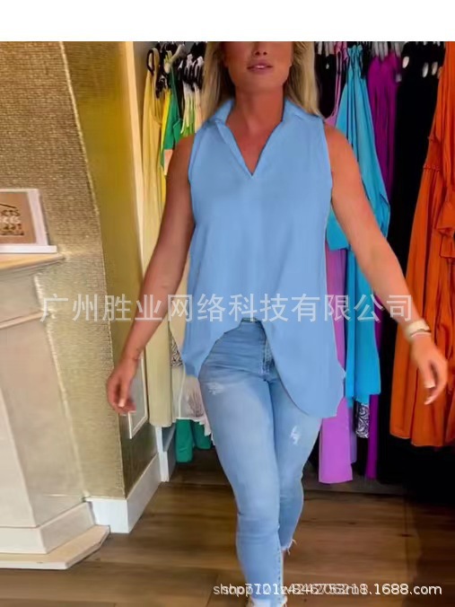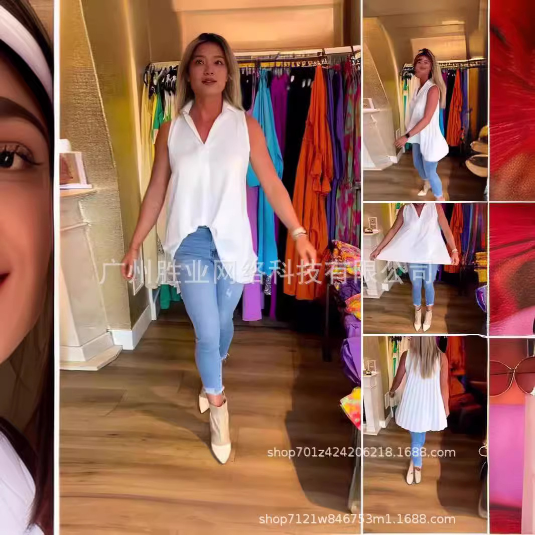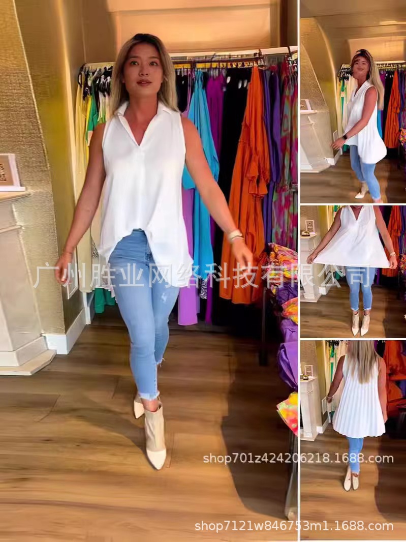 유럽과 미국의 2025 새로운 봄 여름 스팟 유럽과 미국의 아마존 국경 여성 인기 민소매 솔리드 컬러 백 플리츠 셔츠스토어 가기