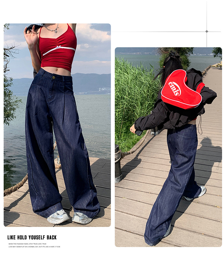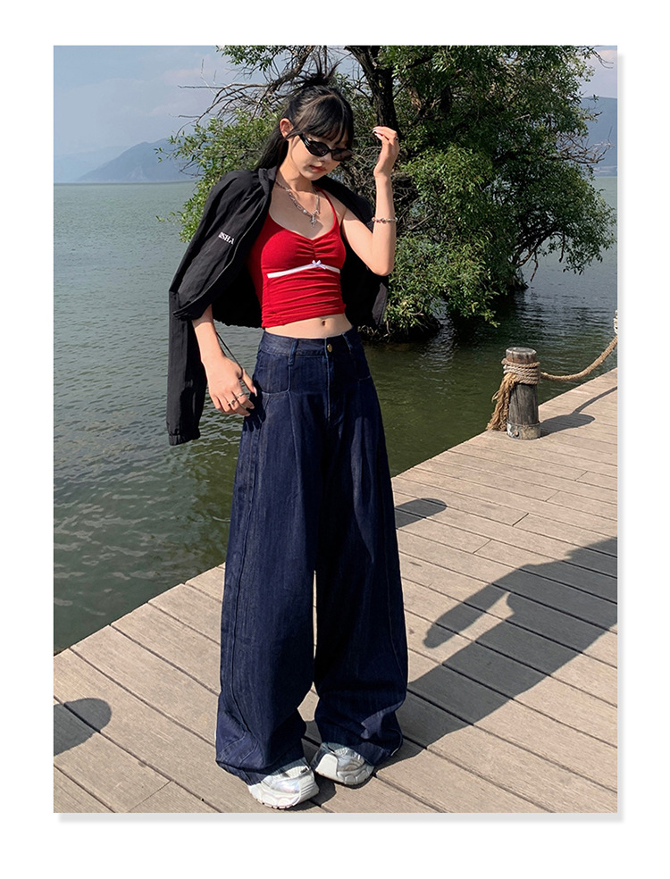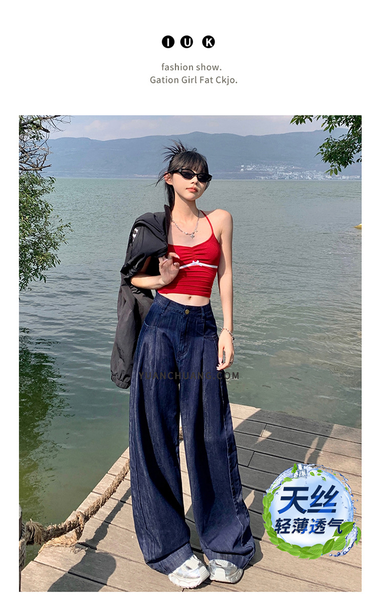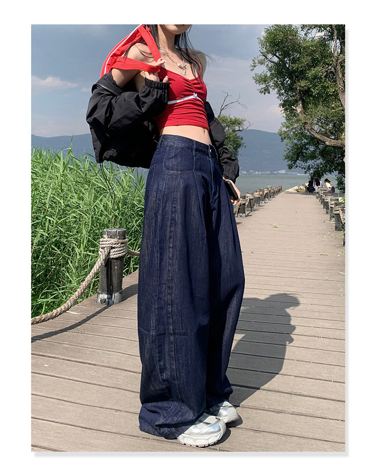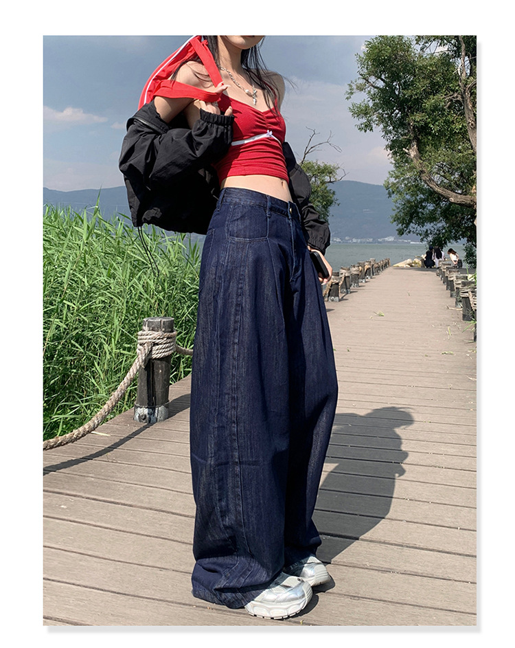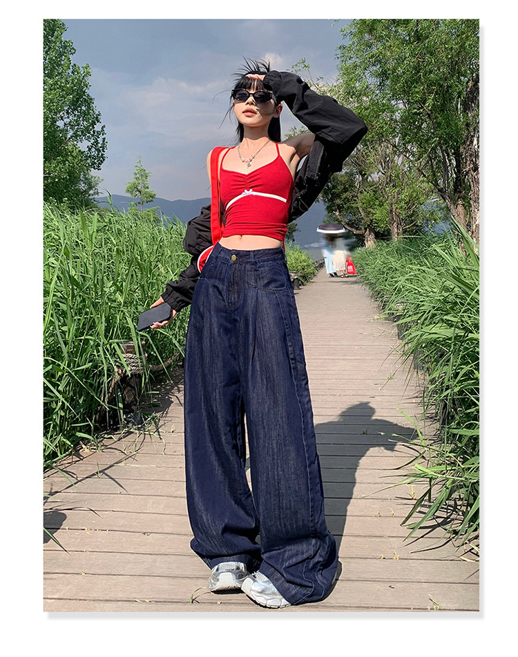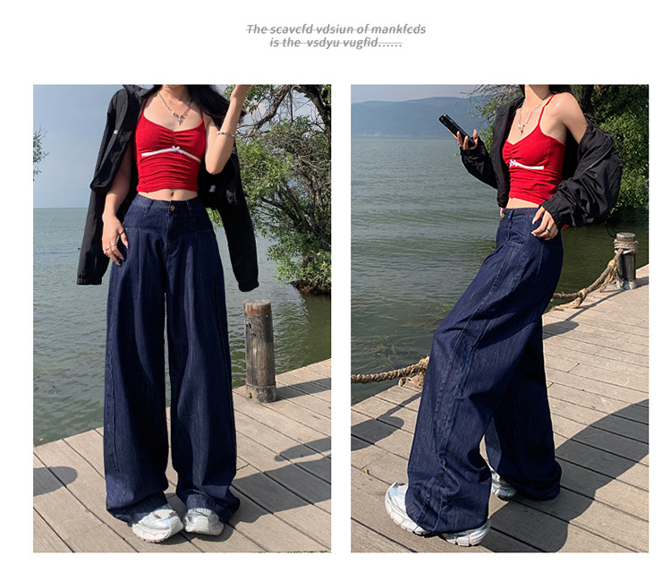 아메리칸 빈티지 다크 블루 텐셀 청바지 여성용 여름 루즈 좁은 와이드 레그 팬츠 딥 아이스 실크 스트레이트 팬츠스토어 가기