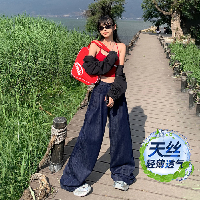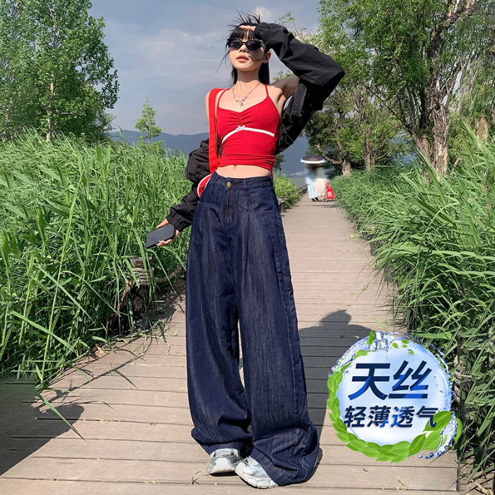 아메리칸 빈티지 다크 블루 텐셀 청바지 여성용 여름 루즈 좁은 와이드 레그 팬츠 딥 아이스 실크 스트레이트 팬츠
