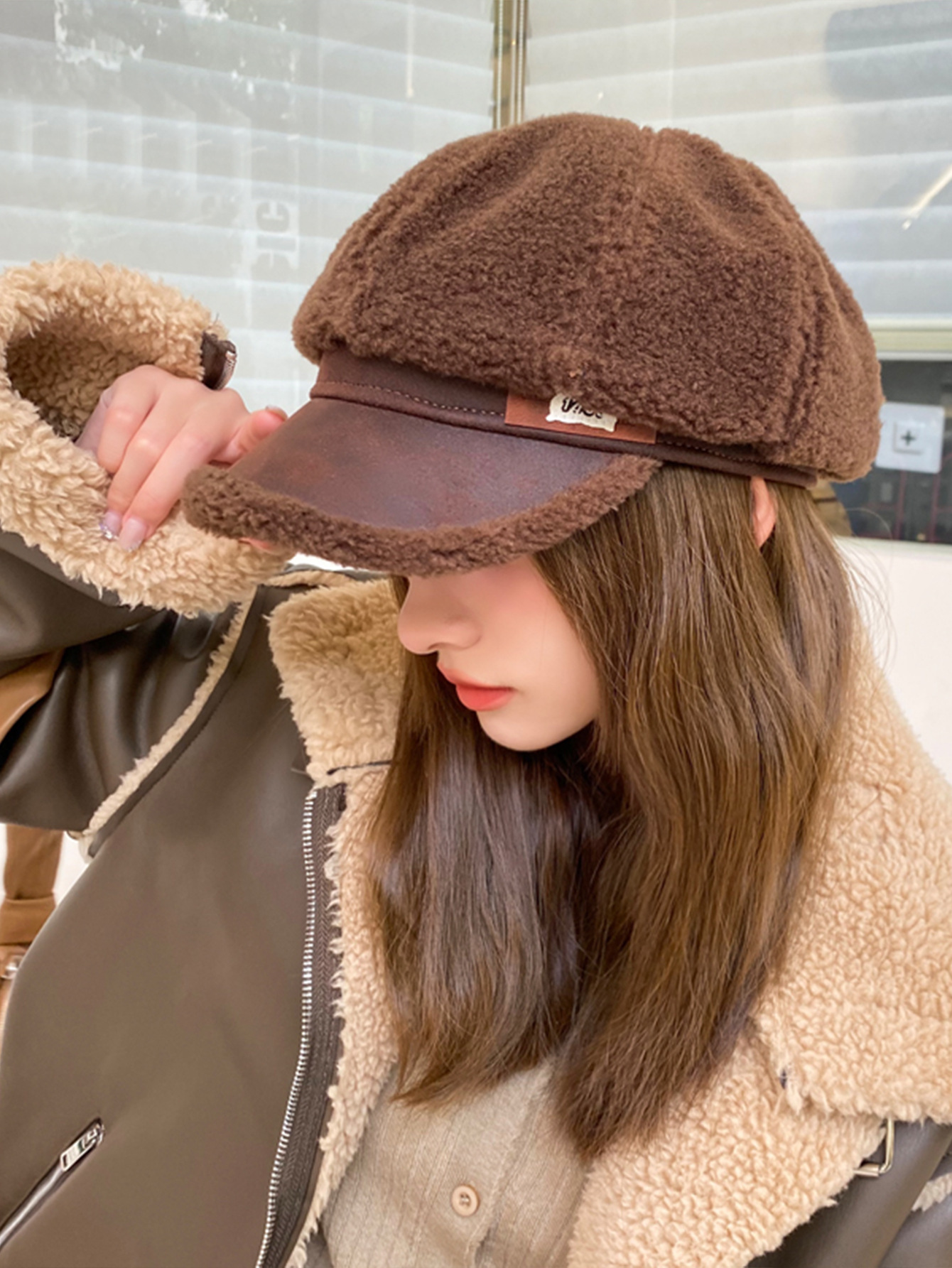 한국 스타일 가을 겨울 모방 양고기 양모 모자 여성 기모 두꺼운 팔각형 모자 겨울 따뜻한 모자 캐주얼 뉴스 보이 모자