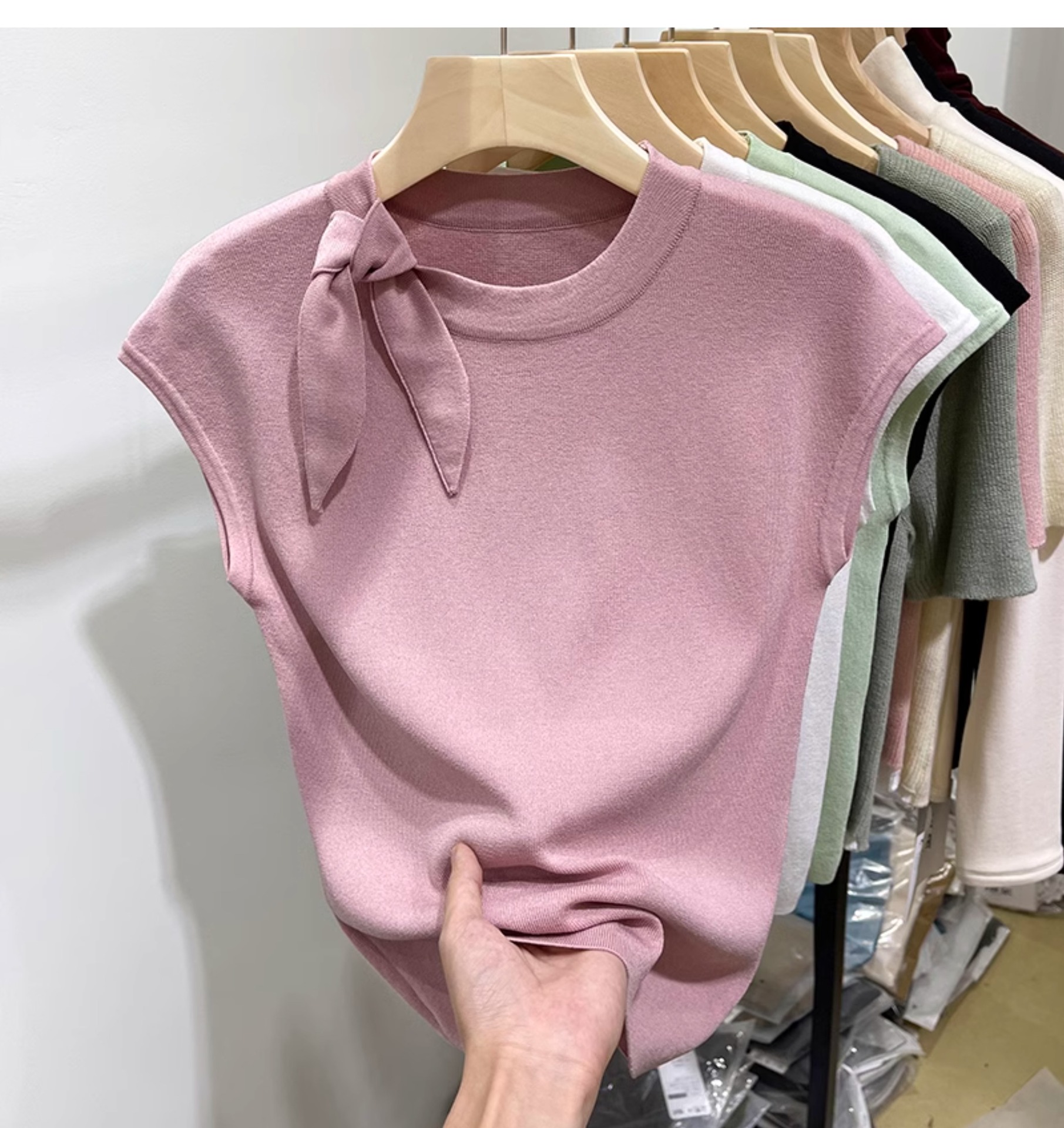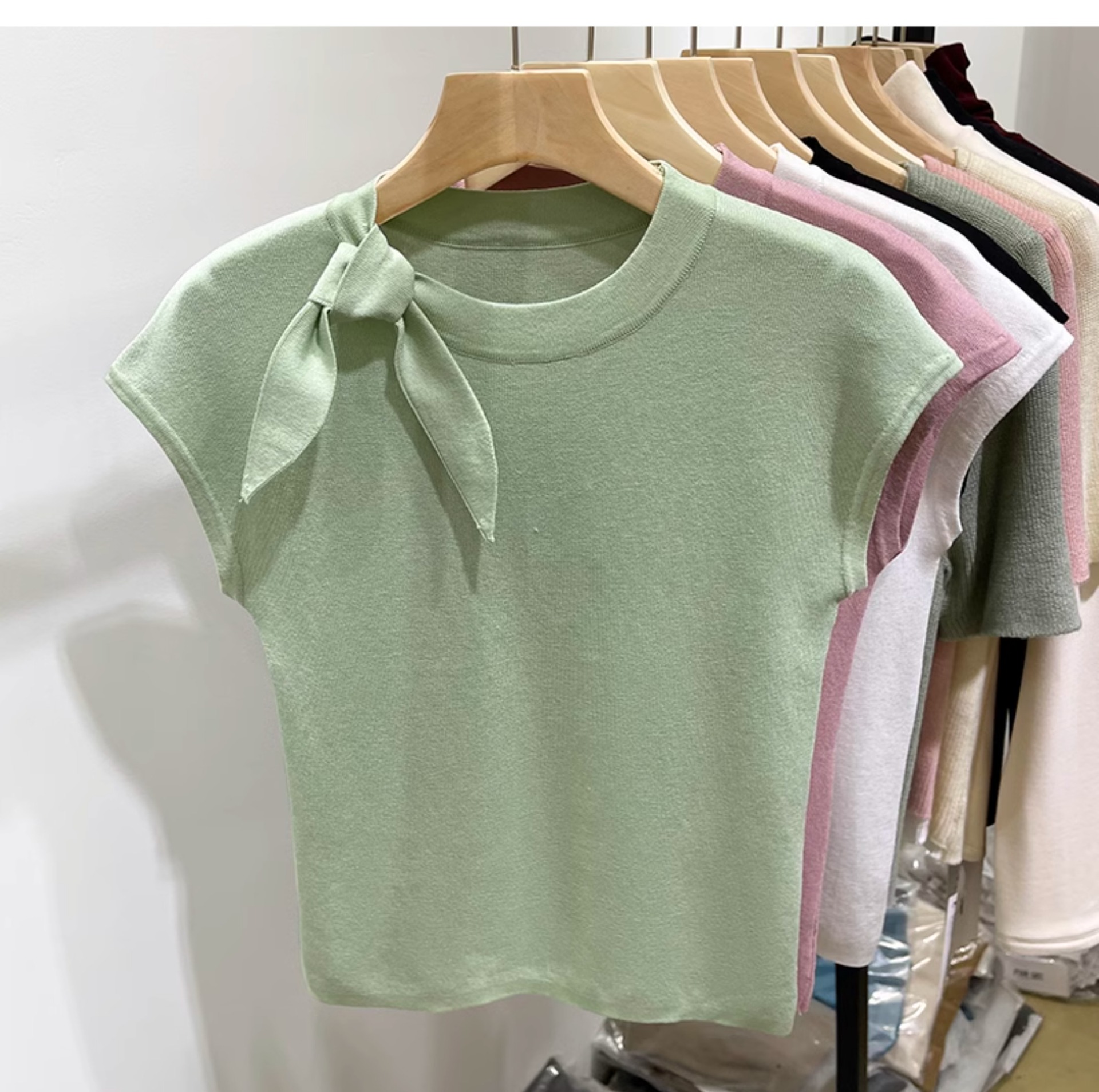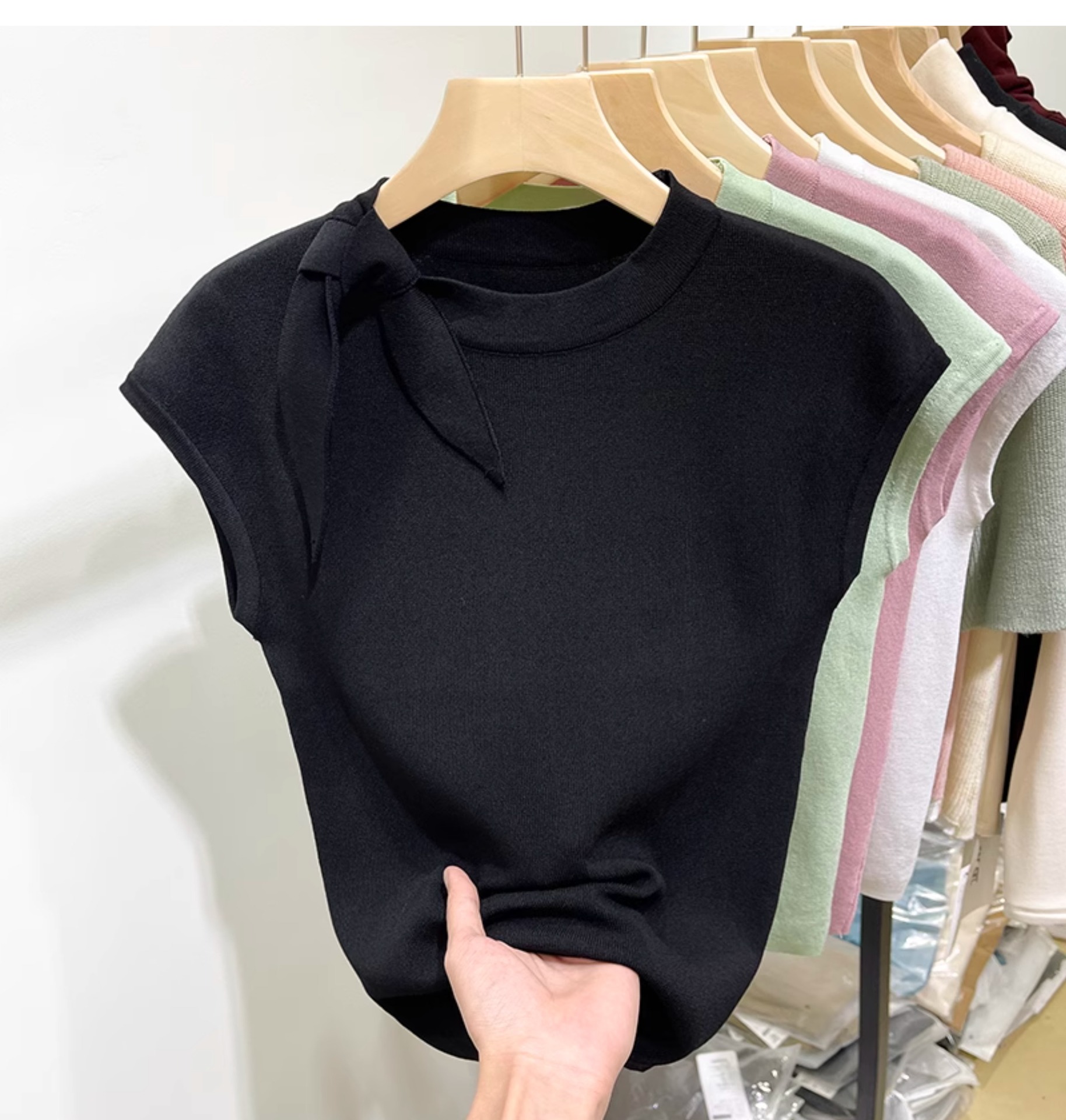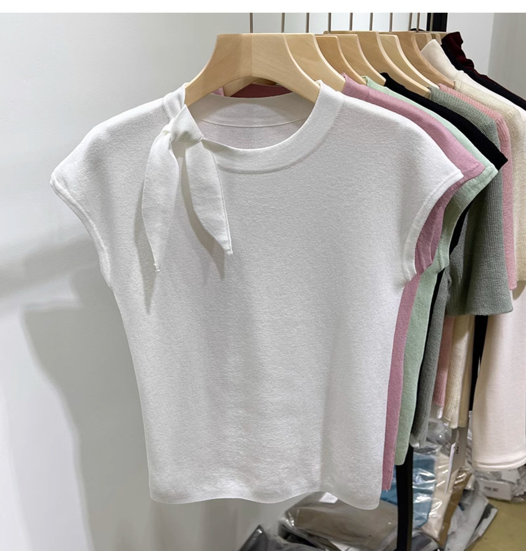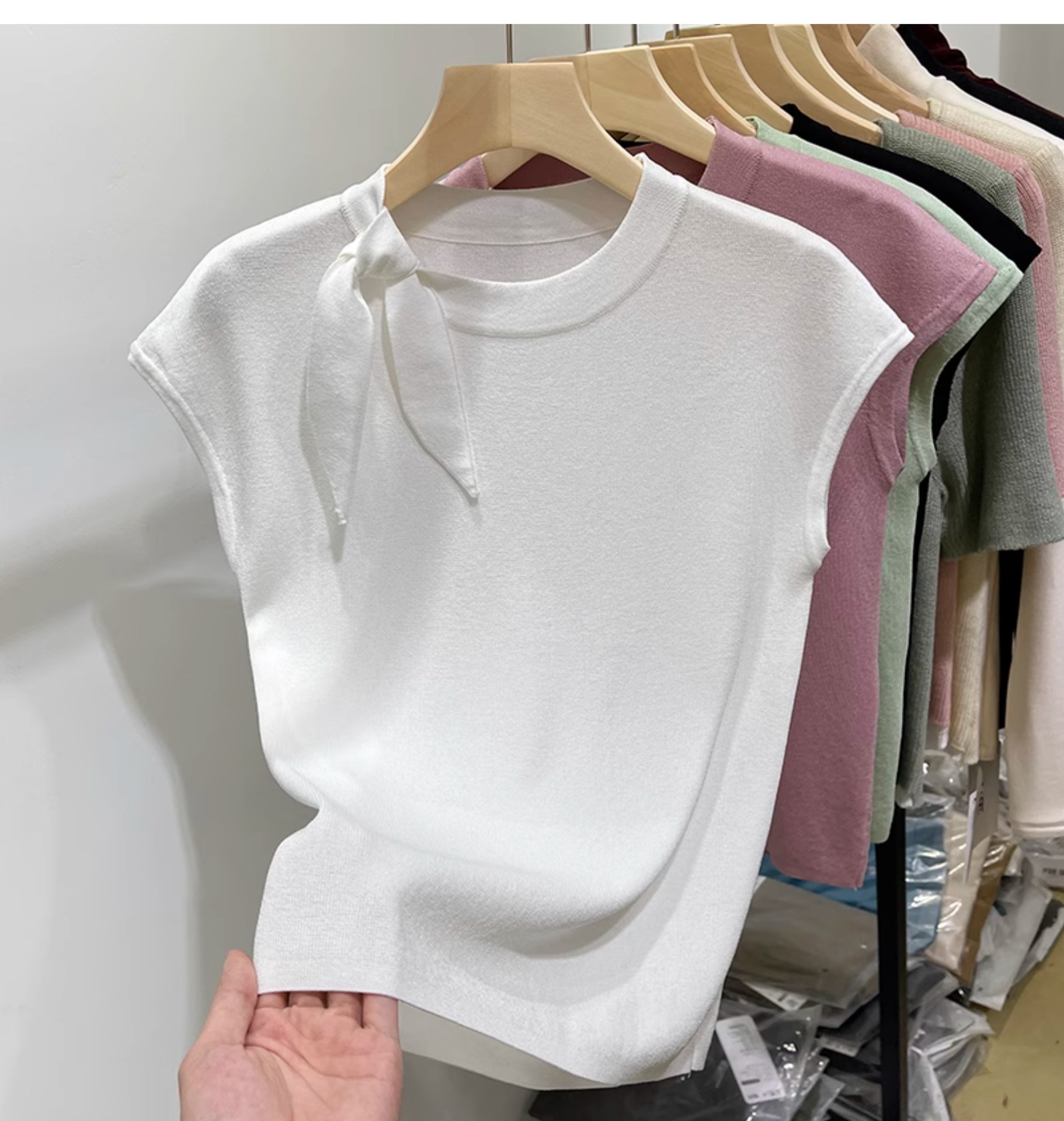스트랩 크루 넥 아이스 실크 반팔 니트 티셔츠 여성 여름 2024 새로운 슬림 핏 올 매치 플라잉 슬리브 셔츠 탑스토어 가기