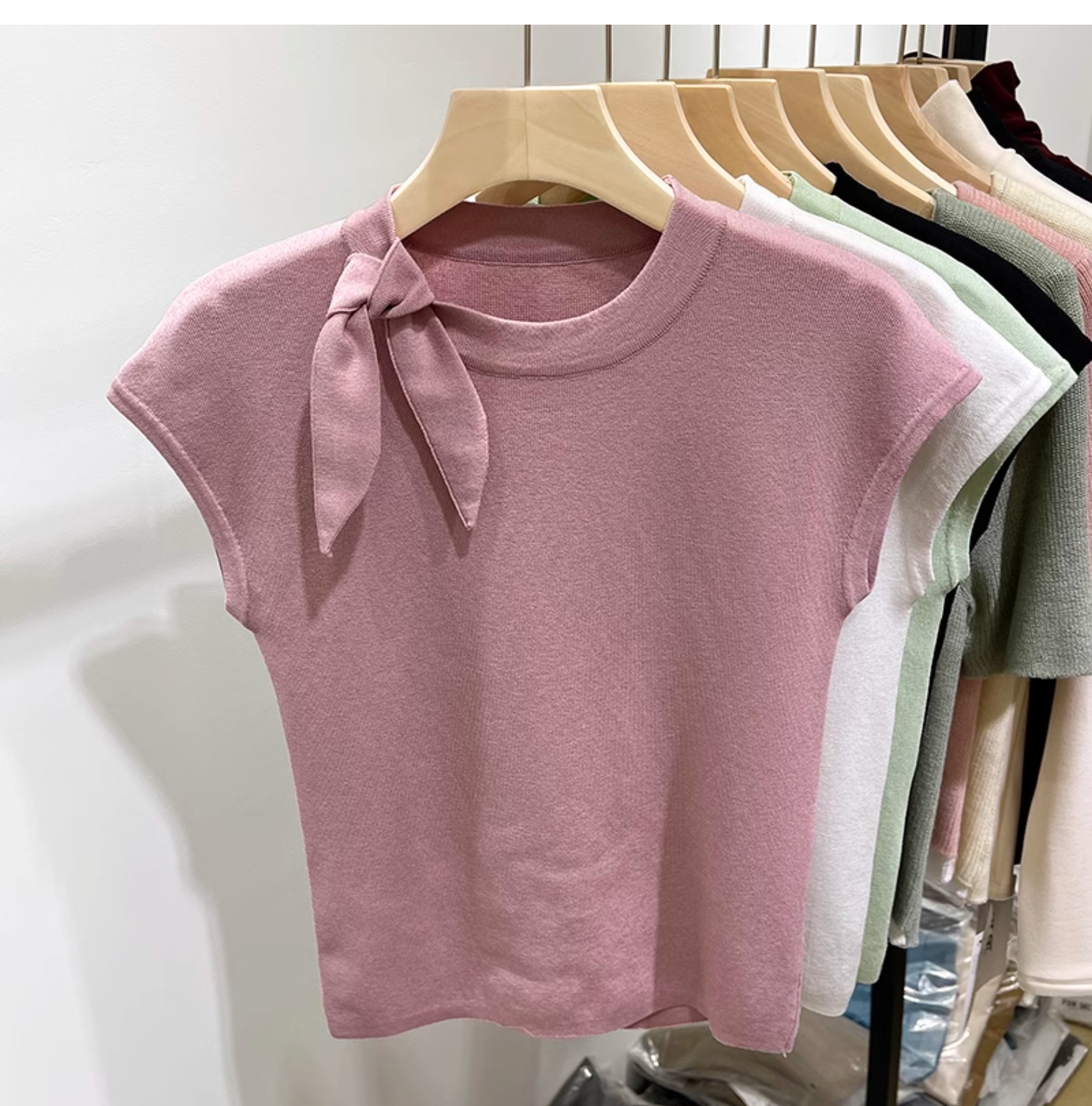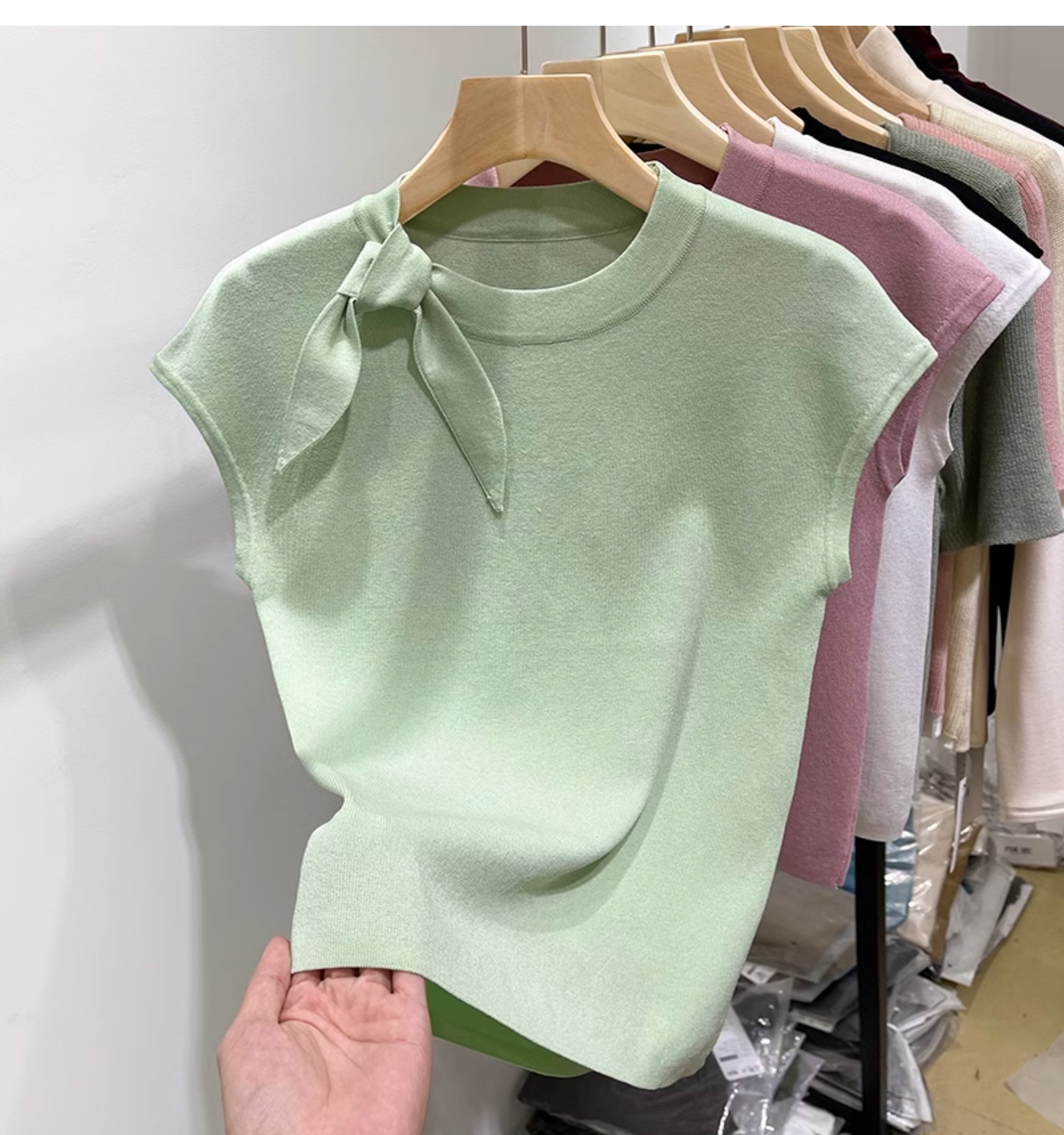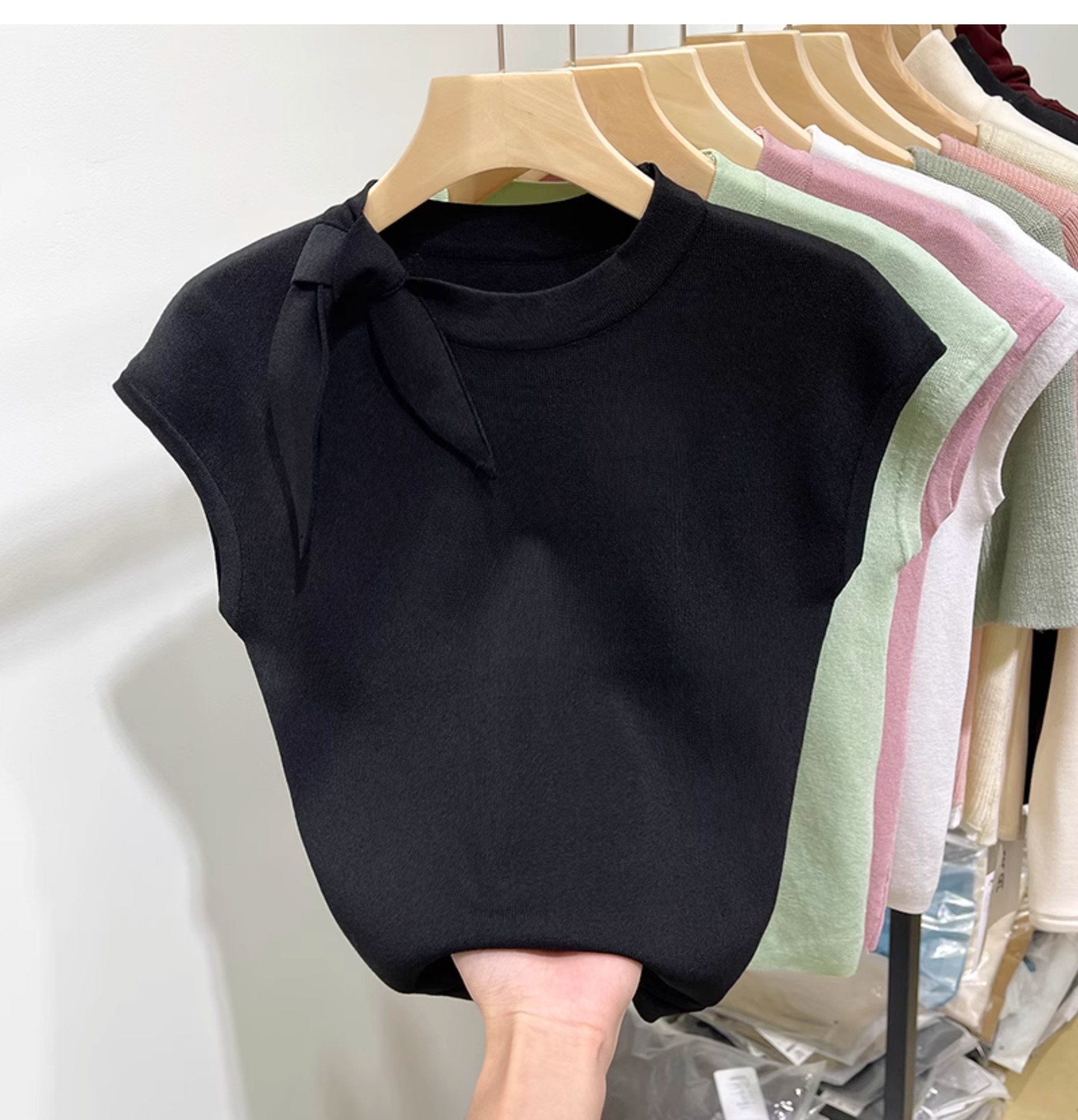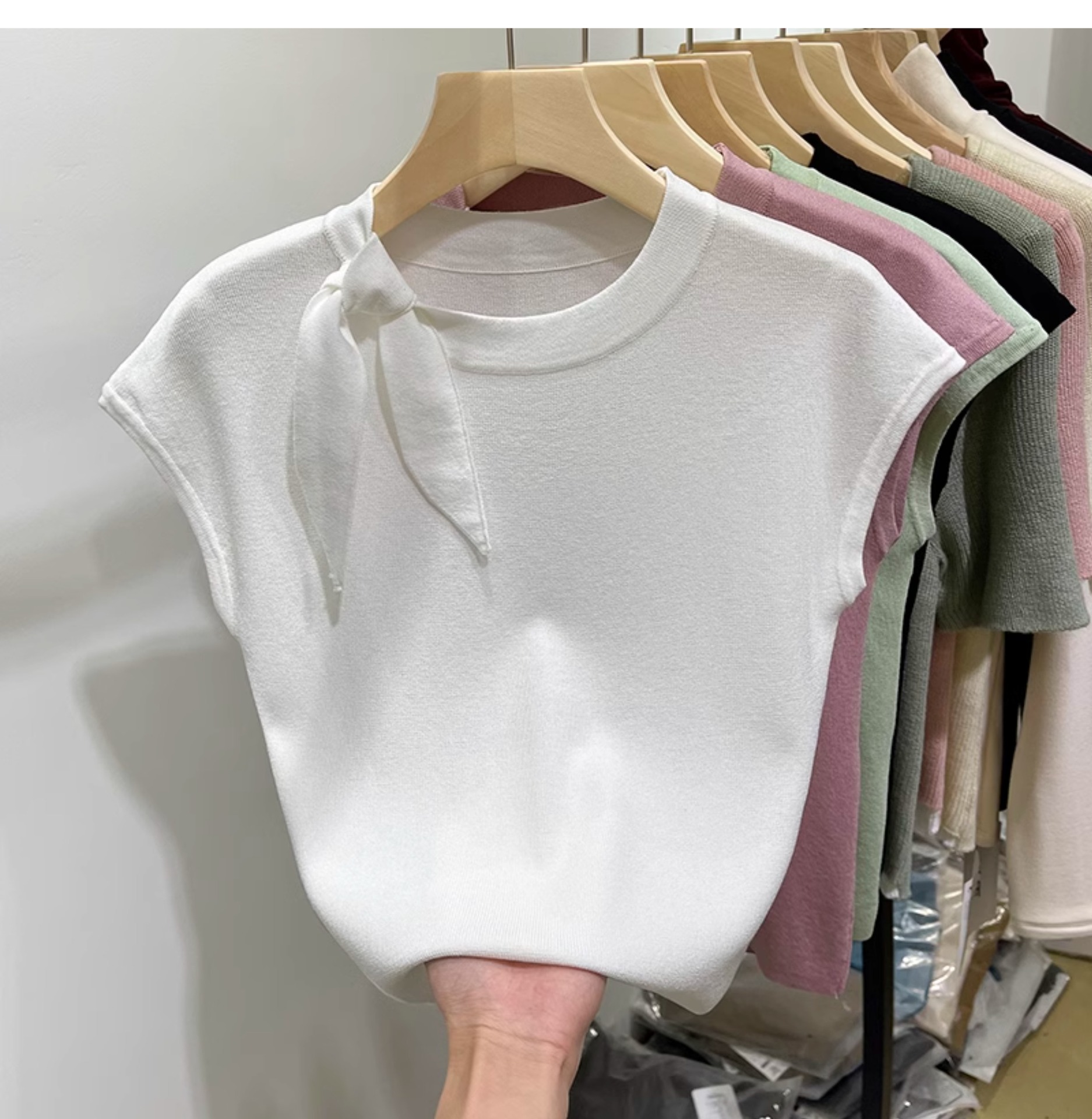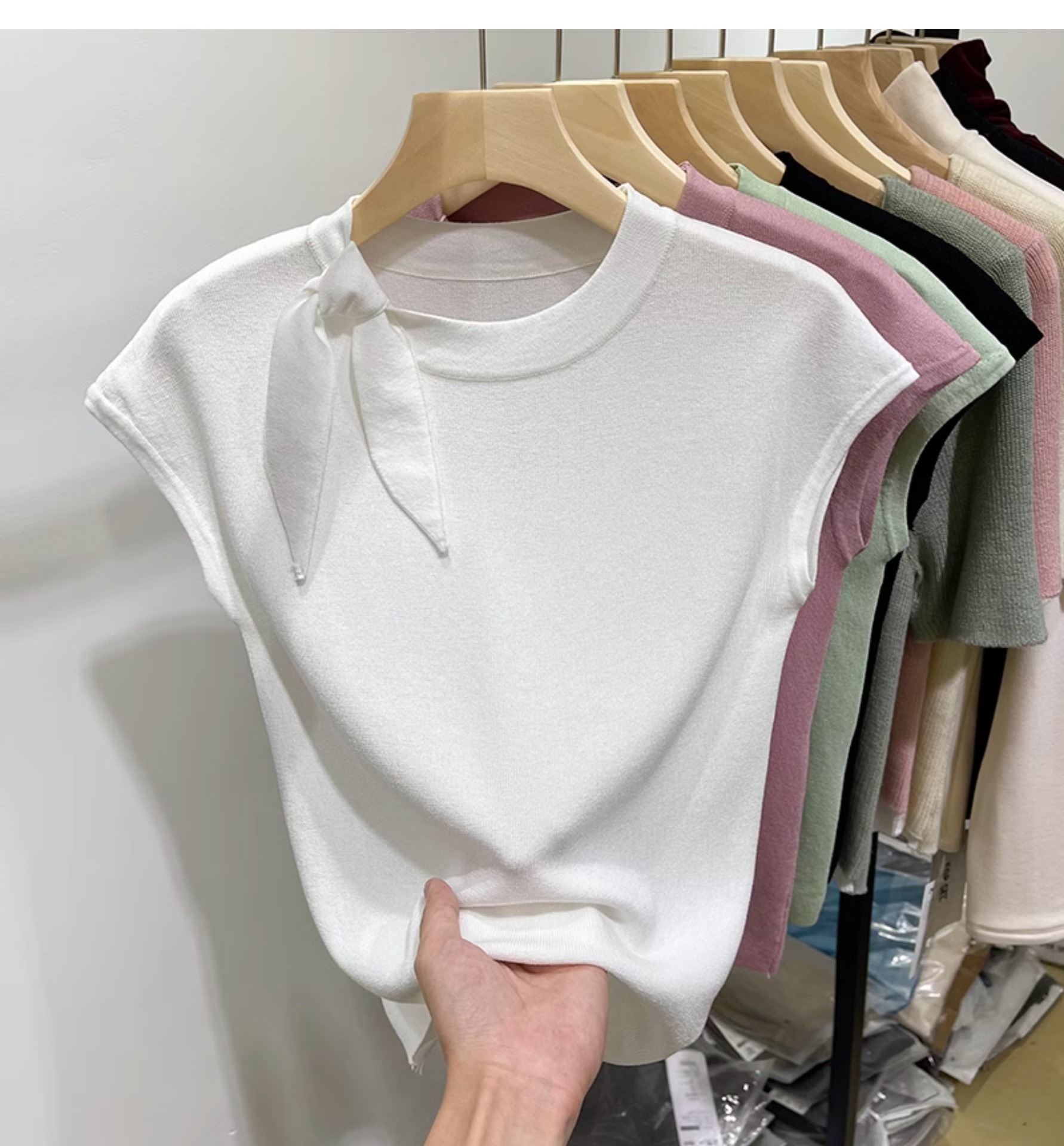스트랩 크루 넥 아이스 실크 반팔 니트 티셔츠 여성 여름 2024 새로운 슬림 핏 올 매치 플라잉 슬리브 셔츠 탑스토어 가기