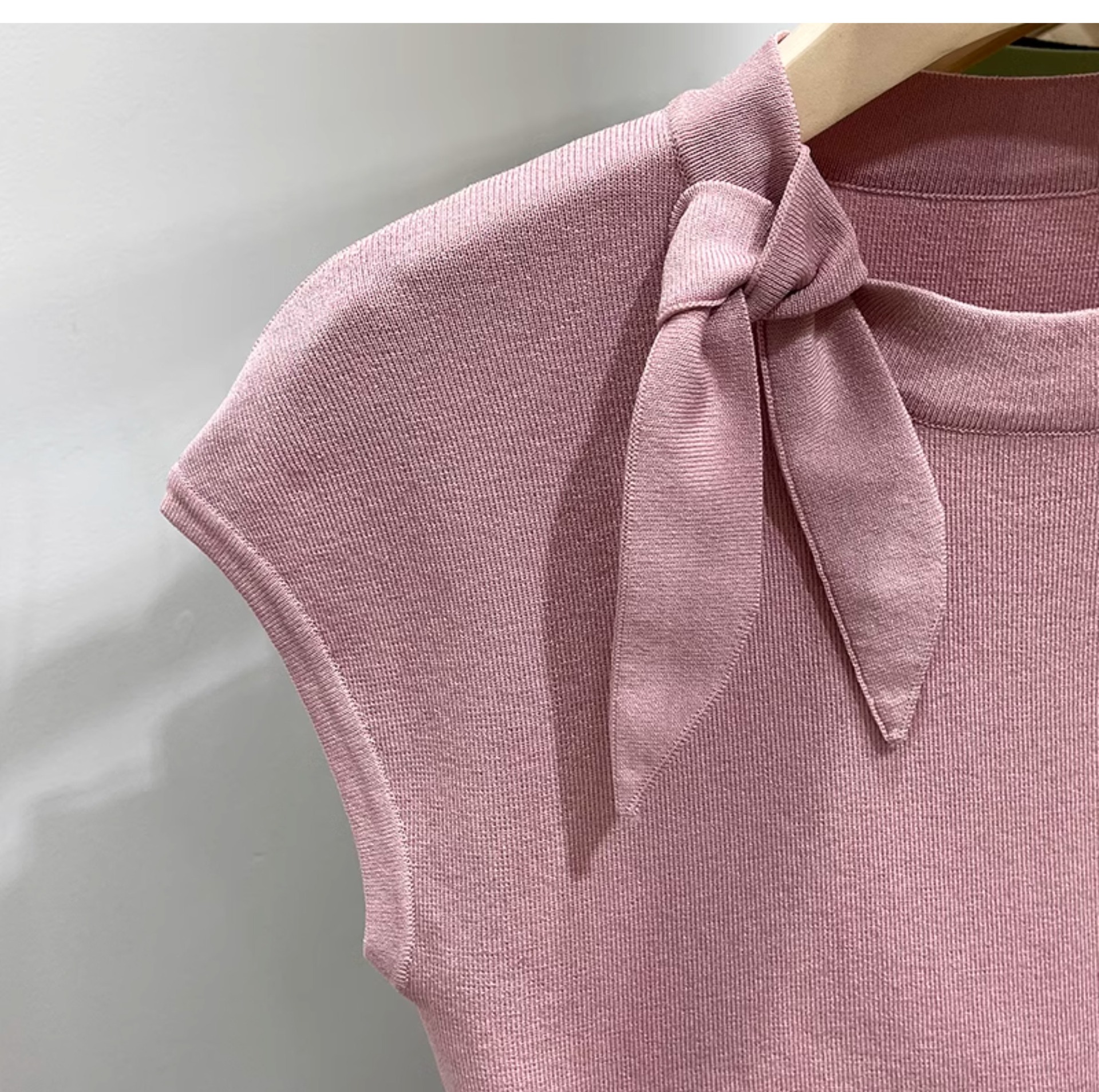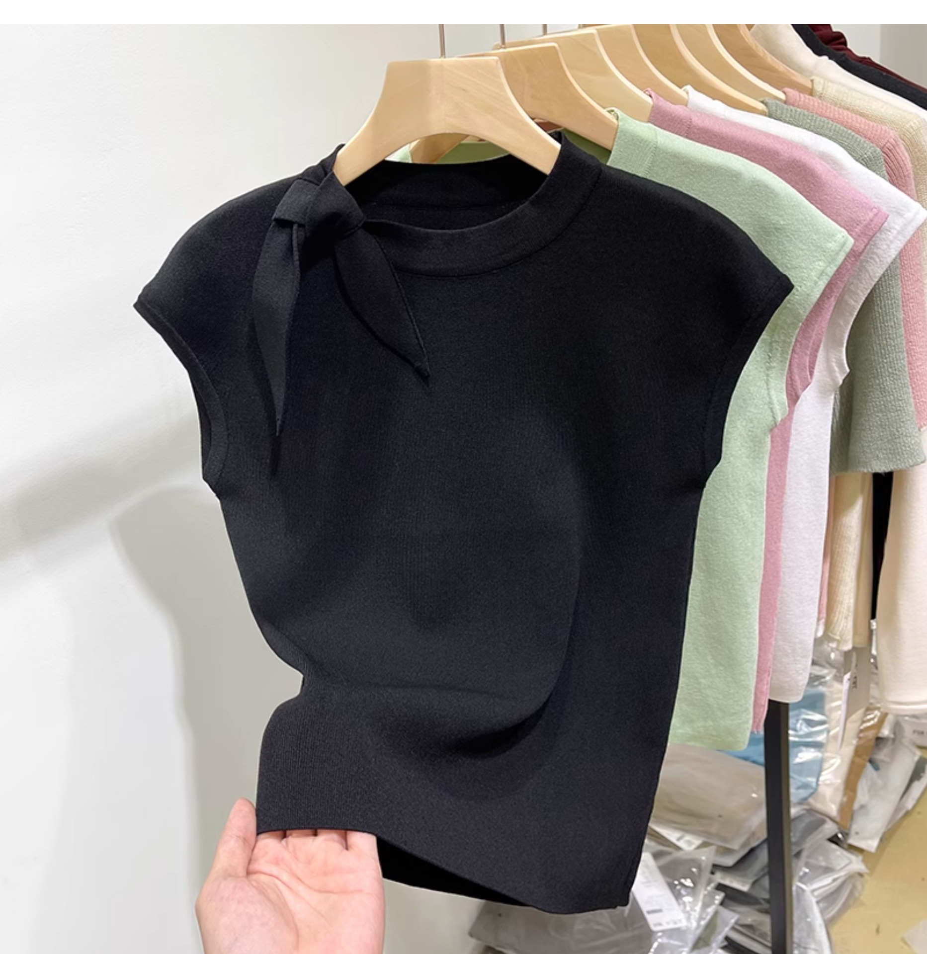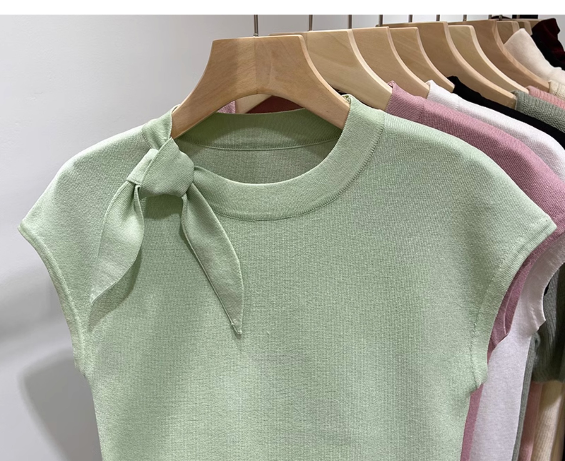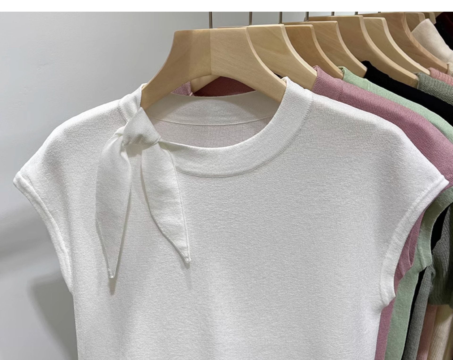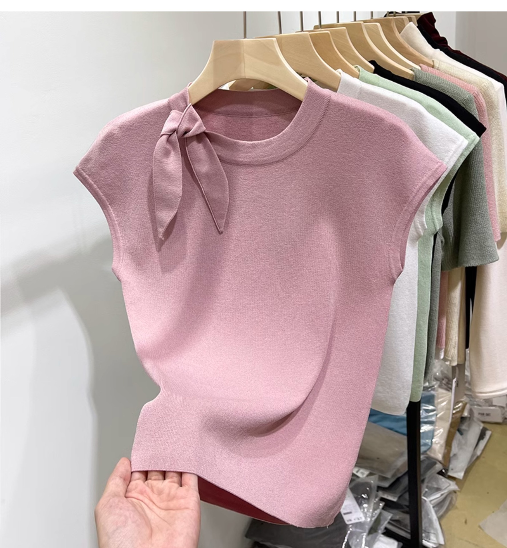 스트랩 크루 넥 아이스 실크 반팔 니트 티셔츠 여성 여름 2024 새로운 슬림 핏 올 매치 플라잉 슬리브 셔츠 탑스토어 가기
