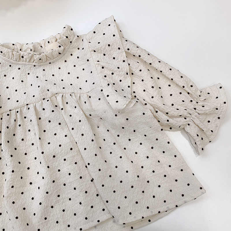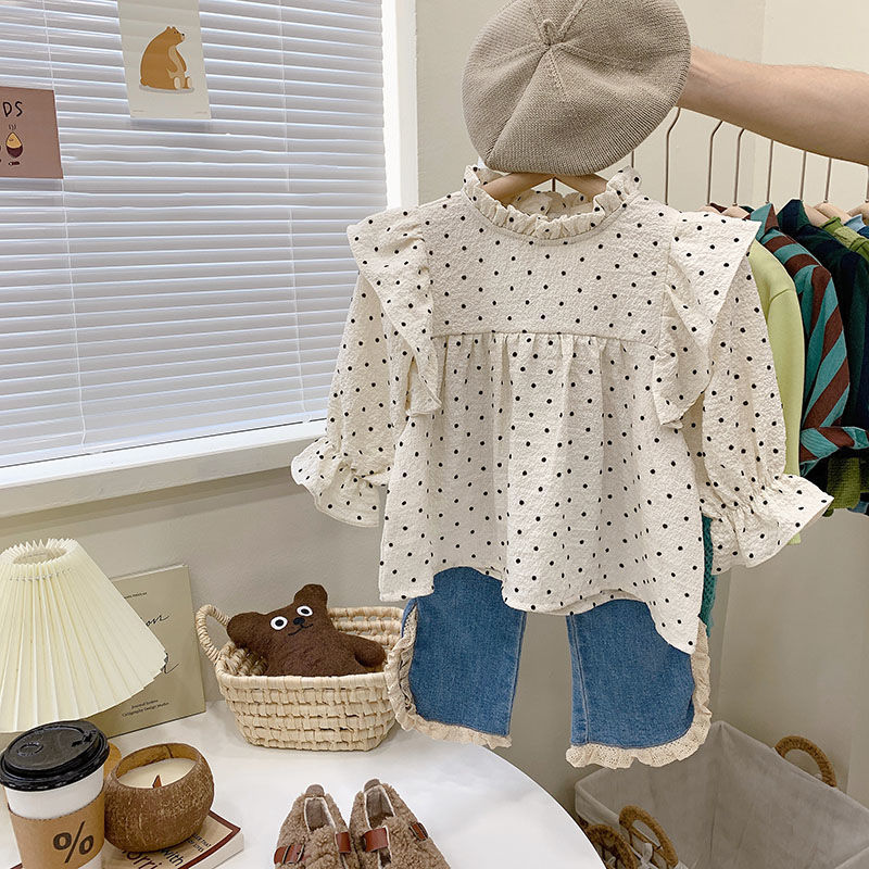 2025 새로운 한국어 아기 소녀 공주 폴카 도트 복고풍 탑 가을 아동 의류 소녀 연꽃 잎 인형 스탠드 칼라 셔츠스토어 가기