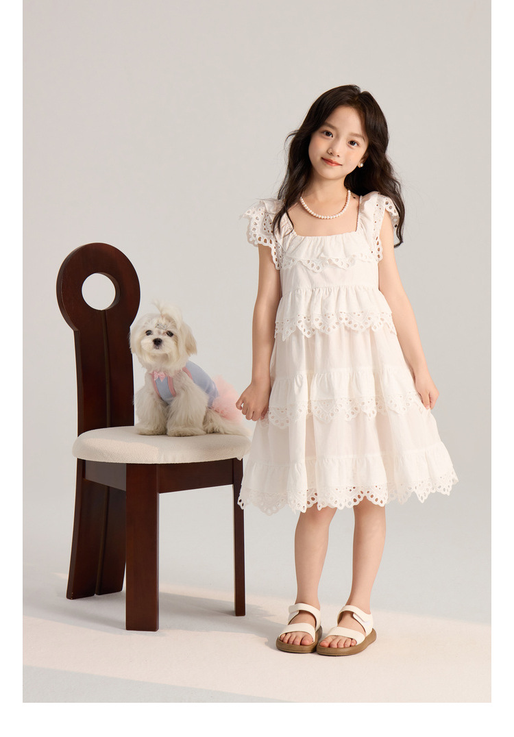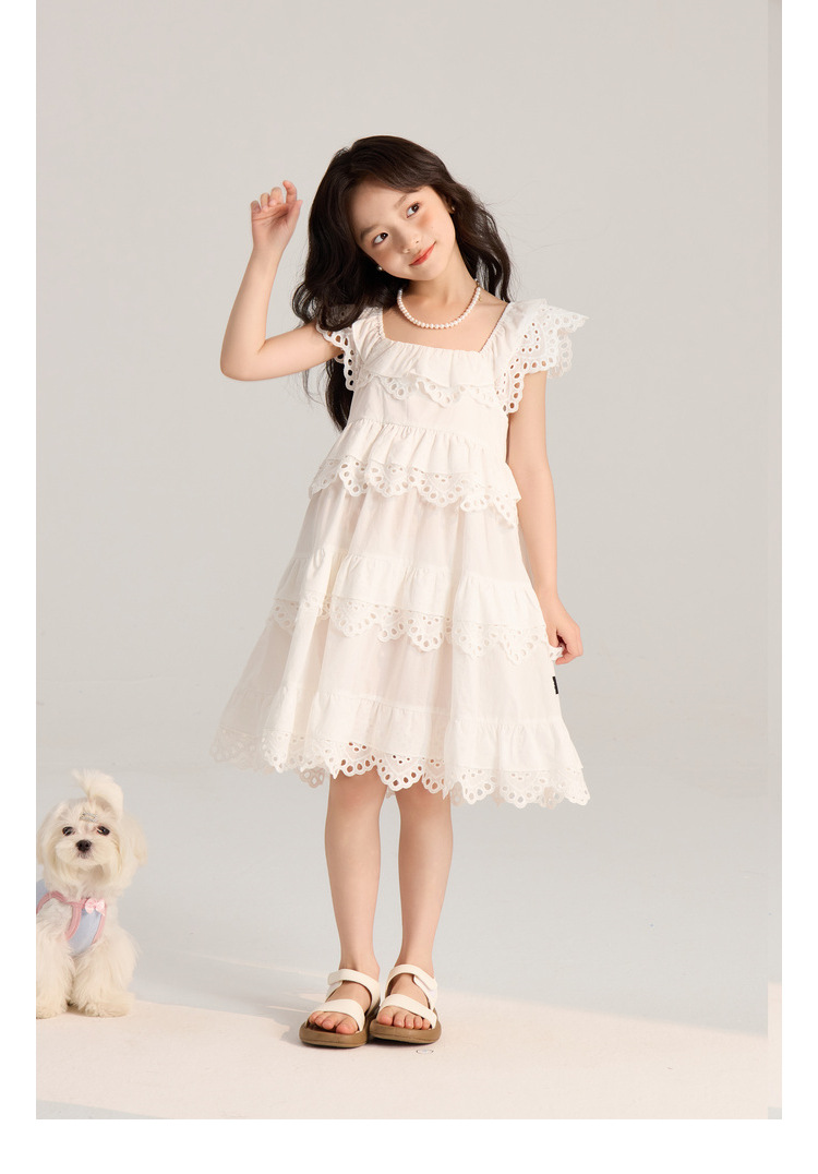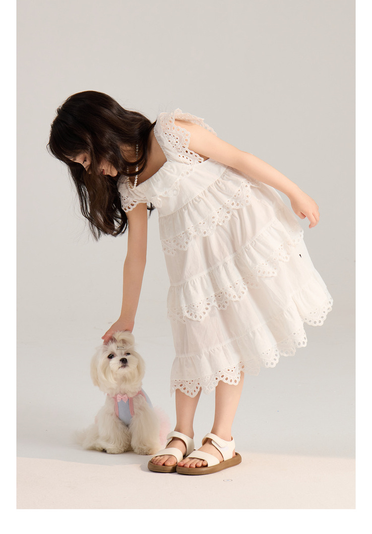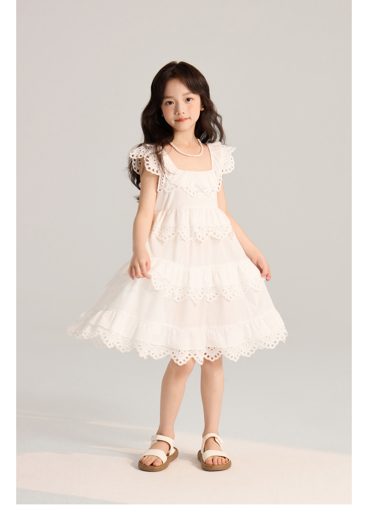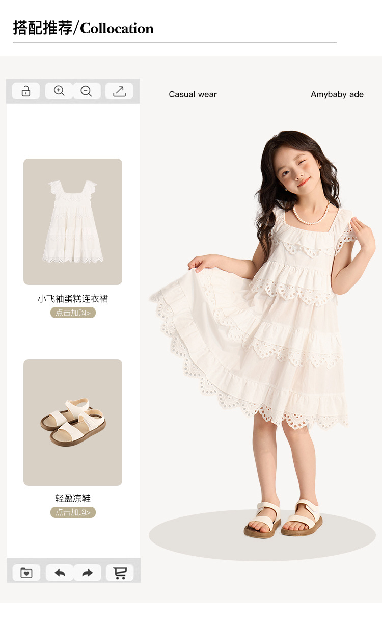 Amybaby 소녀 원피스 2024 여름 새로운 공주 원피스 웨스턴 스타일 레이스 할로우 작은 플라이 슬리브 케이크 원피스스토어 가기