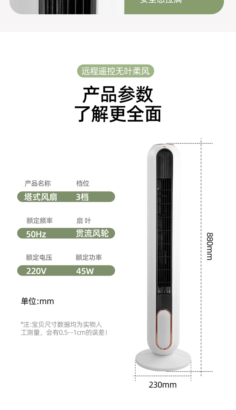 亲,塔扇的高度为880mm,底座直径为230mm,占地面积小。这款风扇的送风范围广,摇头功能可以覆盖90°,适合各种大小的房间使用,搭配空调使用清凉效果更佳哦。