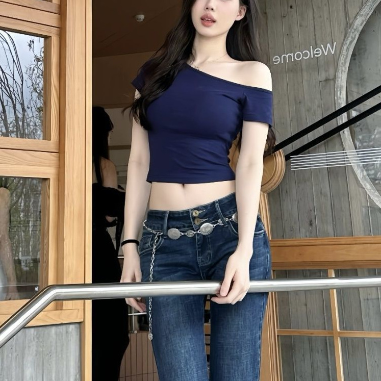 섹시한 스파이스 걸스 순수한 욕망 어깨 반팔 티셔츠 여성용 여름 새로운 우아한 슬림 핏 슬리밍 짧은 어깨 탑스토어 가기
