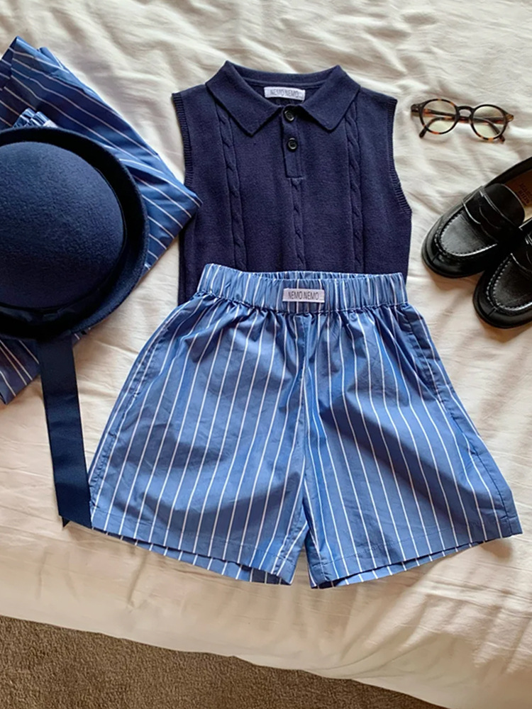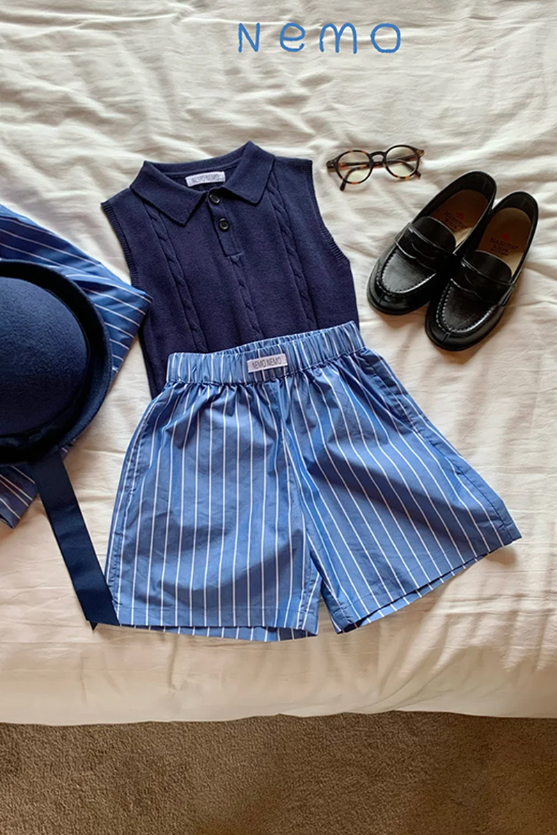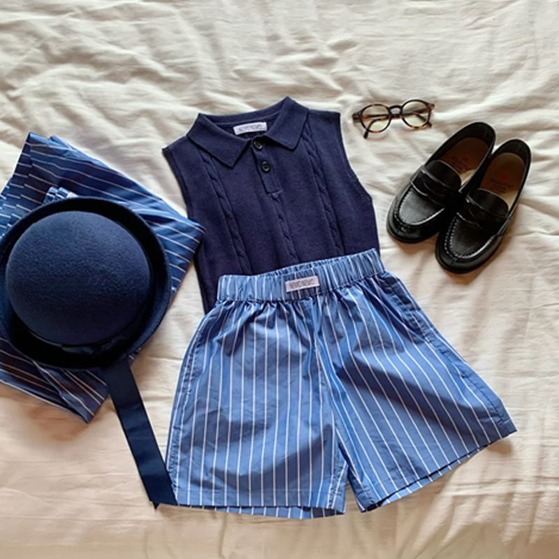 소녀 여름 세트 2024 새로운 유행 아기 소녀 민소매 니트 조끼 탑 어린이 줄무늬 반바지 유행스토어 가기