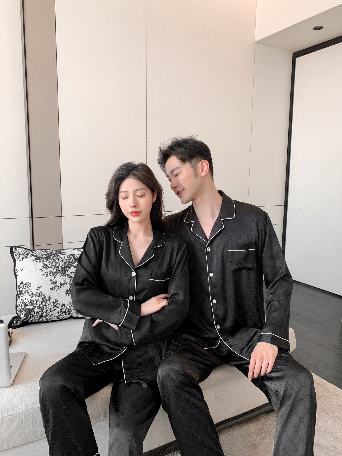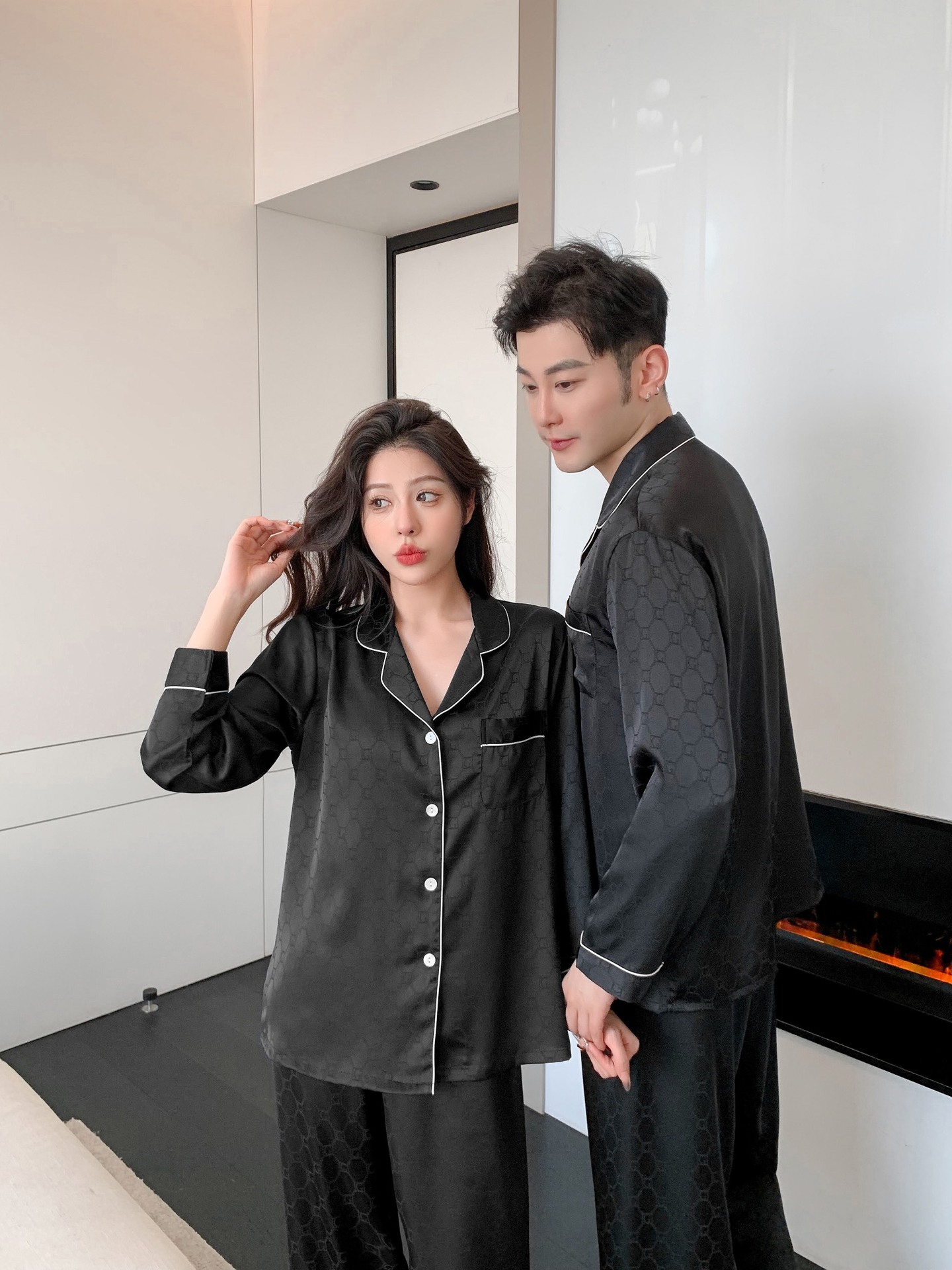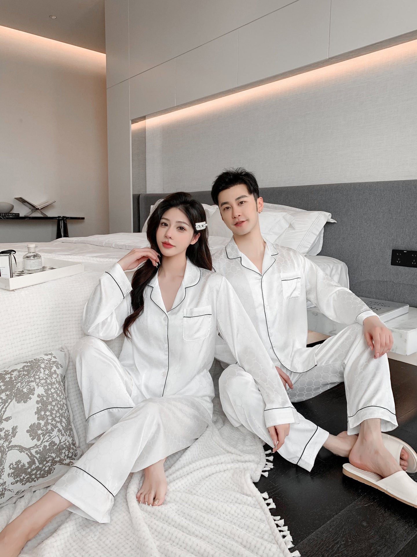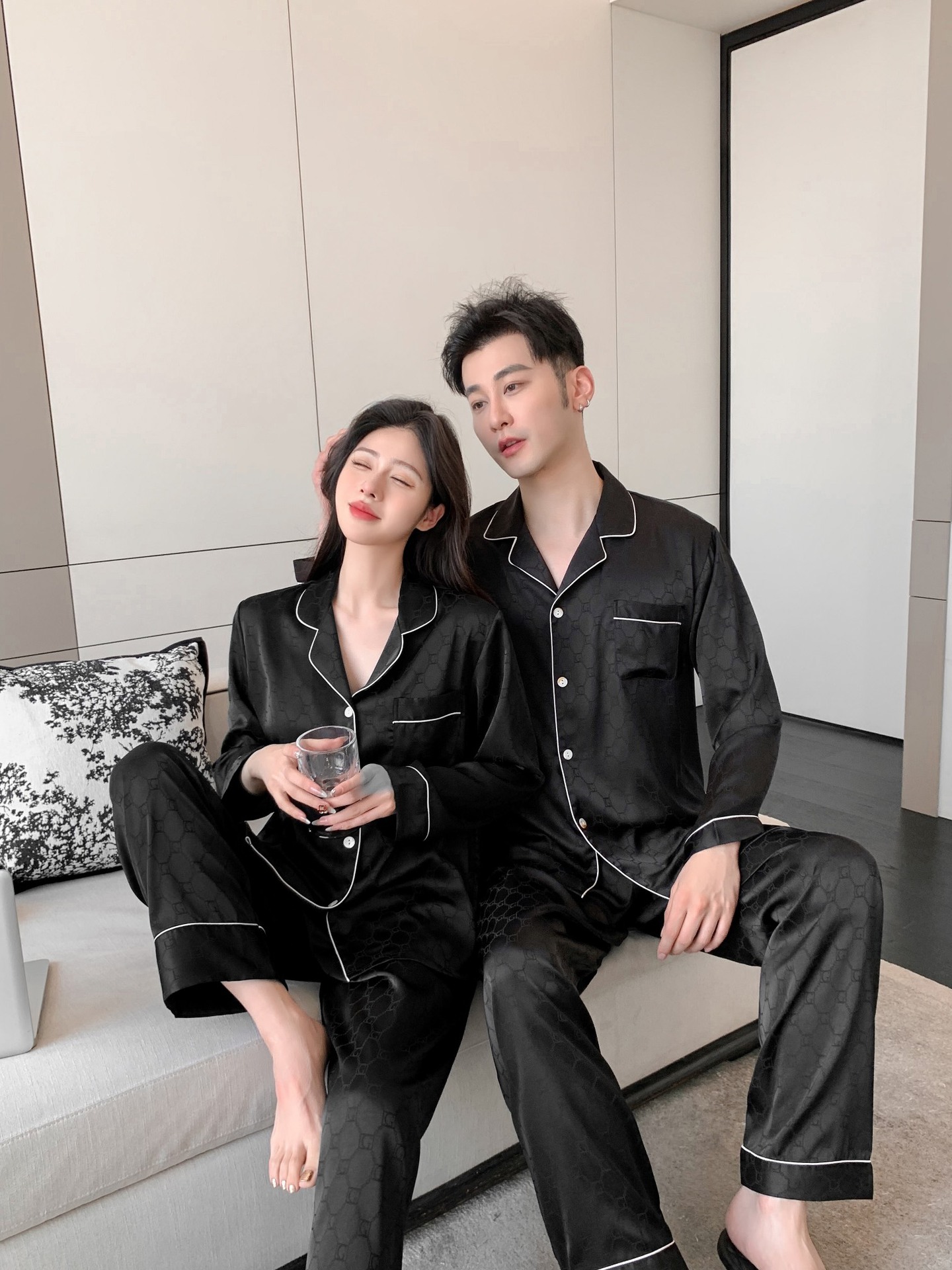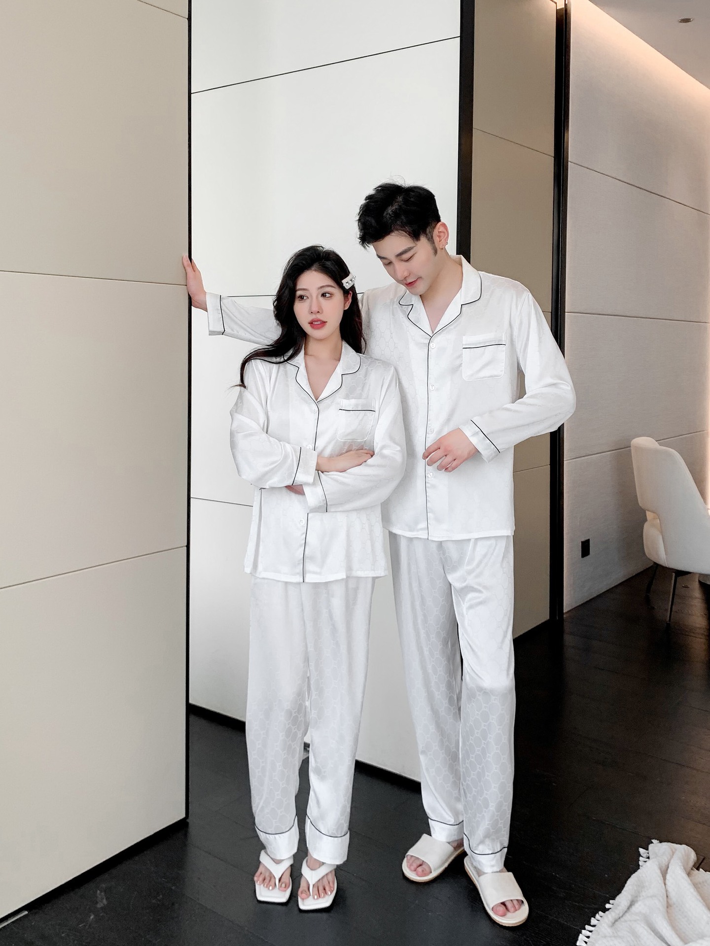 커플 잠옷 여성의 2024 새로운 여름 아이스 실크 봄과 가을 얇은 긴 소매 남성 모방 실크 홈 의류 세트