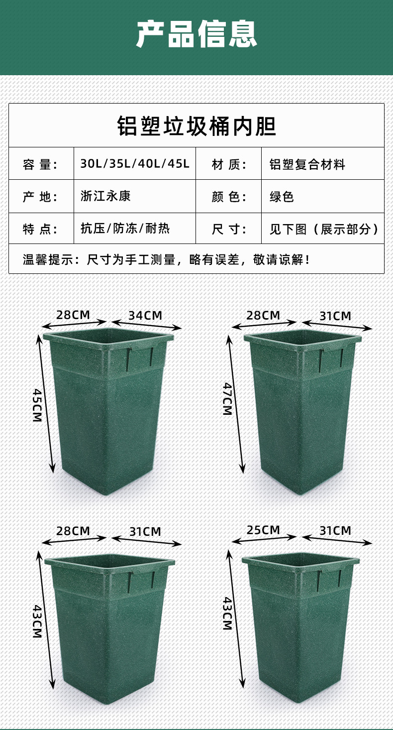 야외 쓰레기통 라이너 내부 배럴 알루미늄-플라스틱 복합 사각 껍질 상자 위생 공원 분류 튜브 야외 신제품