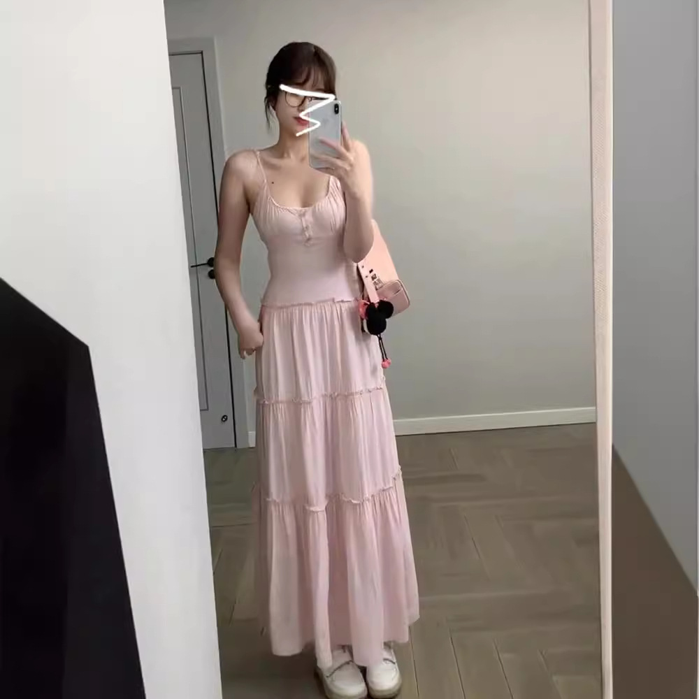부드러운 스타일 핑크 슬립 원피스 원피스 여성 여름 새로운 달콤한 허리 슬리밍 A-라인 원피스 우아한 긴 원피스