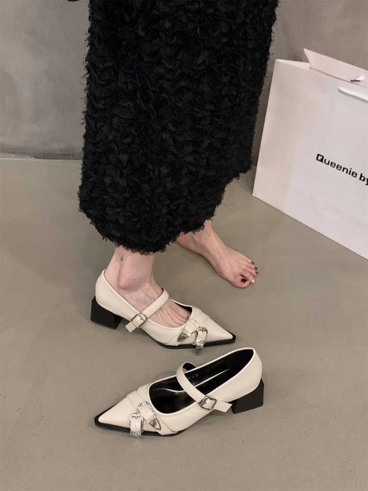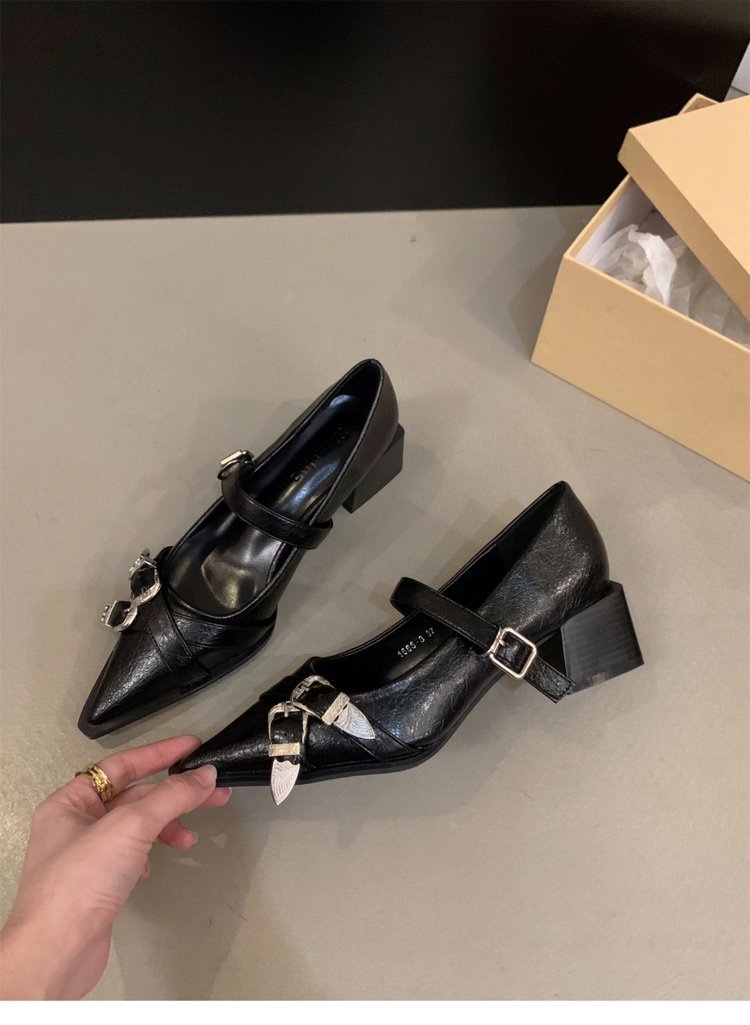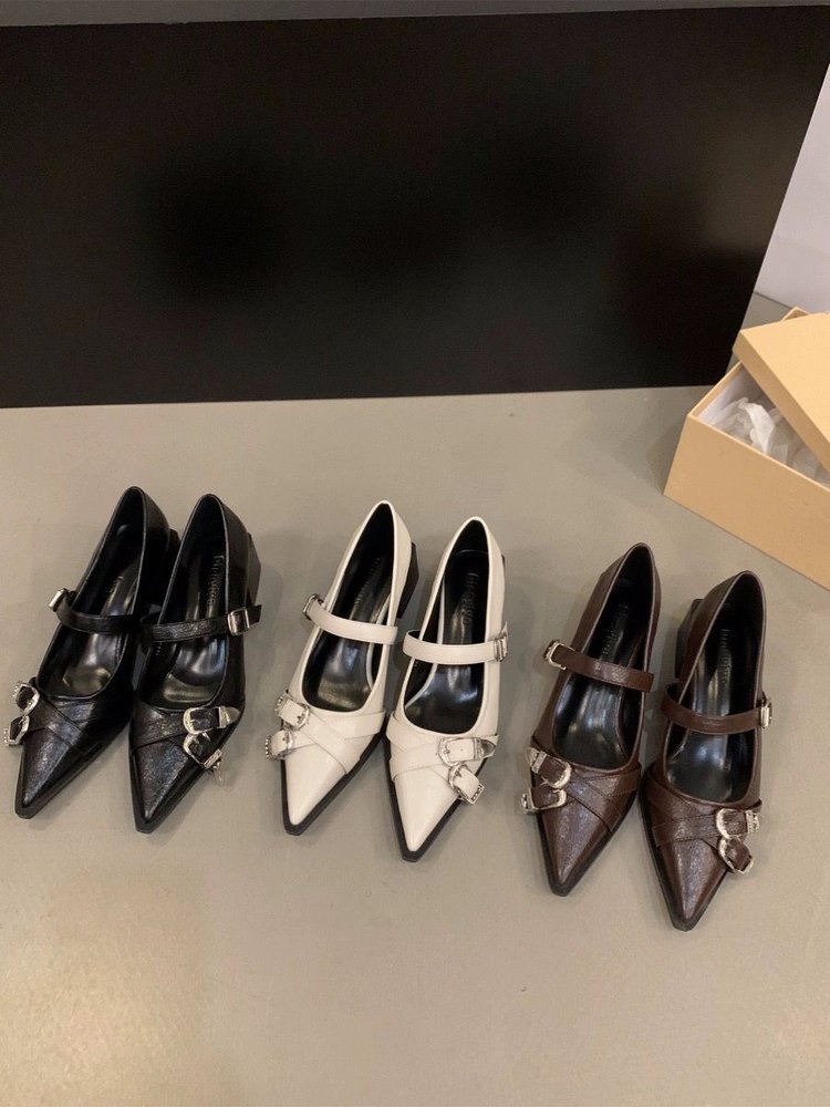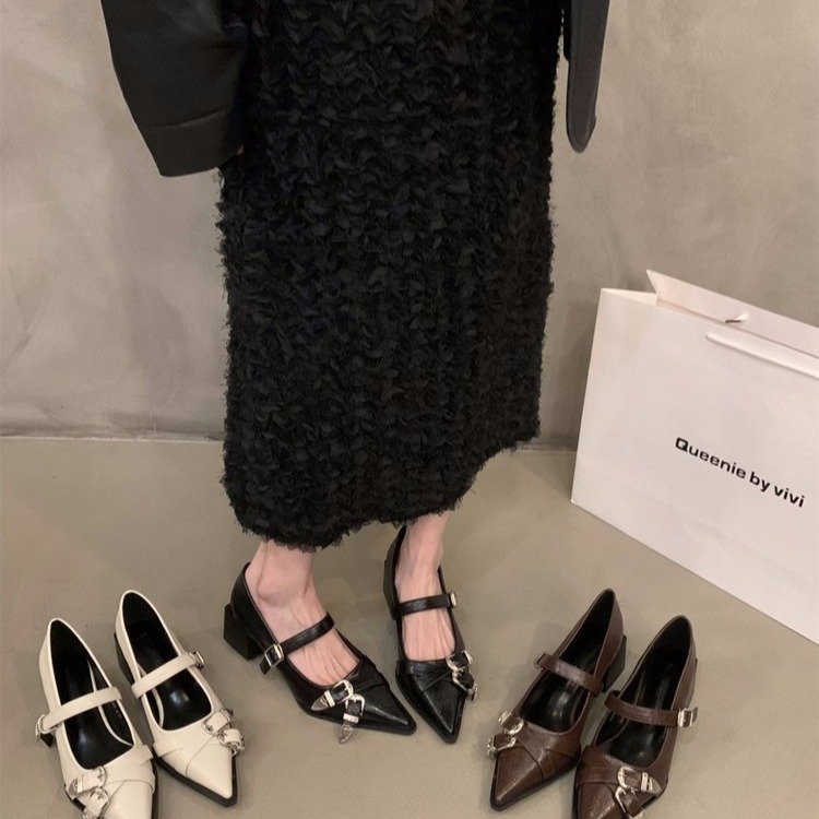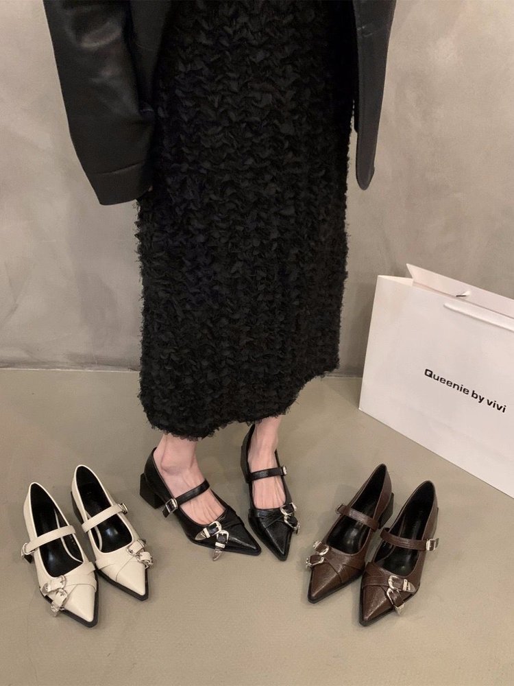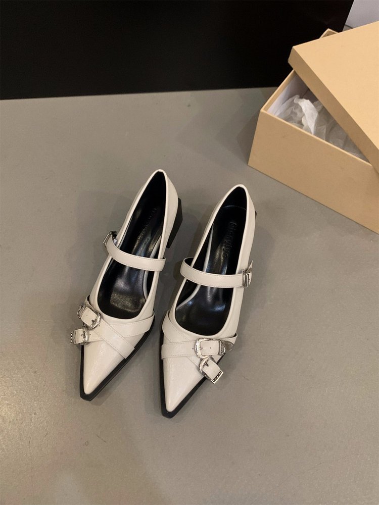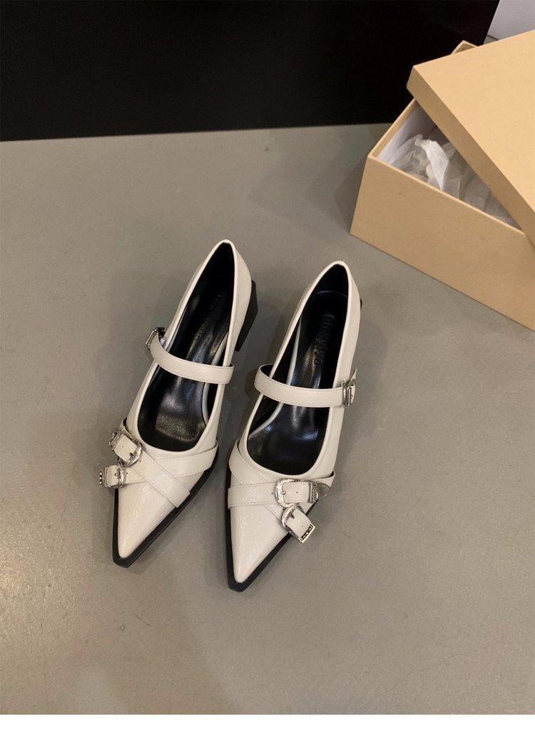 프랑스 레트로 크로스 벨트 버클 메리 제인 신발 2024 이른 봄 뾰족한 얕은 세련된 패션 우아한 싱글 신발스토어 가기
