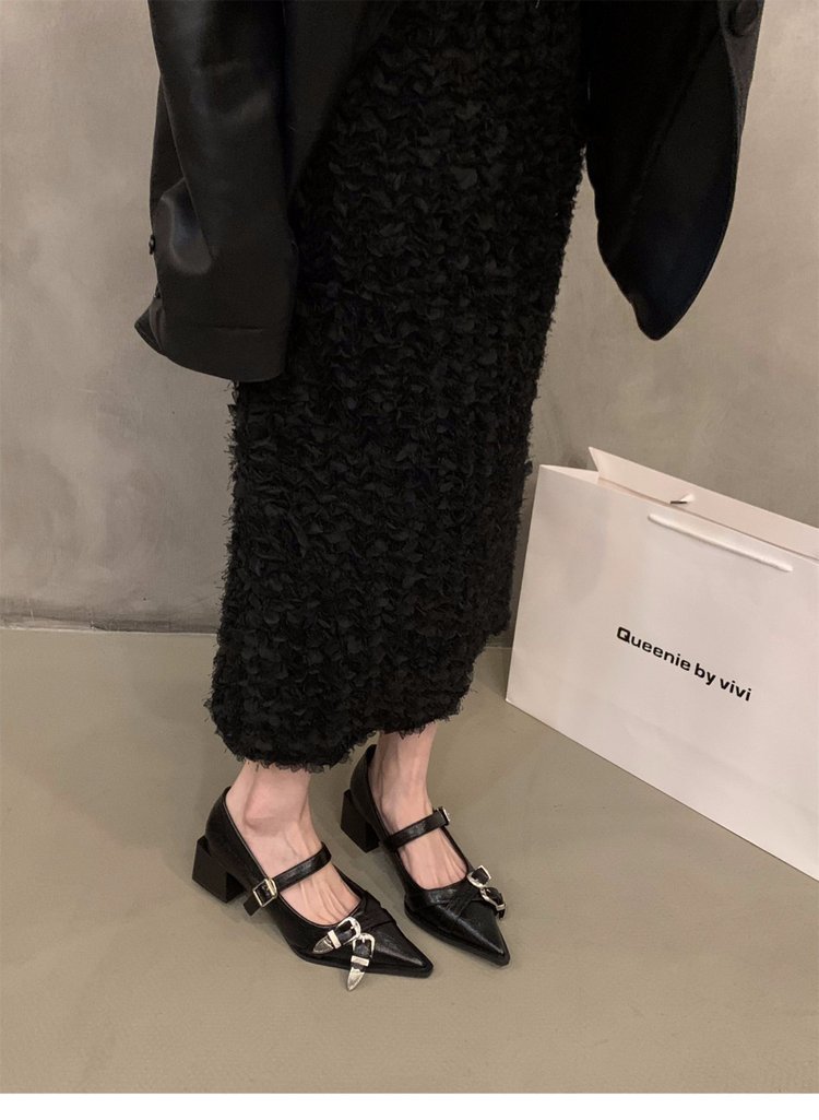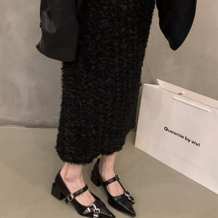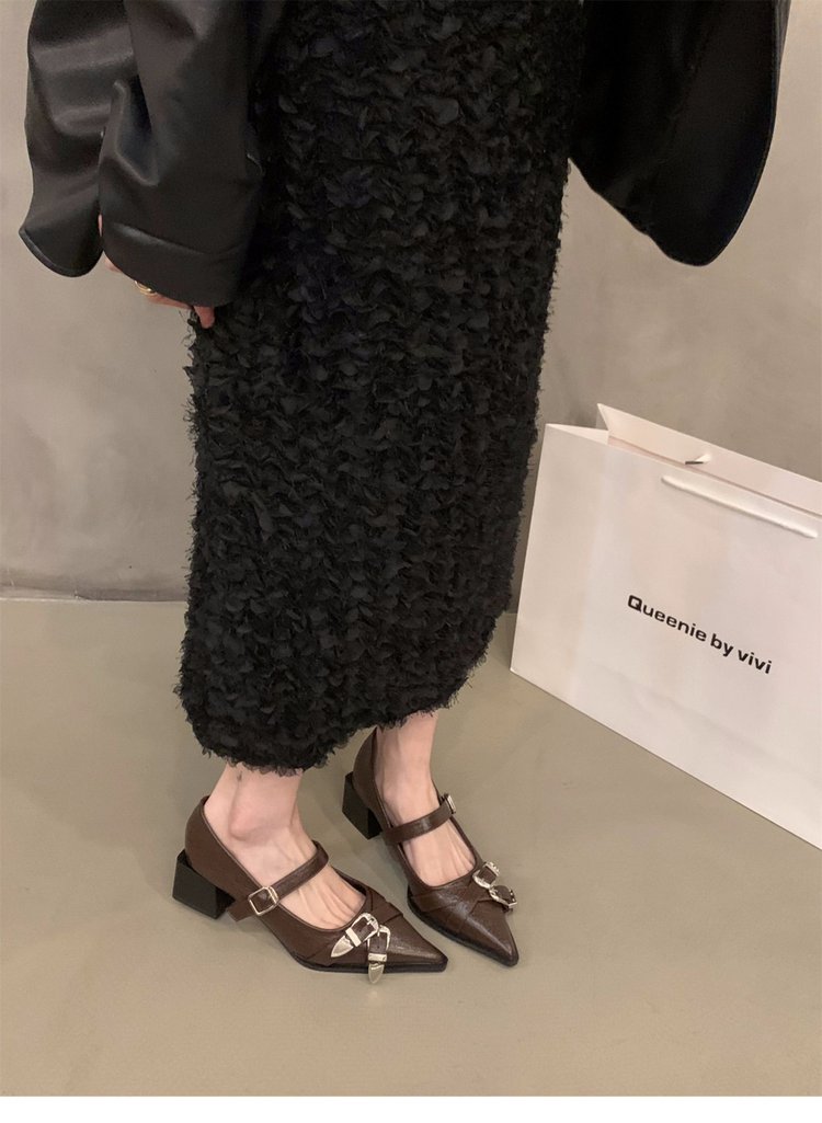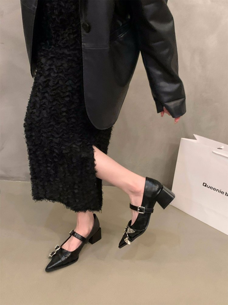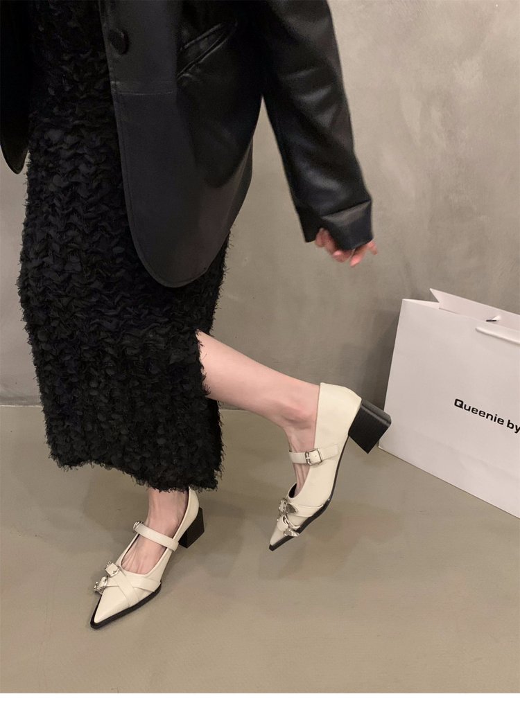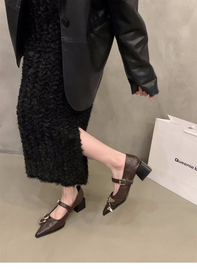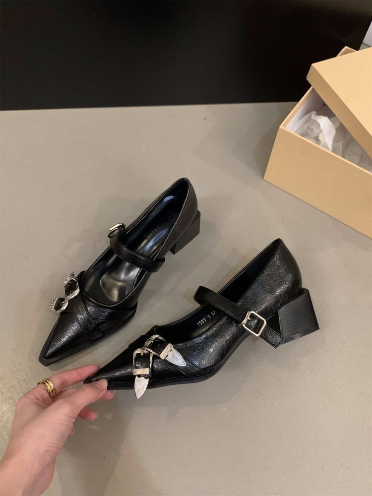 프랑스 레트로 크로스 벨트 버클 메리 제인 신발 2024 이른 봄 뾰족한 얕은 세련된 패션 우아한 싱글 신발스토어 가기