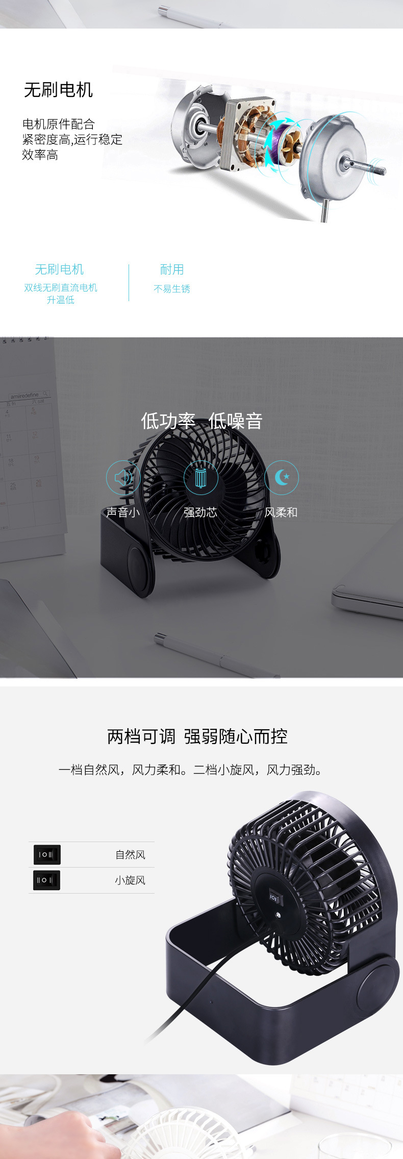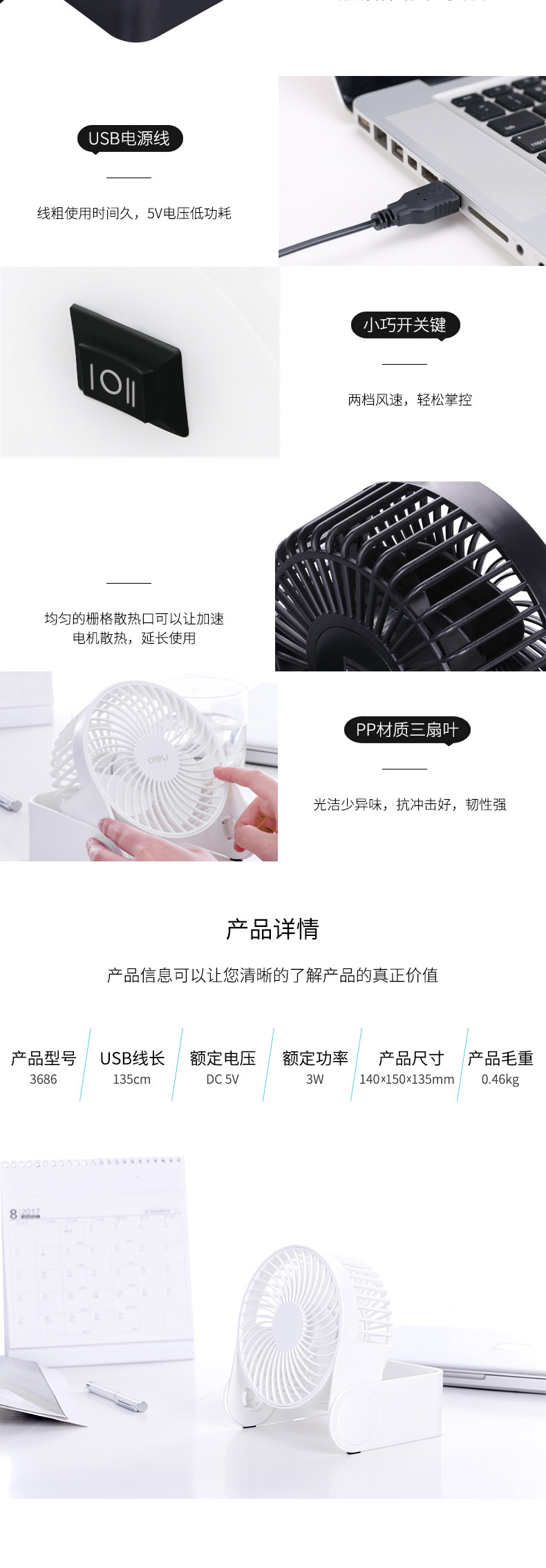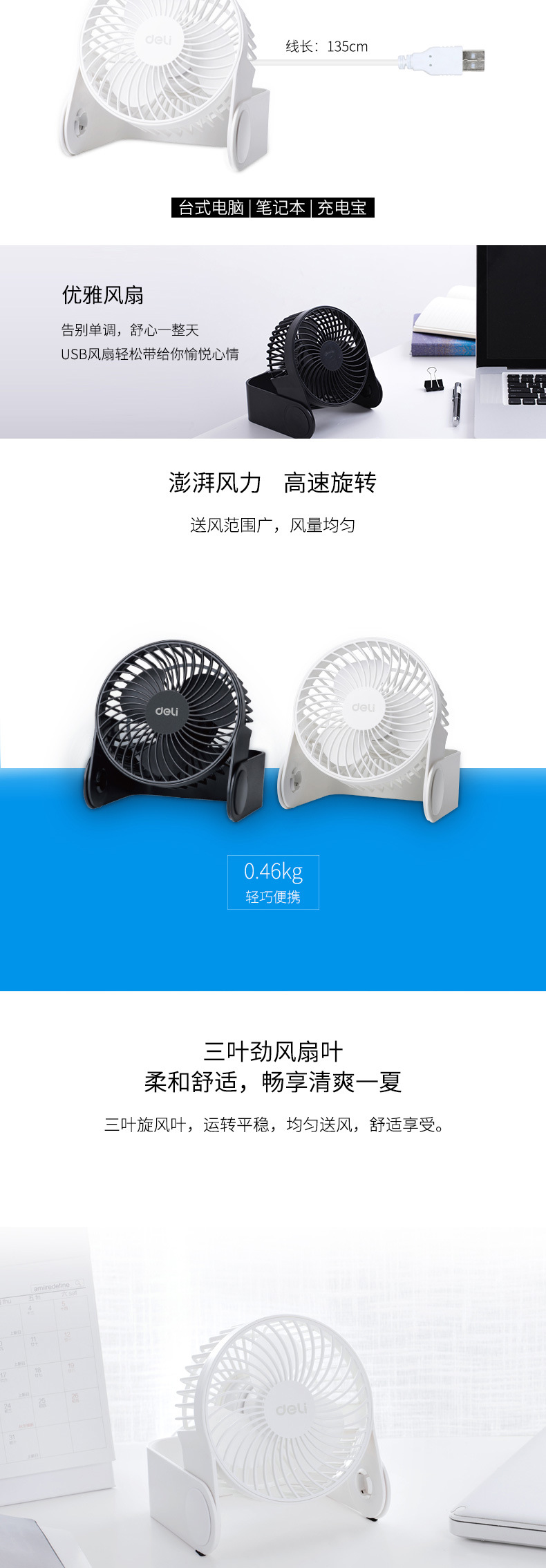 델리 USB 작은 팬 휴대용 수직 사무실 저소음 데스크탑 학생 기숙사 탁상용 팬 3 잎 팬
