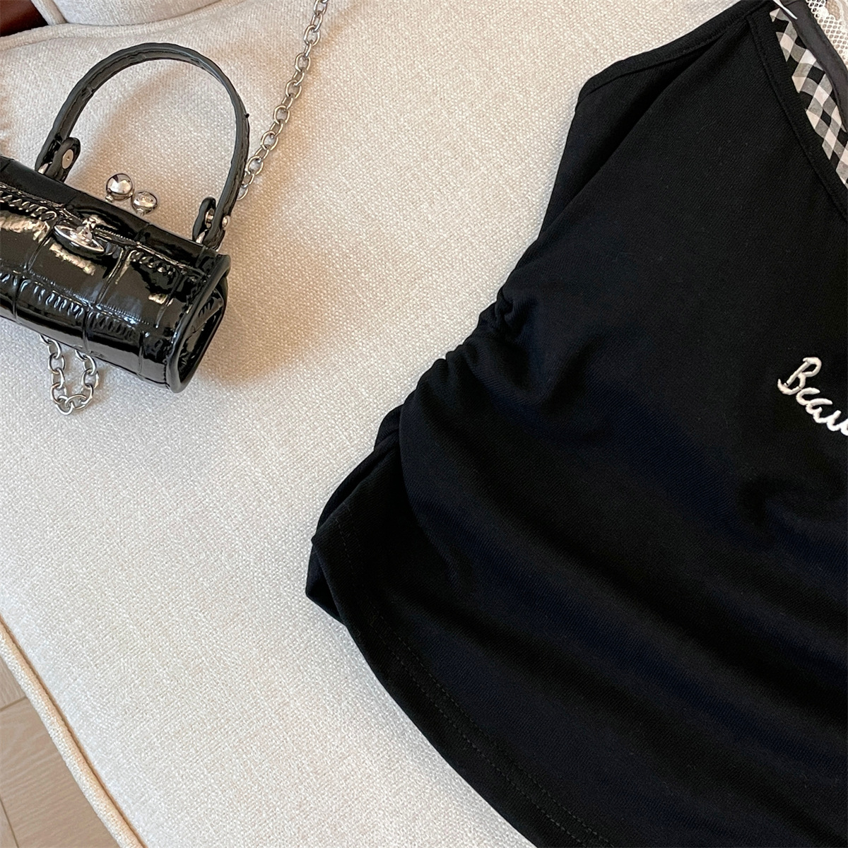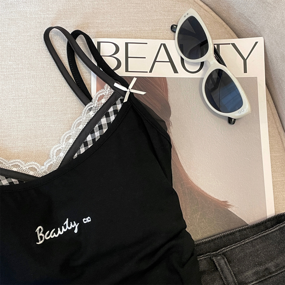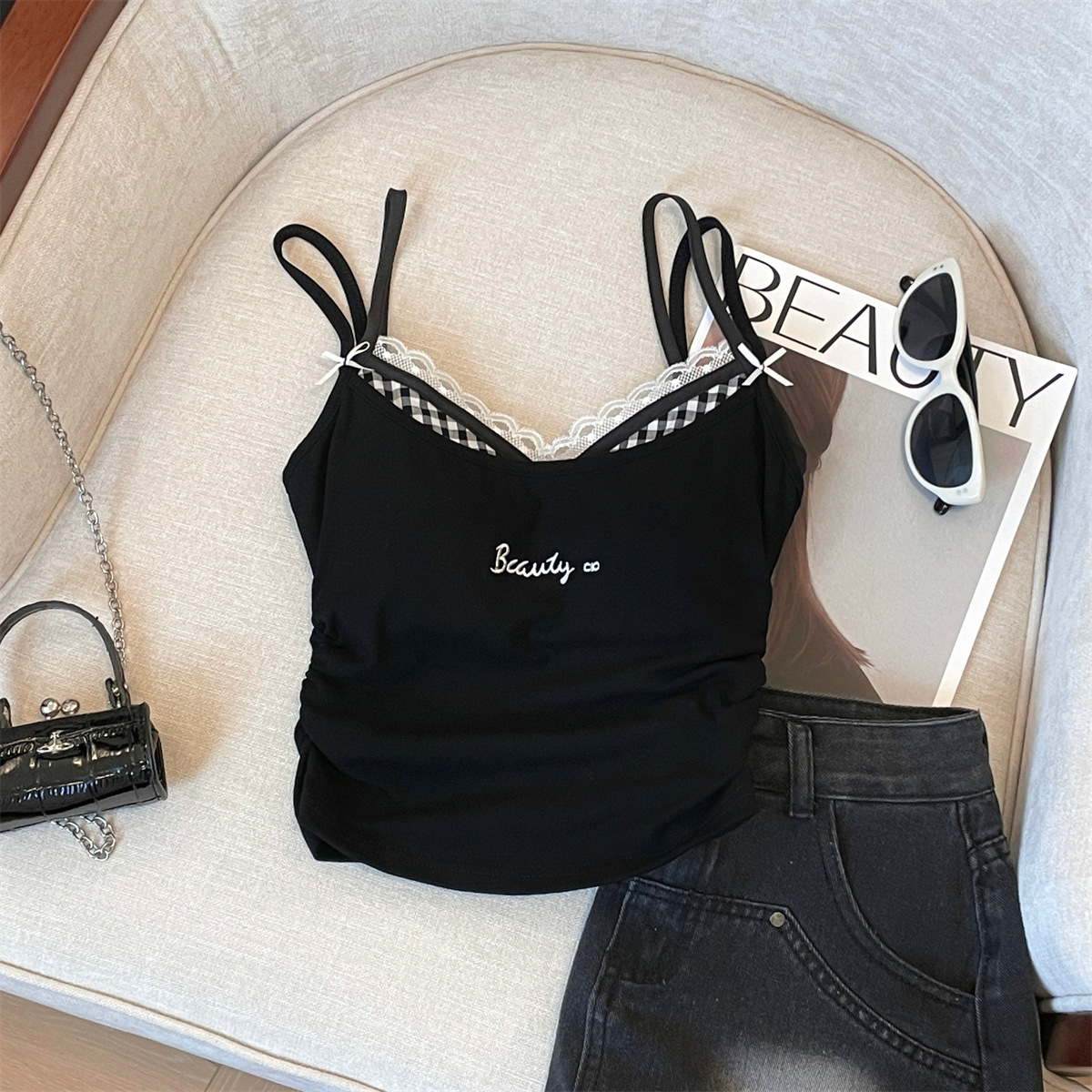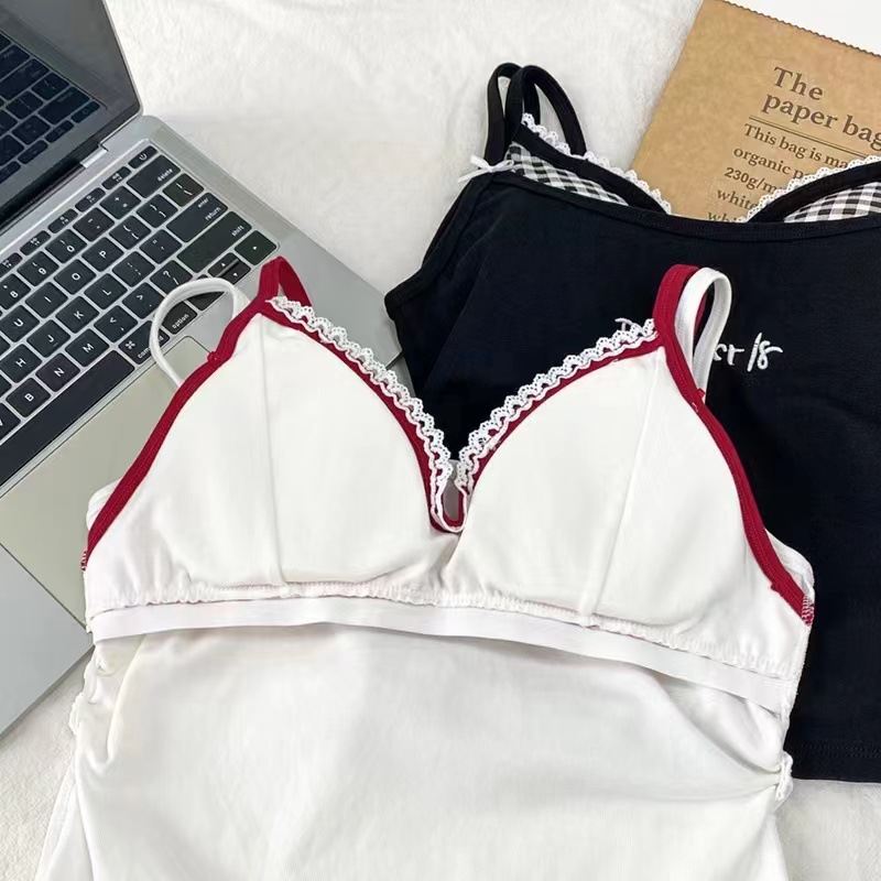 미국식 순수한 욕망 투피스 격자 무늬 카미솔 여성용 자수 레이스 이너 탑 핫 스타일
