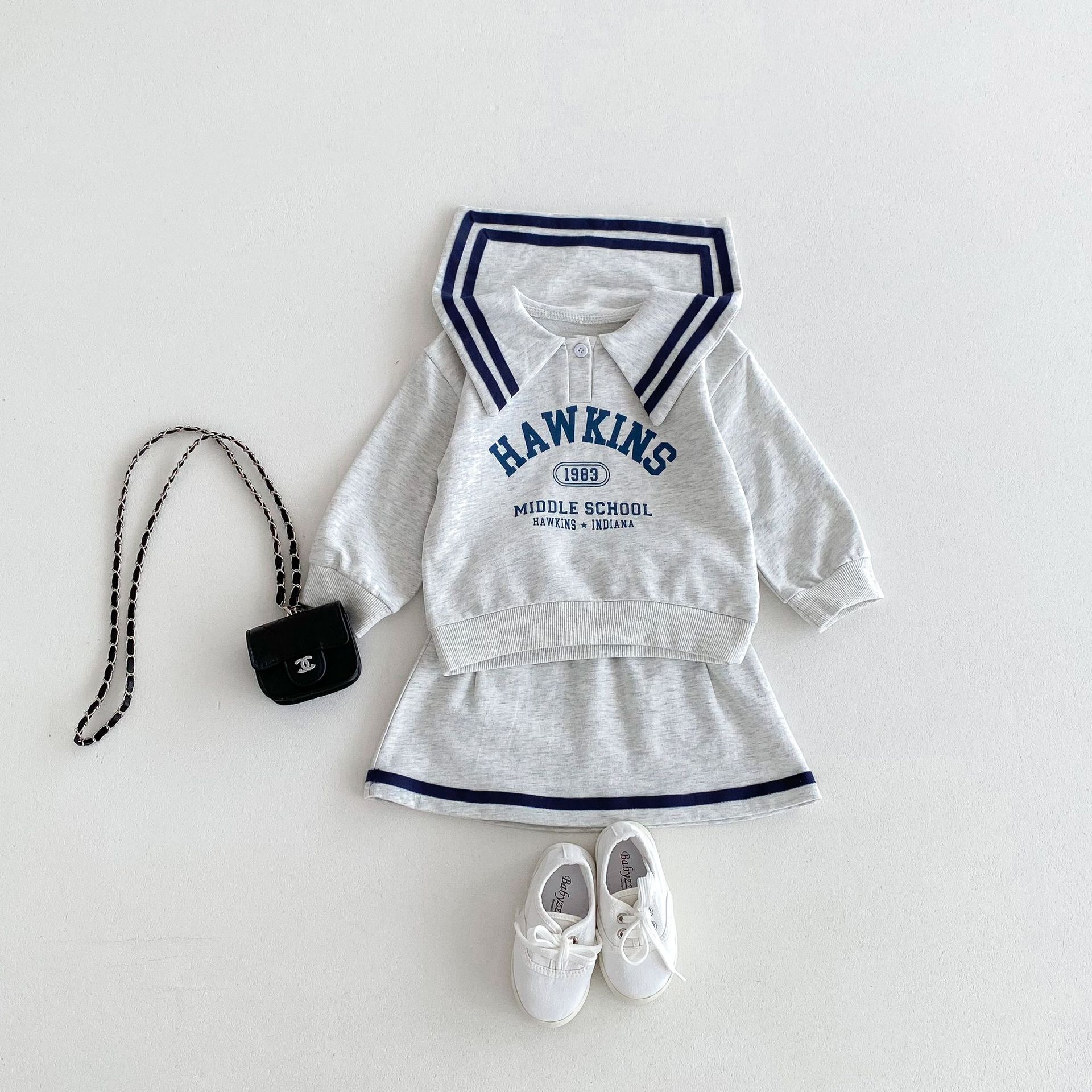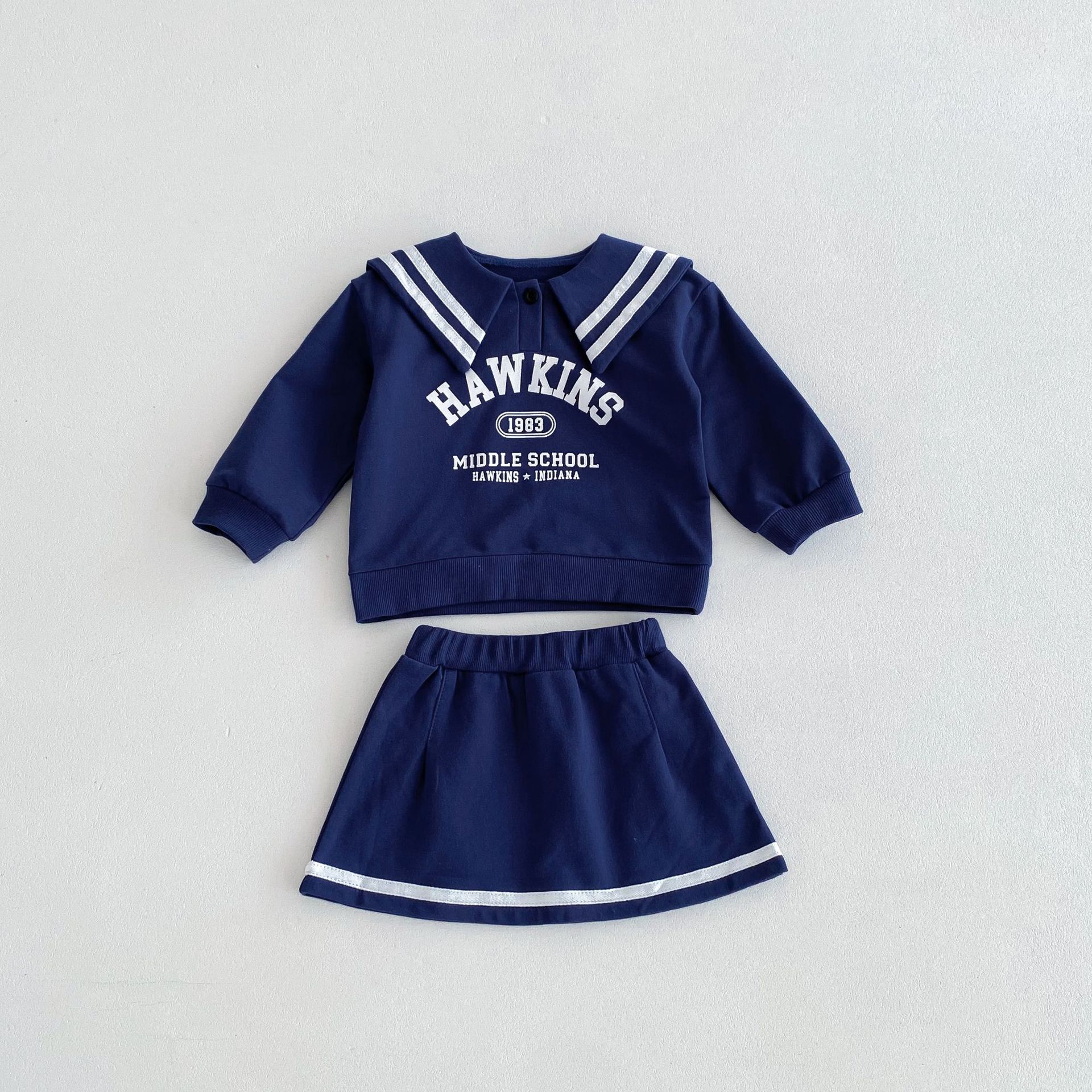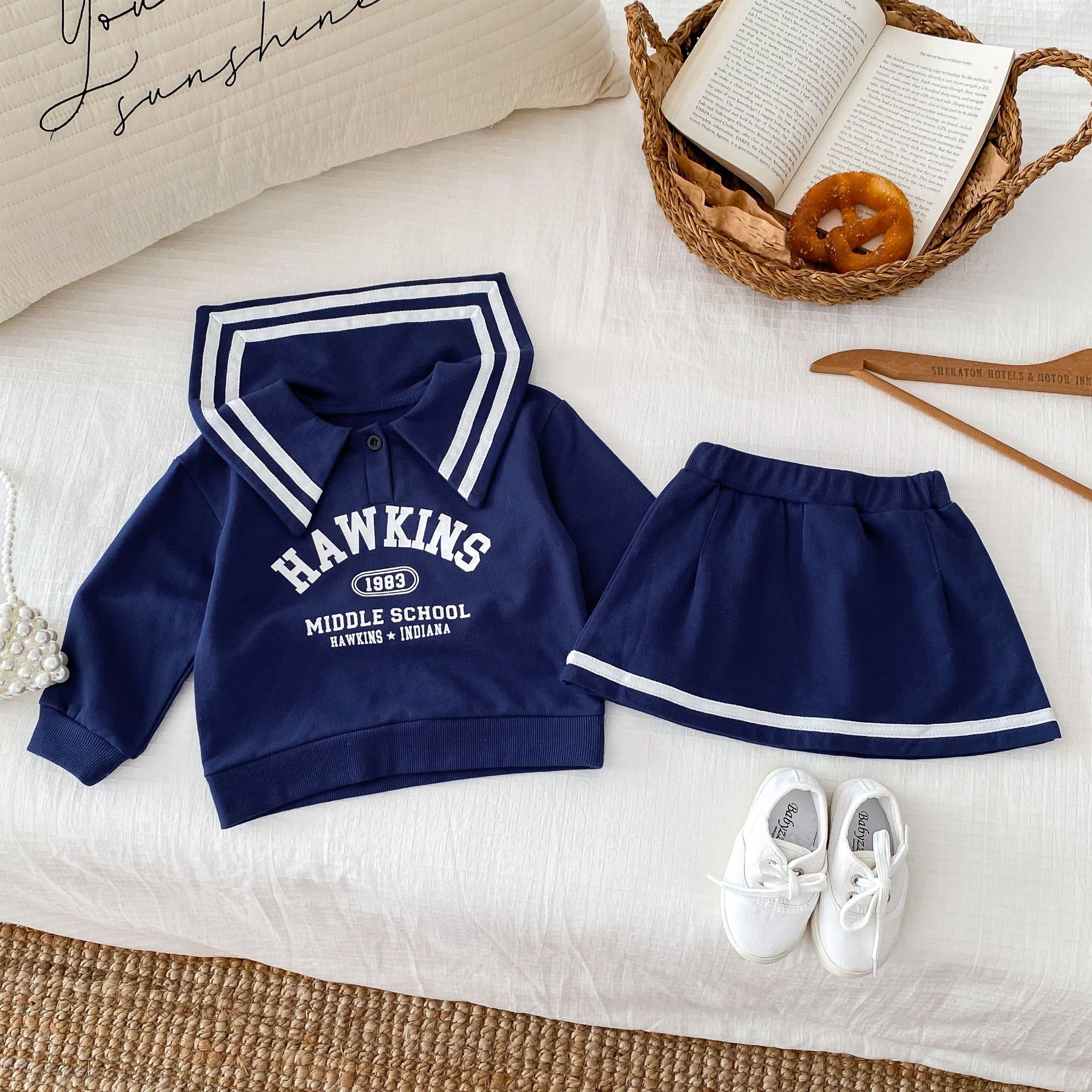 2024 년 가을 새 어린이 한식 아동복 면 옷깃 편지 줄무늬 여자 해군 목걸이 세트스토어 가기