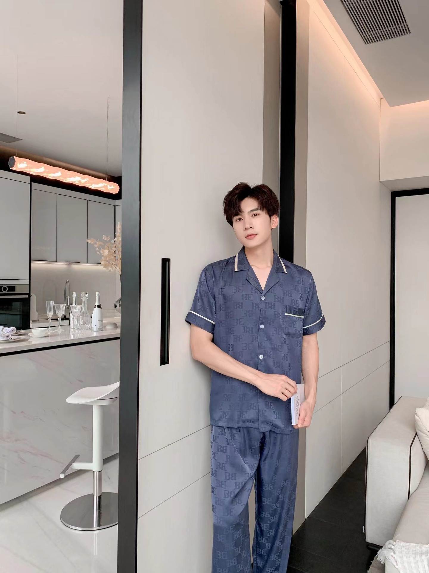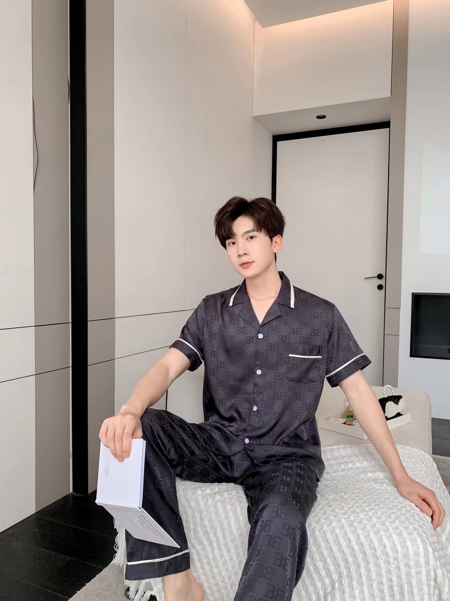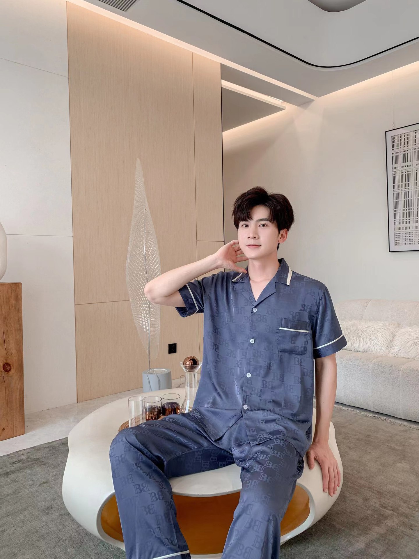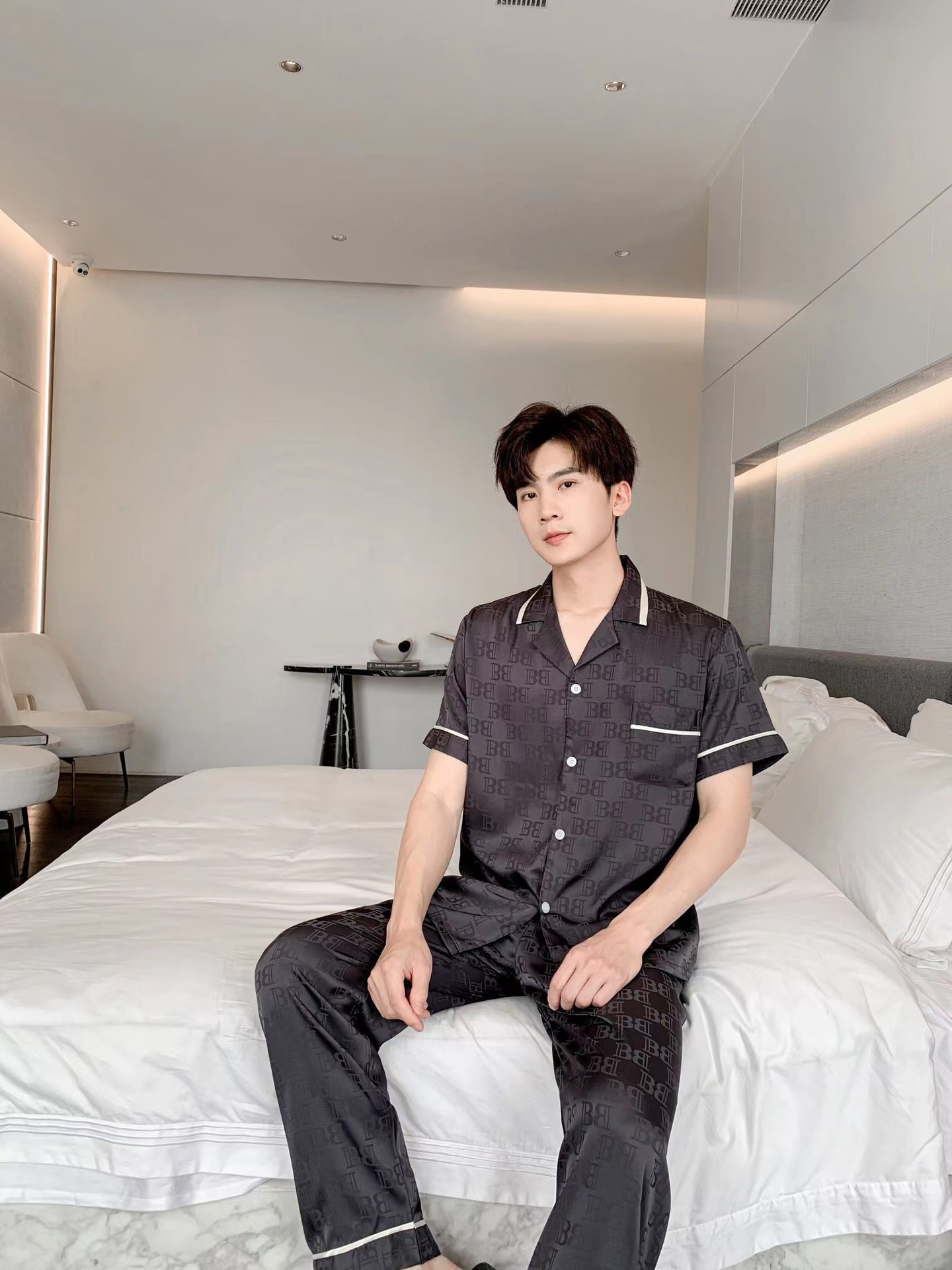 남자 아이스 실크 파자마 봄과 가을 새로운 남자 한국식 하이 엔드 여름 홈 착용 반팔 바지스토어 가기