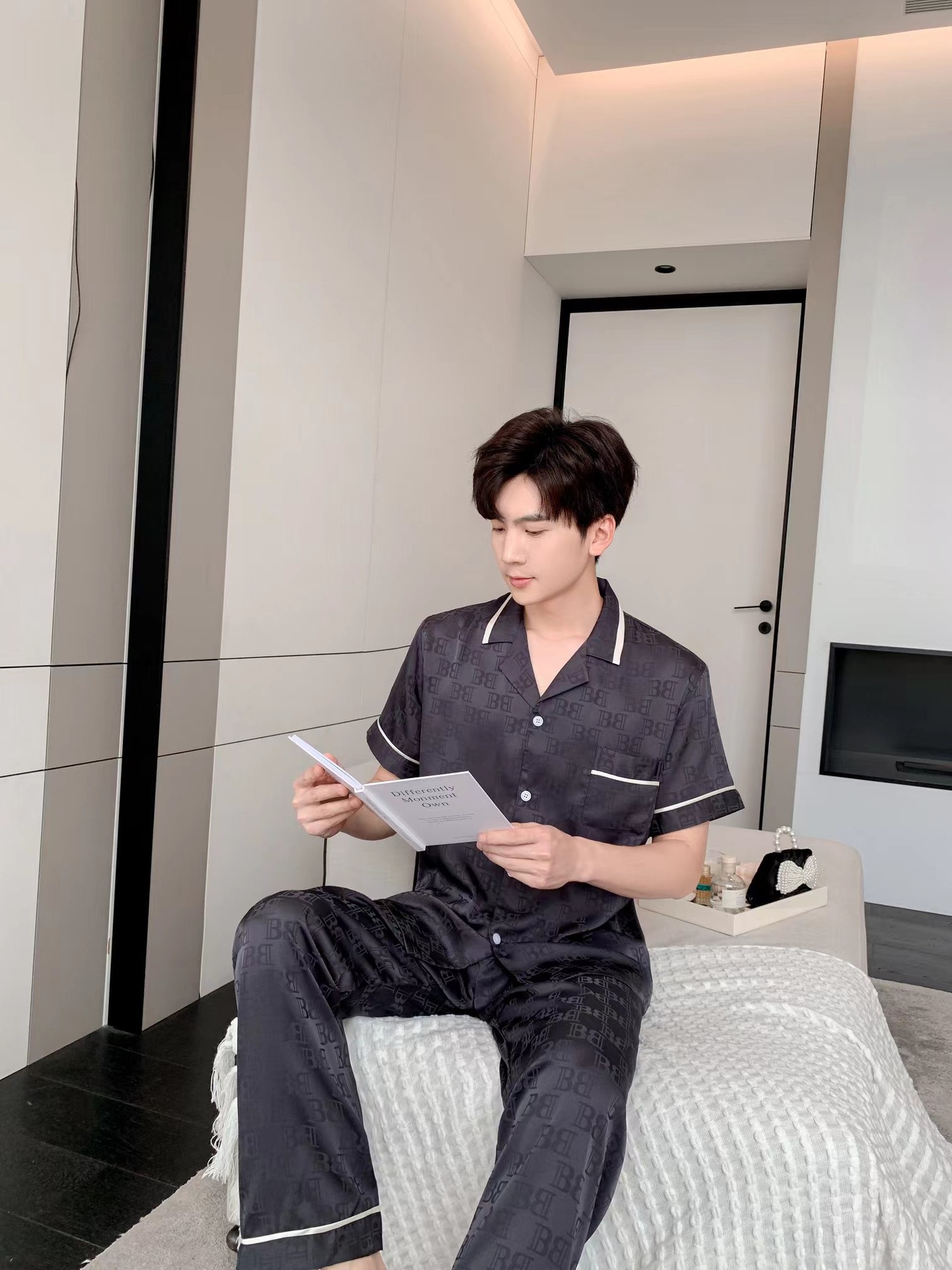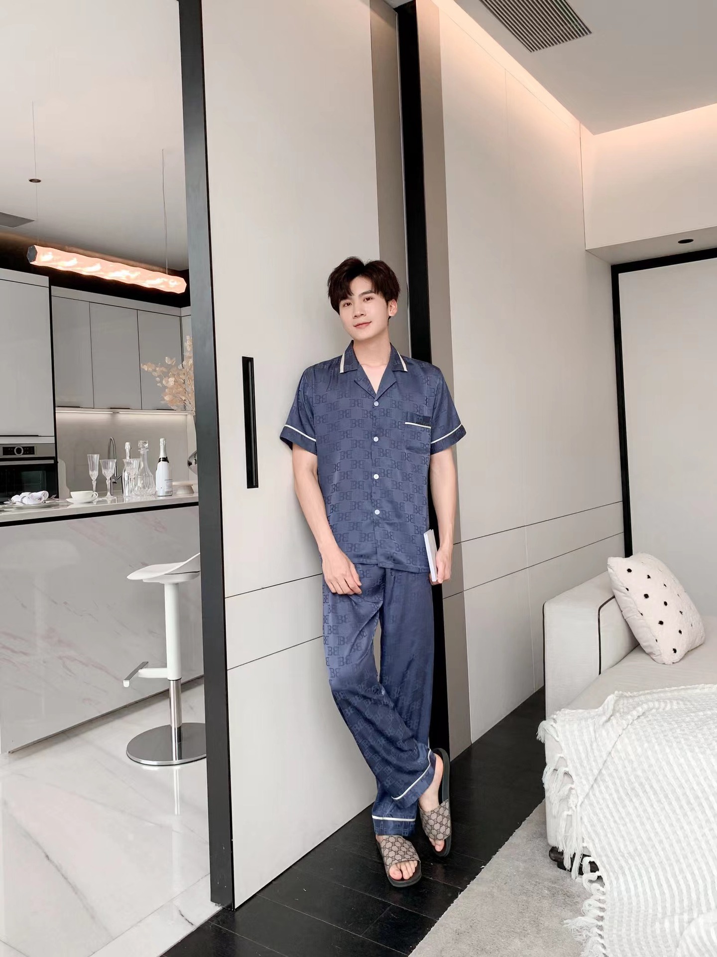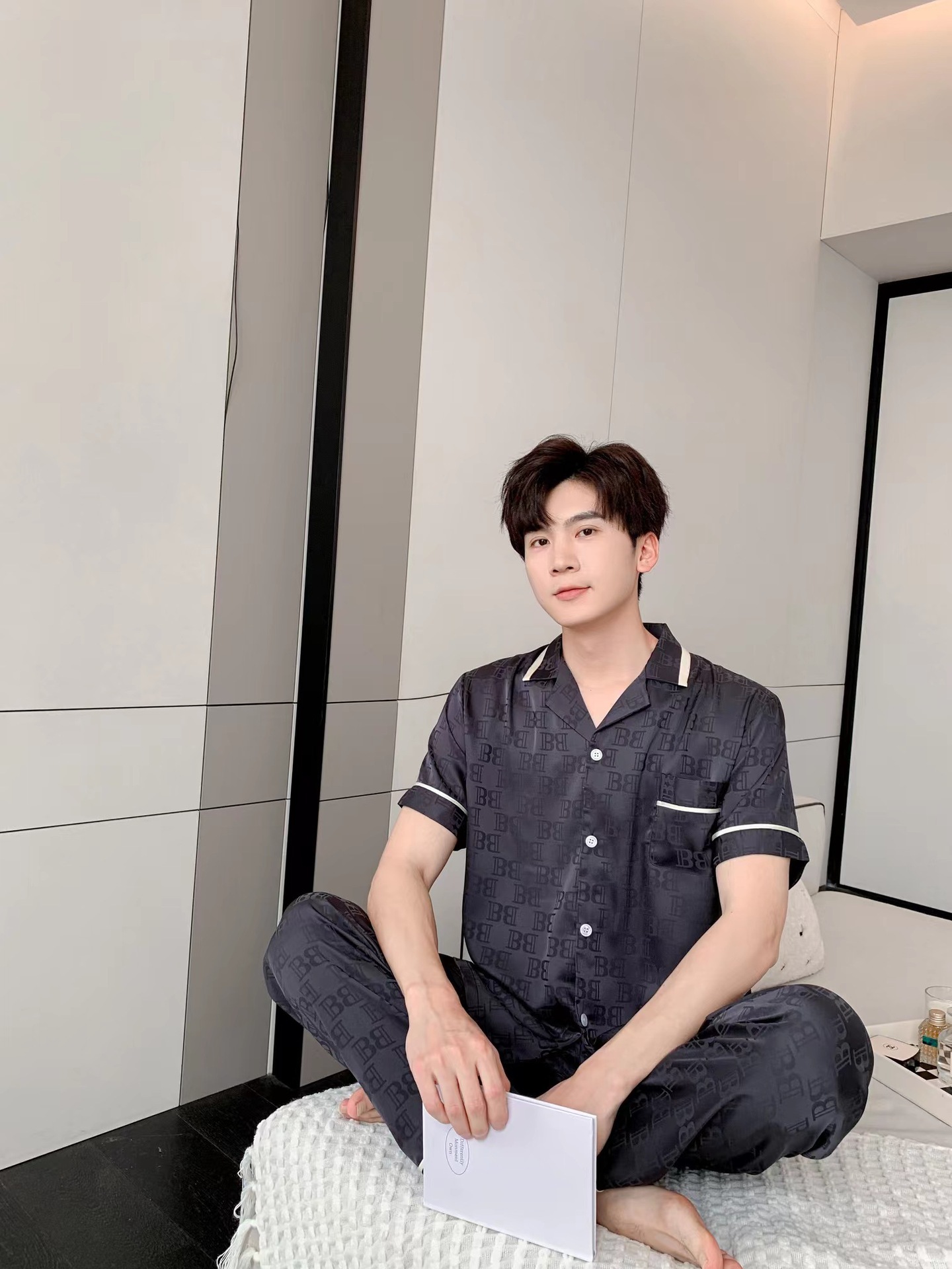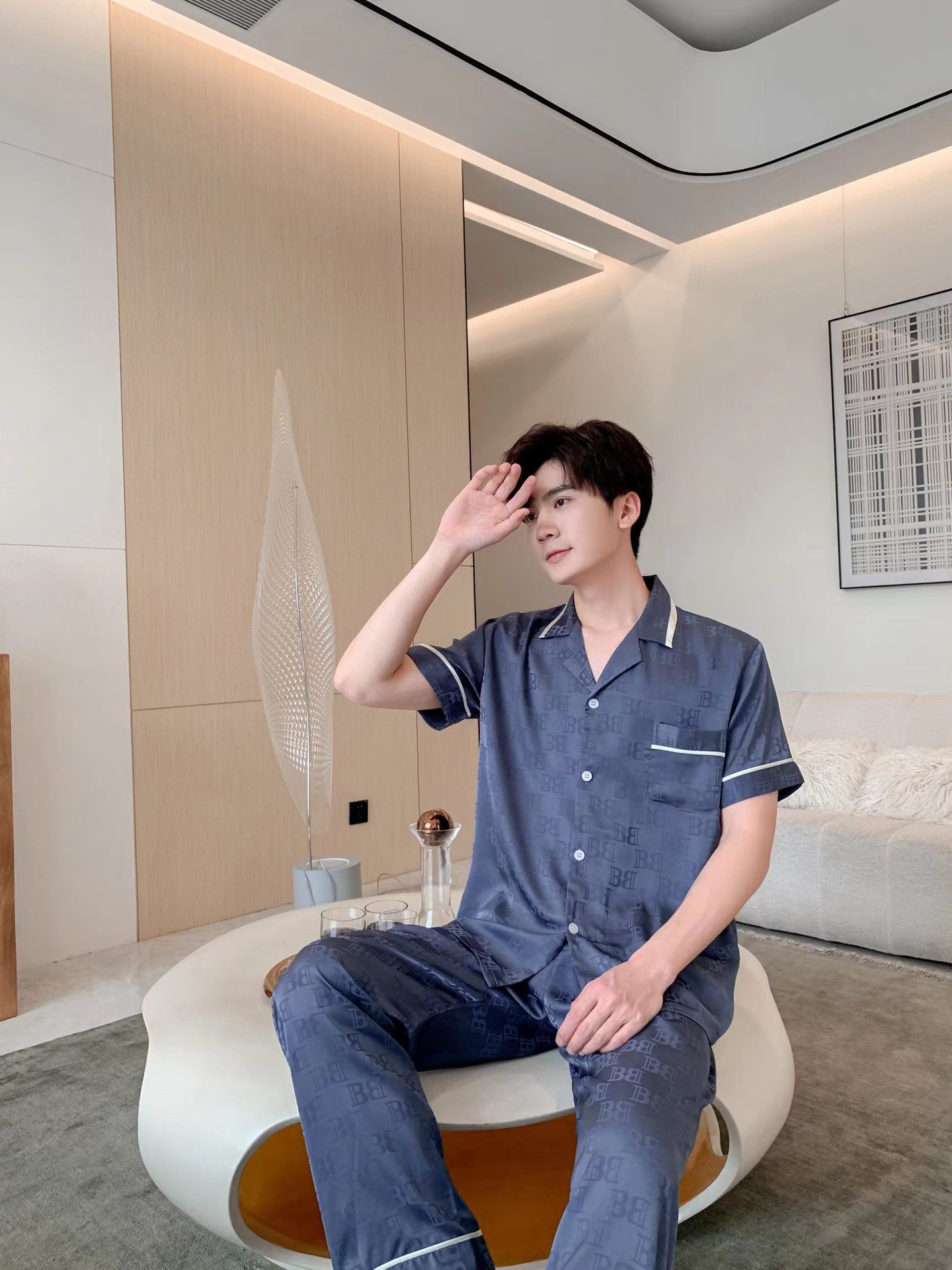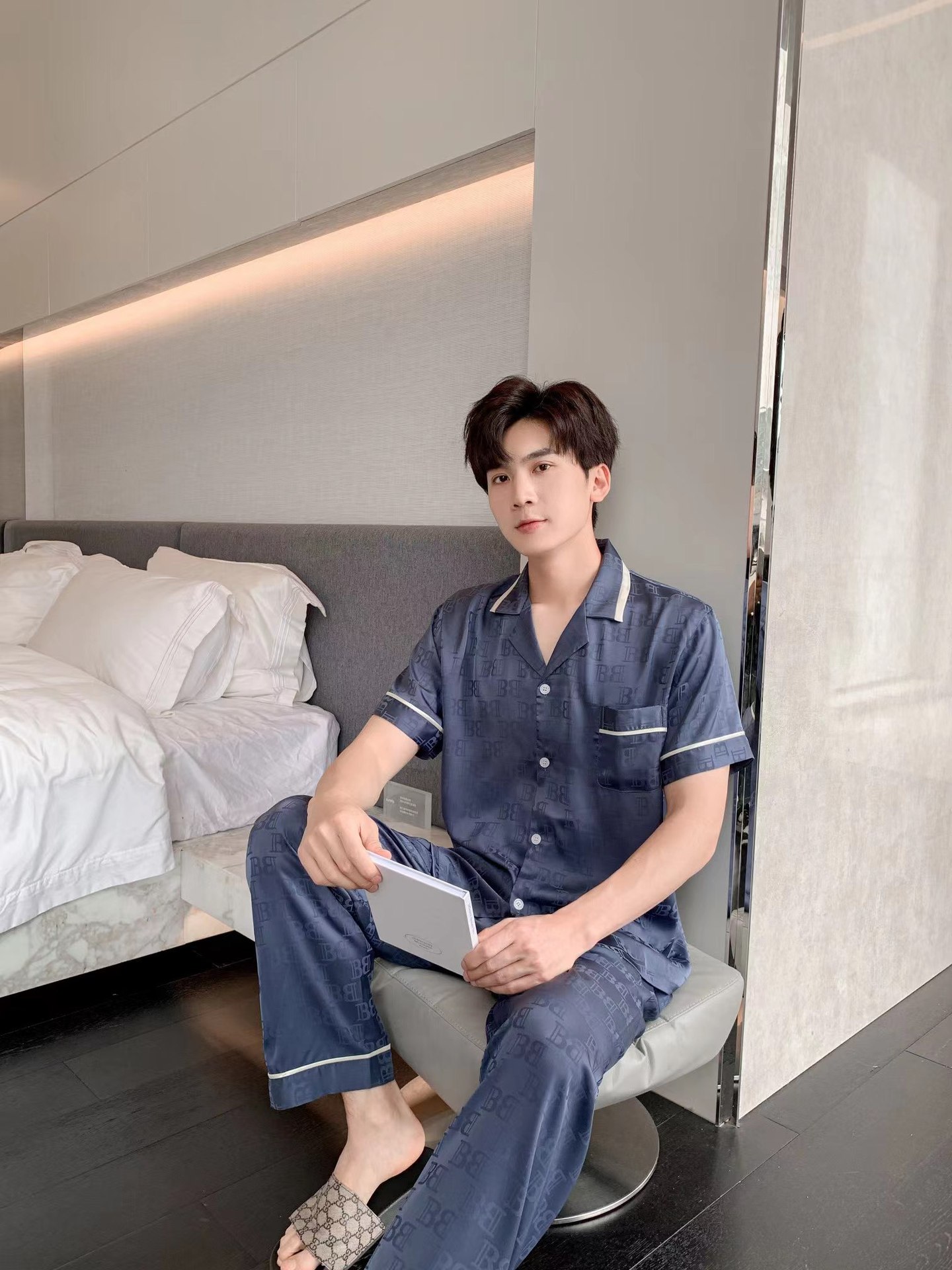남자 아이스 실크 파자마 봄과 가을 새로운 남자 한국식 하이 엔드 여름 홈 착용 반팔 바지스토어 가기
