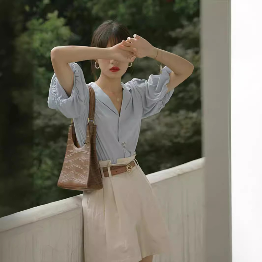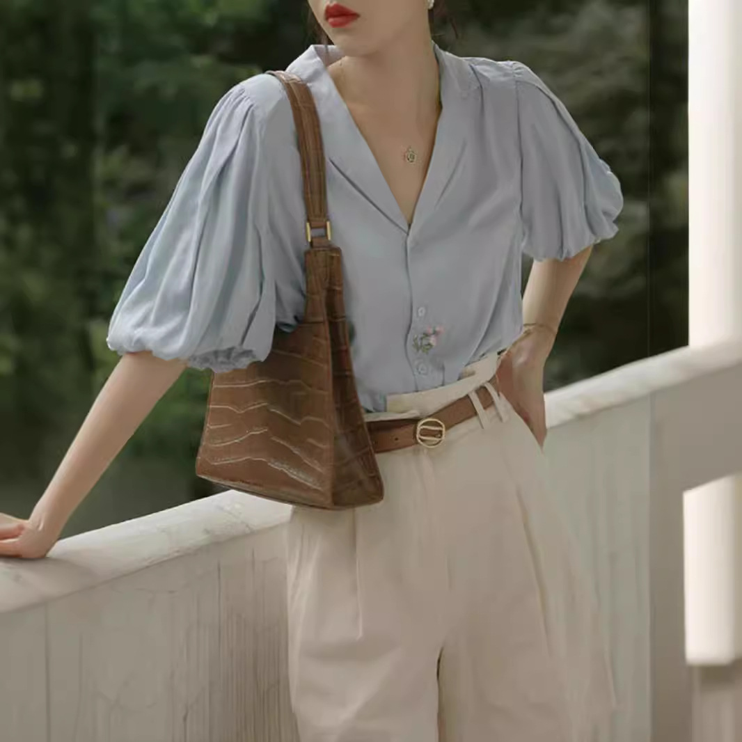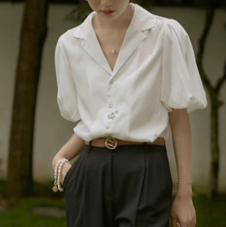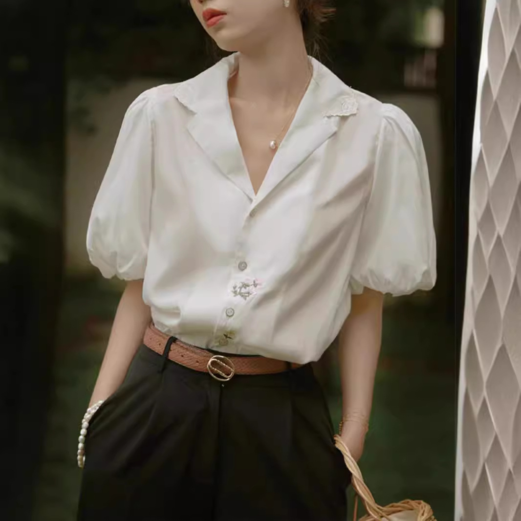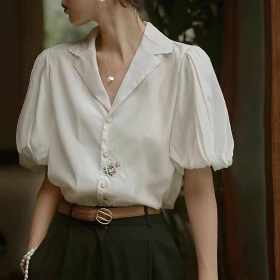 프랑스 틈새 세련된 흰색 퍼프 소매 셔츠 여성의 여름 외국 스타일 복고풍 꽃 서양식 탑 얇은 칼라