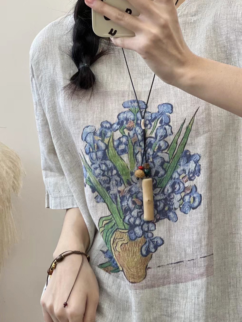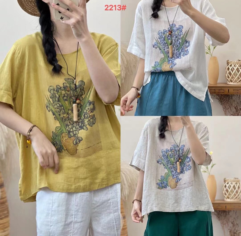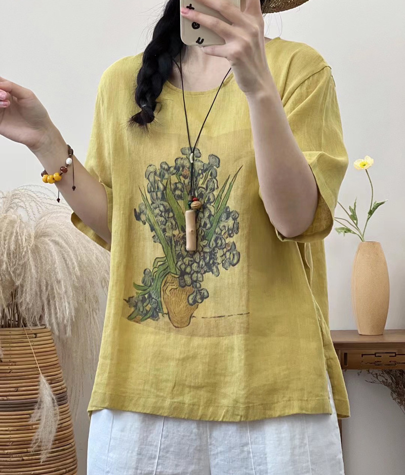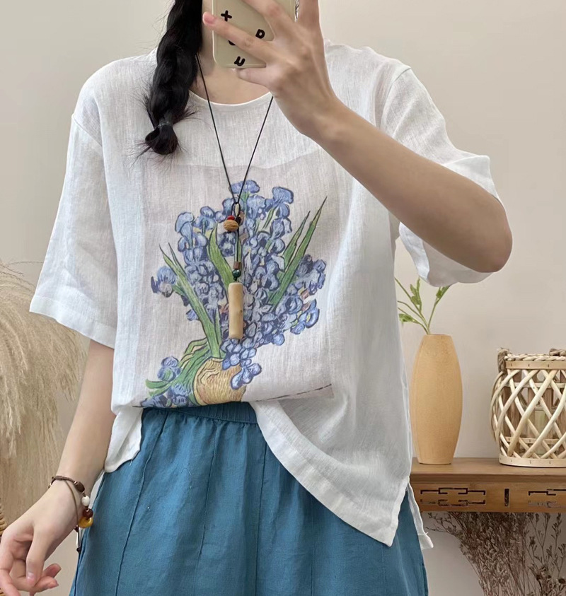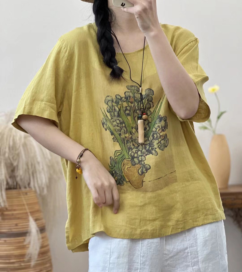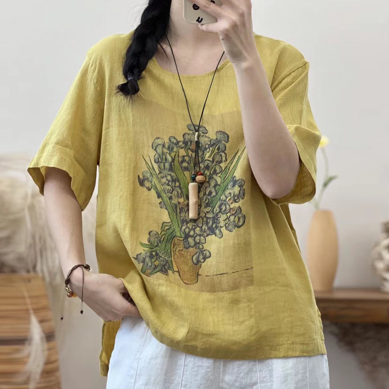 예술적 스타일 인쇄 반팔 티셔츠 여성 여름 새로운 느슨한 복고풍 둥근 목 인쇄 플러스 사이즈 여성 의류스토어 가기