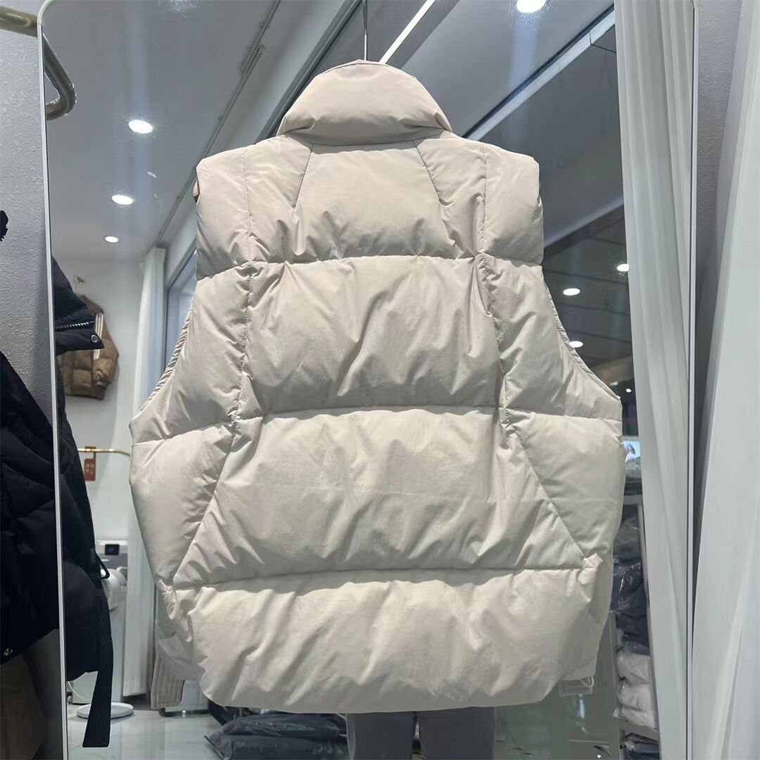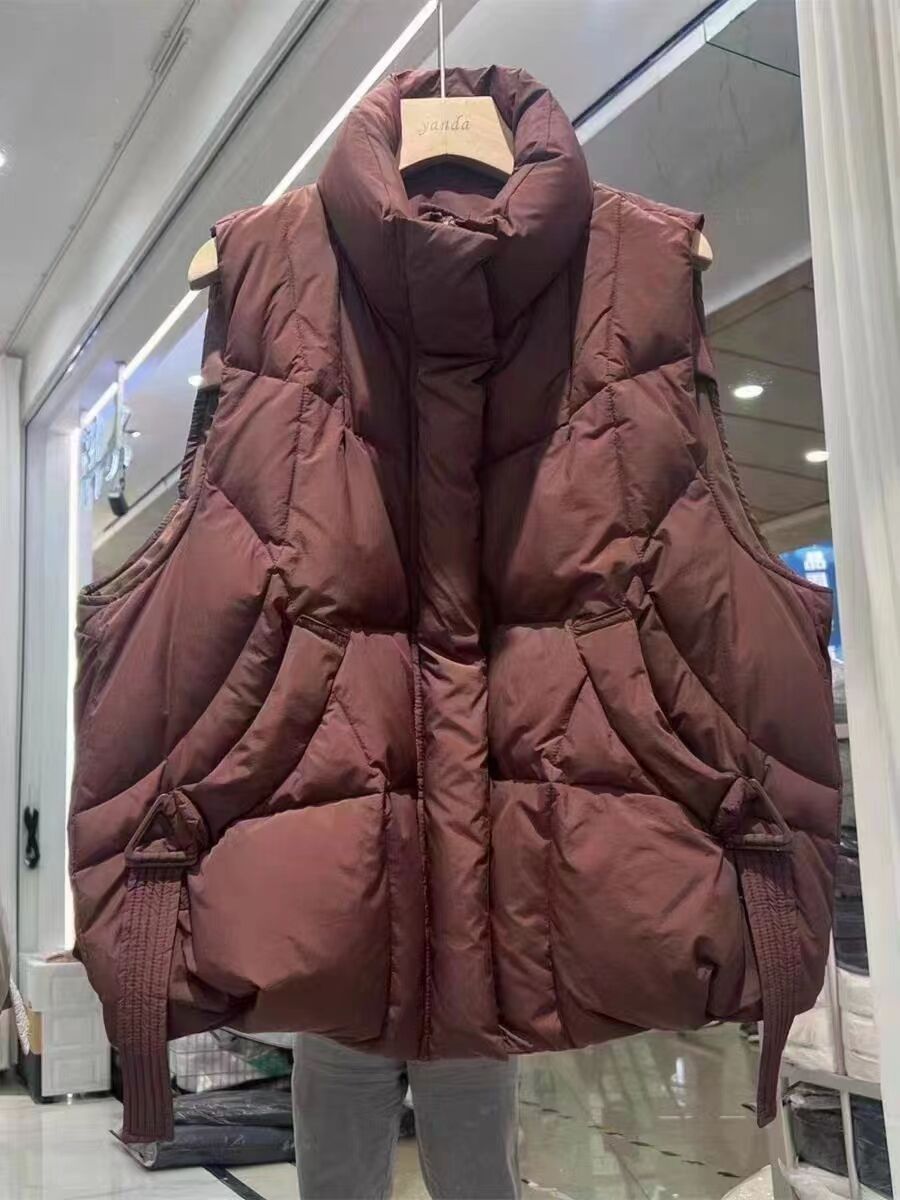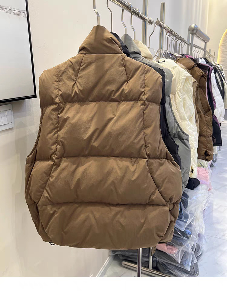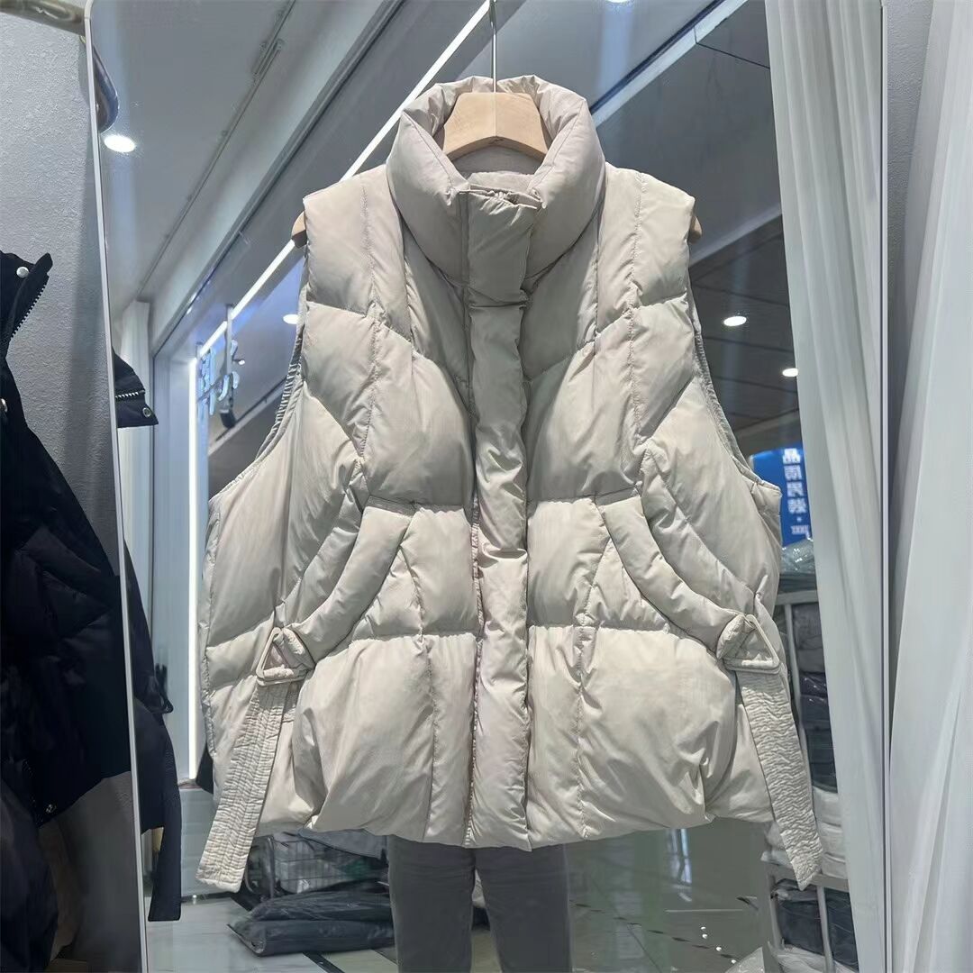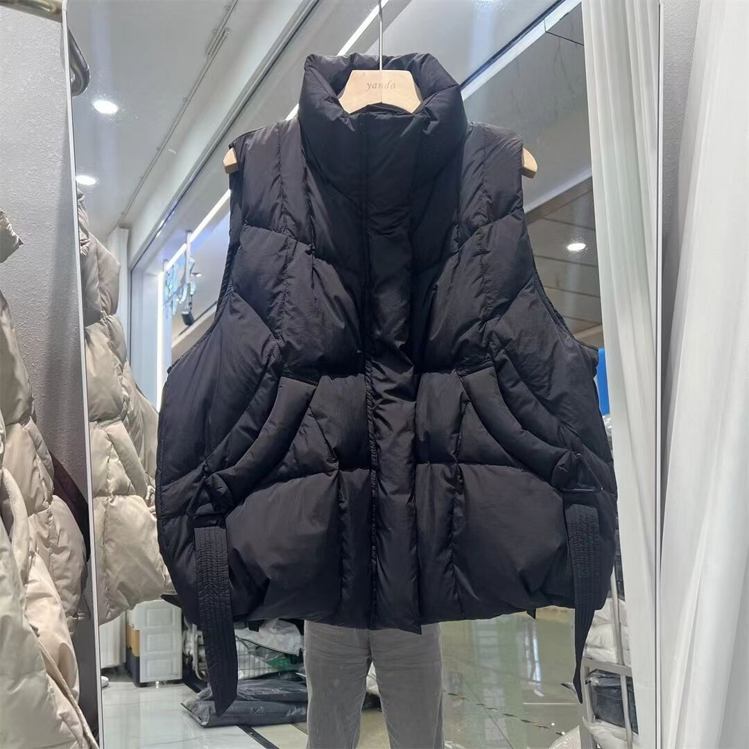 2025 가을, 겨울 짧은 다운 재킷 조끼 여성 스탠드 칼라 두꺼운 느슨한 삼각형 버클 리본 화이트 오리 다운 조끼 재킷스토어 가기