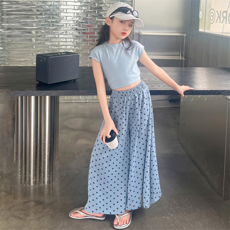 여아 여름 반팔 세트 2025 신상 한국 스타일 중대형 어린이 얇은 슬림핏 티셔츠 루즈핏 물방울 무늬 스커트 팬츠 트렌디