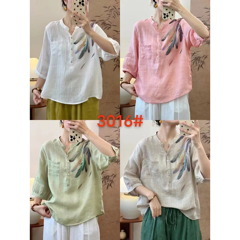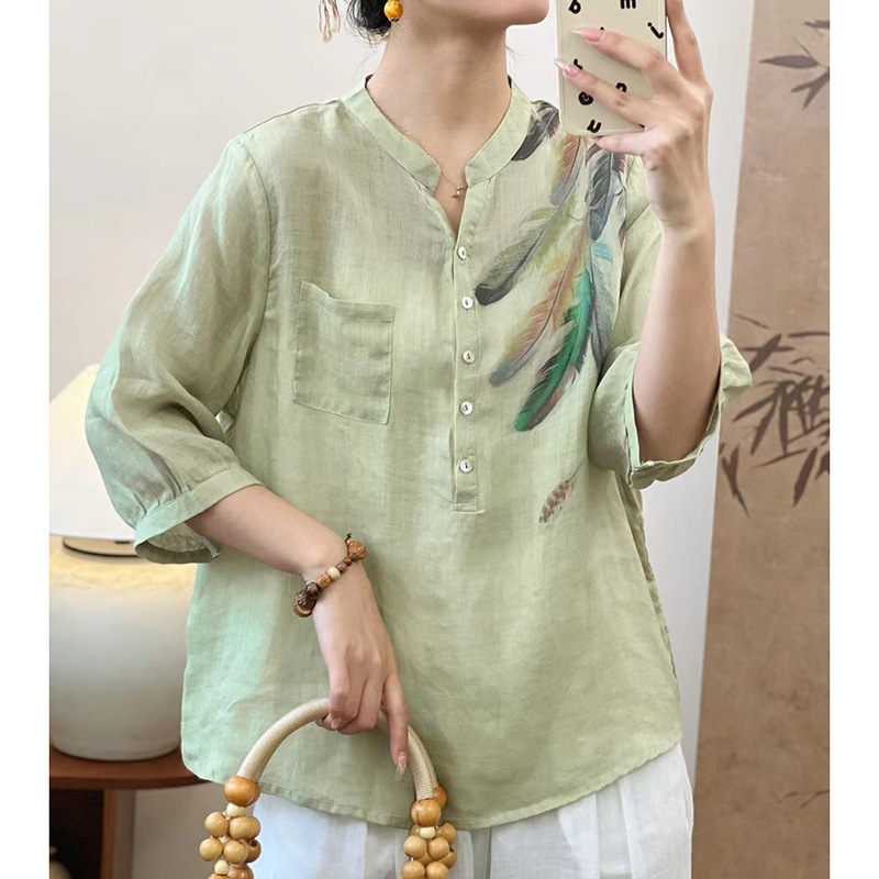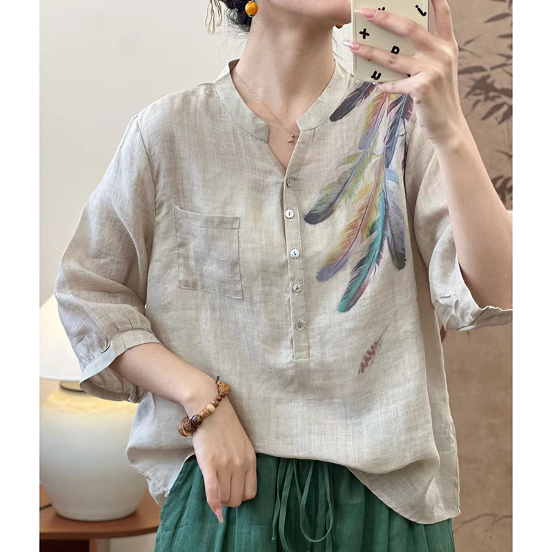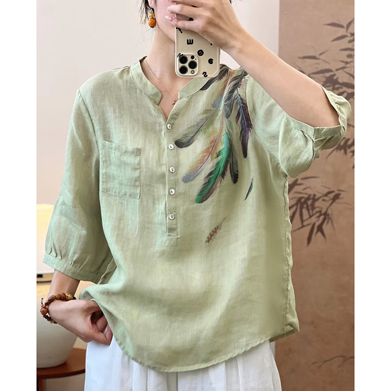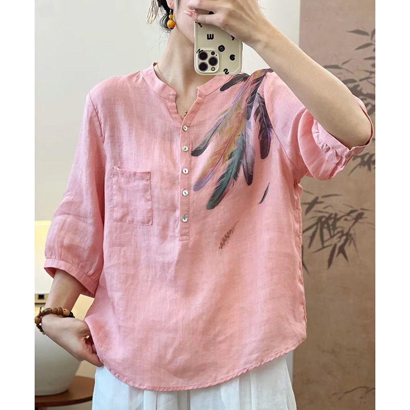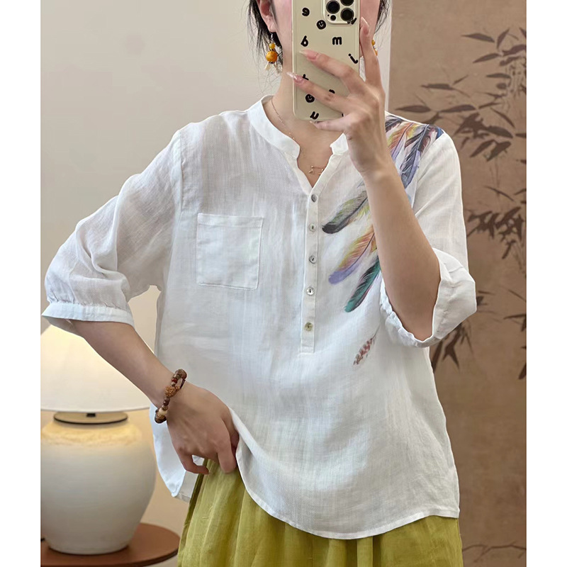 2024 여름 새로운 수직 칼라 버클 풀오버 플러스 사이즈 슬리밍 티셔츠 스티칭 포켓 디지털 인쇄 탑