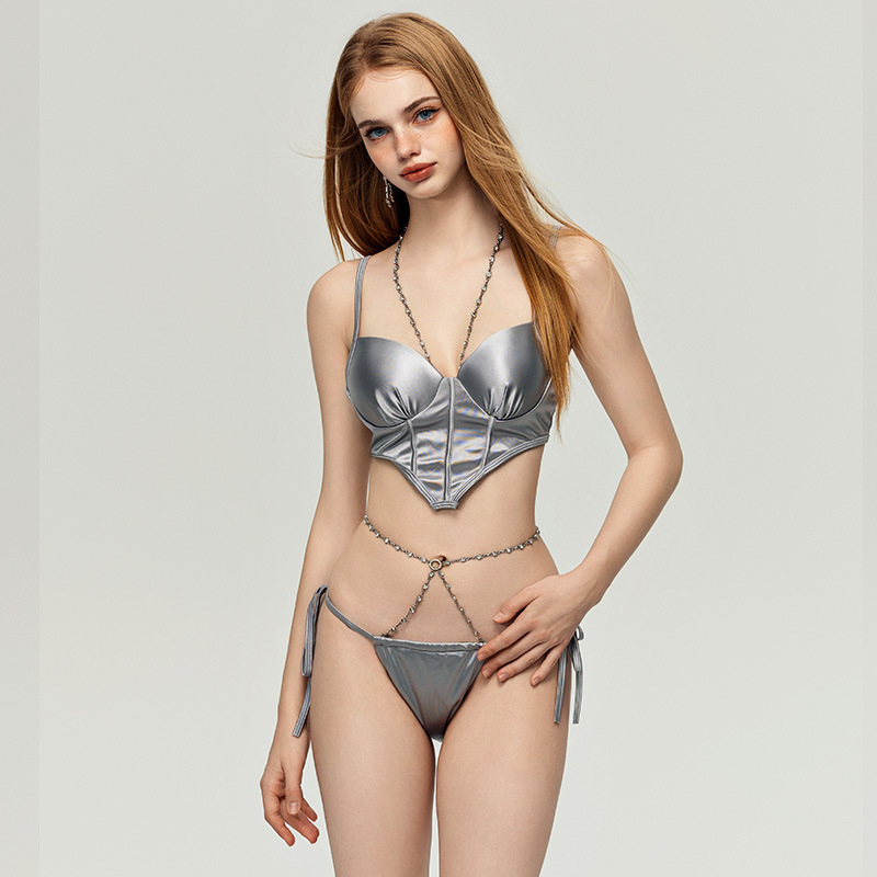 欧美性感银色辣妹钻链比基尼显瘦聚拢温泉度假包臀裙分体泳衣女