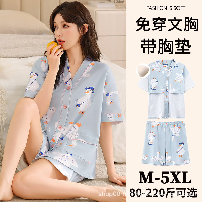여름 느슨한 파자마 가슴 패드와 여성 기모노 Combed 코튼 플러스 사이즈 통통녀 얇은 홈 의류 여름 세트스토어 가기