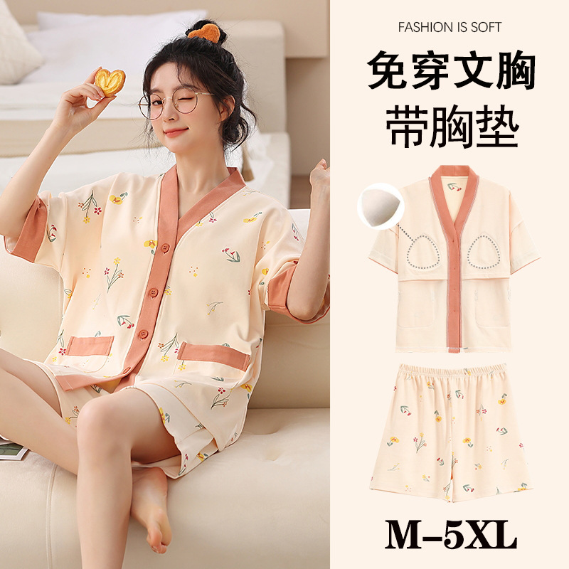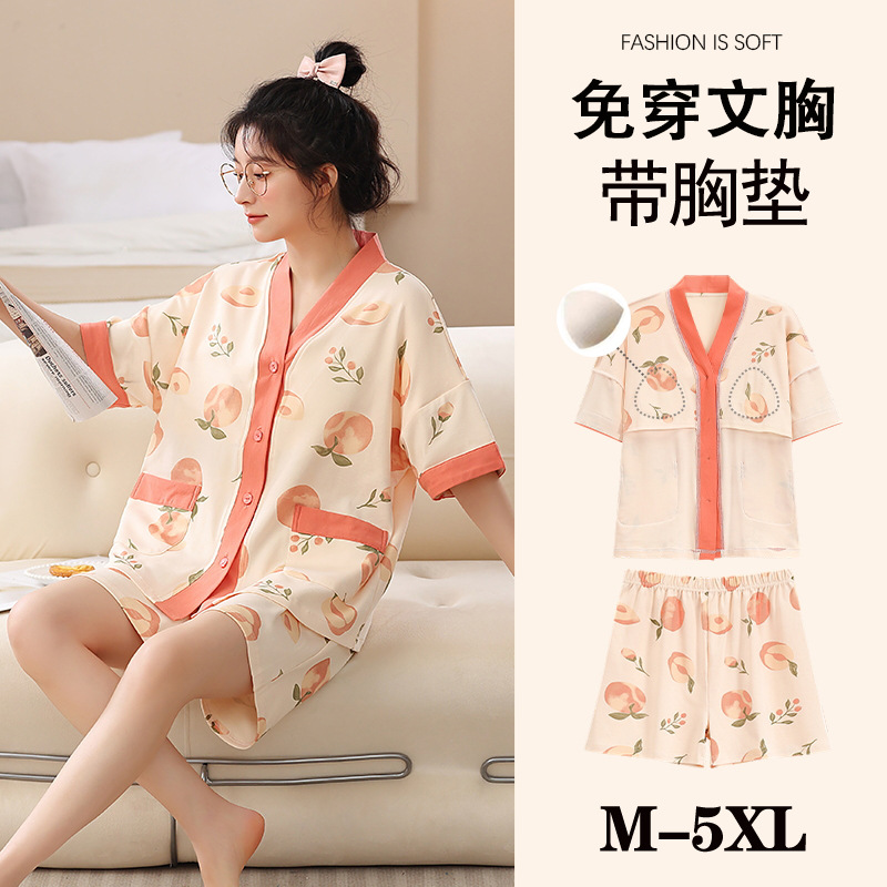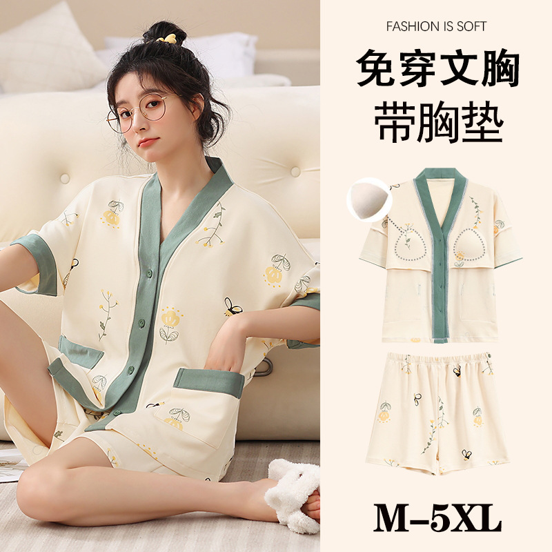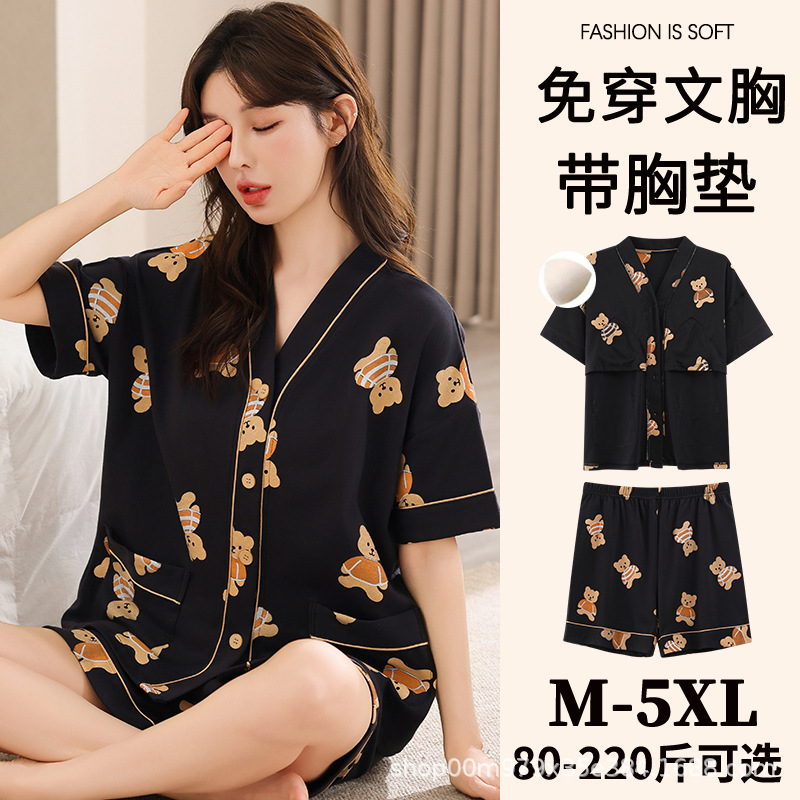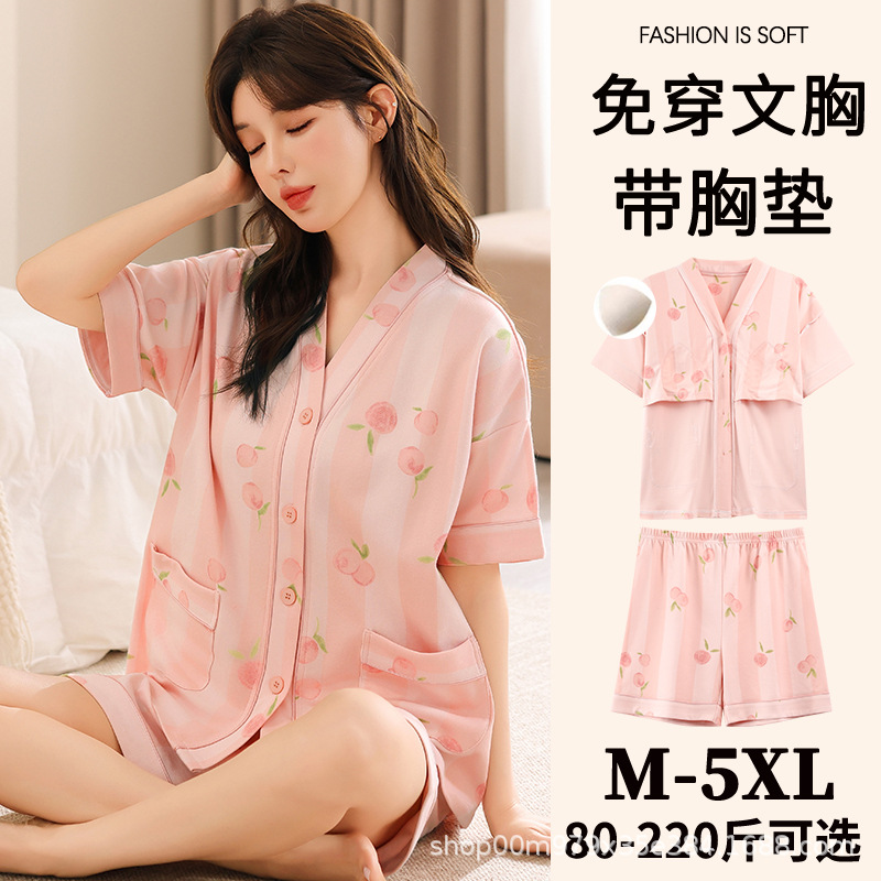 여름 느슨한 파자마 가슴 패드와 여성 기모노 Combed 코튼 플러스 사이즈 통통녀 얇은 홈 의류 여름 세트