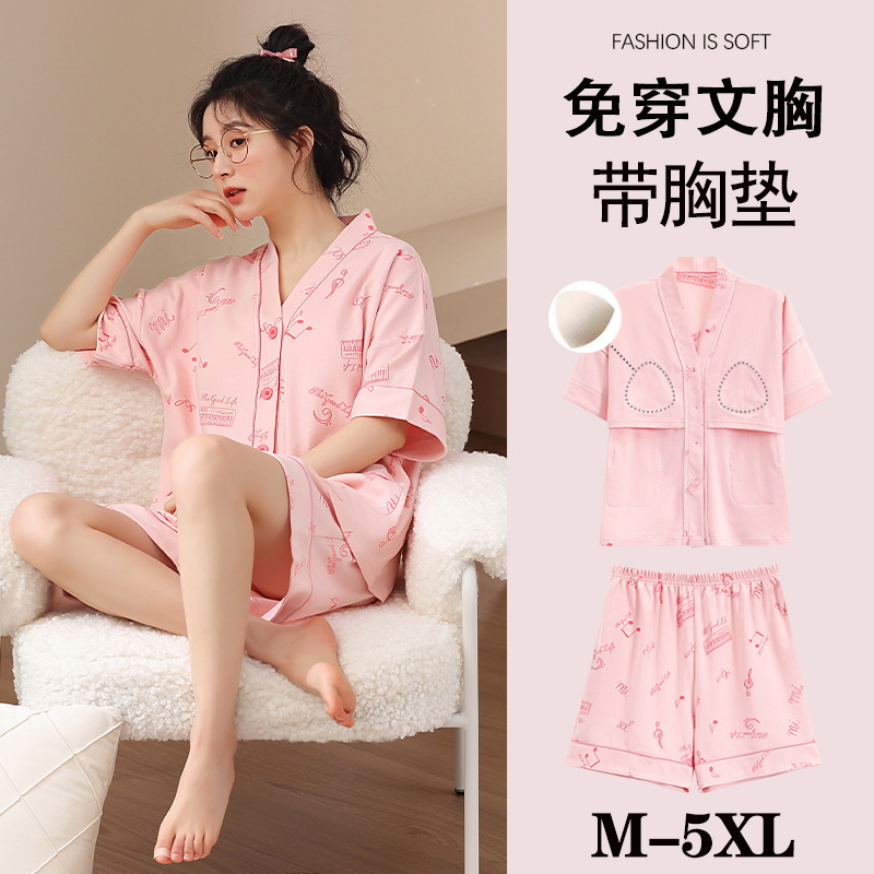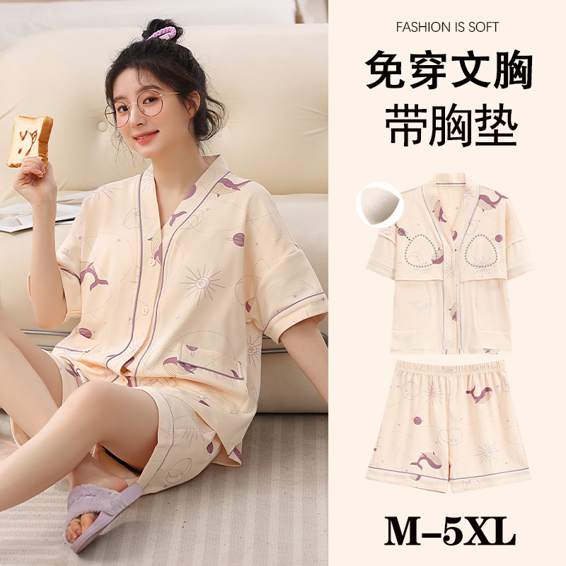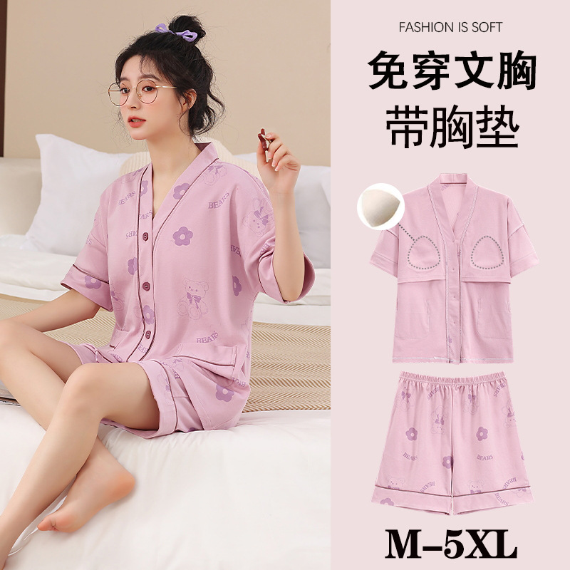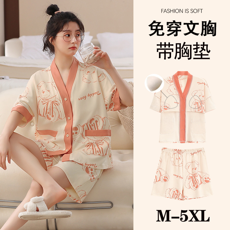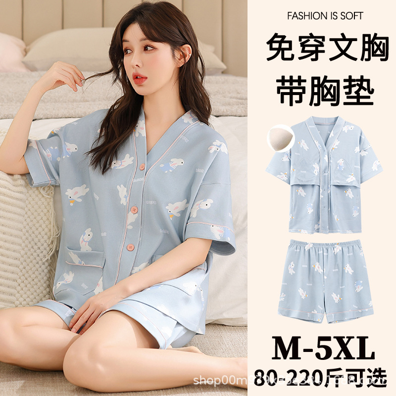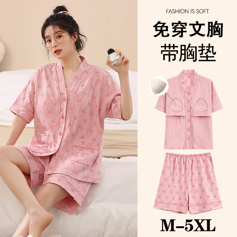 여름 느슨한 파자마 가슴 패드와 여성 기모노 Combed 코튼 플러스 사이즈 통통녀 얇은 홈 의류 여름 세트
