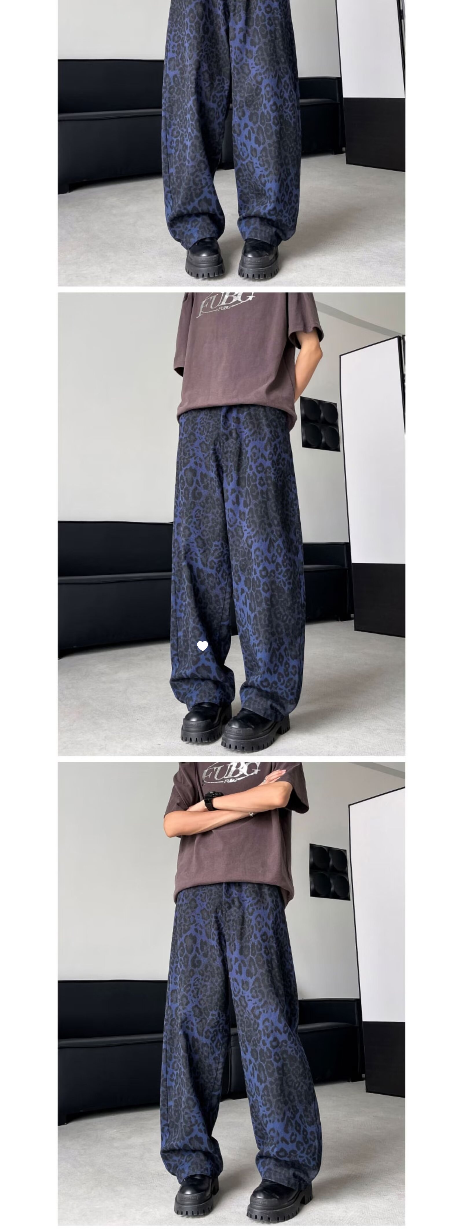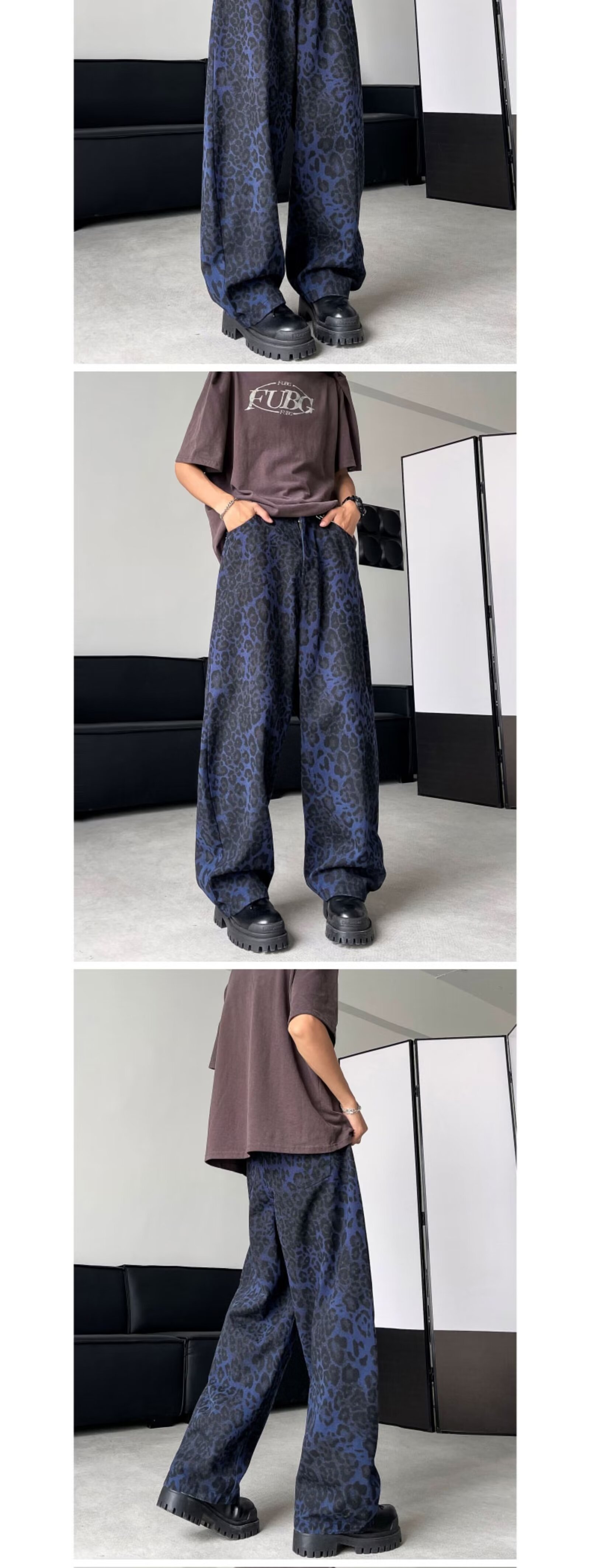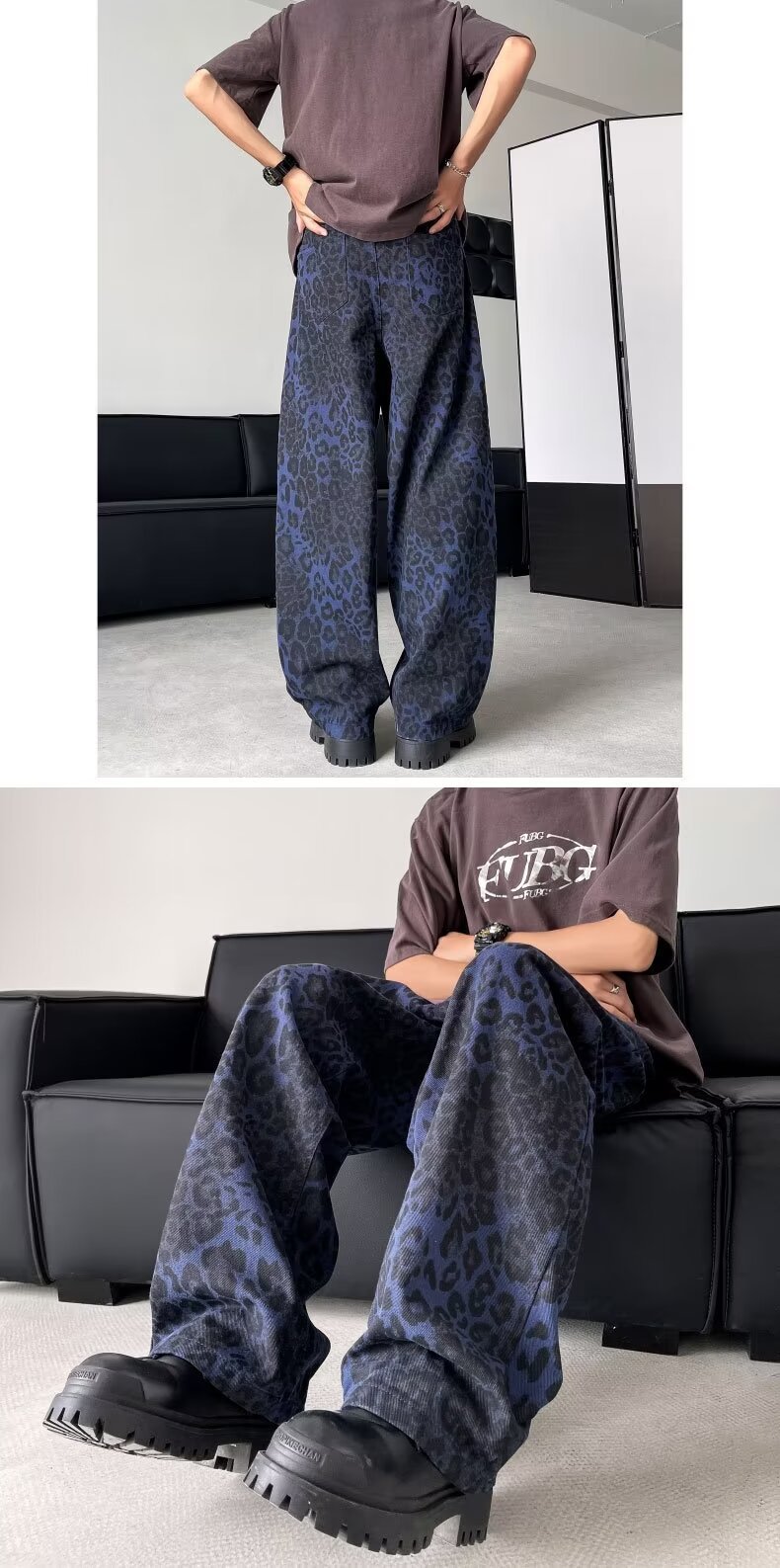 2024 여름 새로운 한국 스타일 틈새 디자인 레트로 오래 된 액체 블루 레오파드 무늬 청바지 여성의 트렌디 한 퍼플 블루스토어 가기