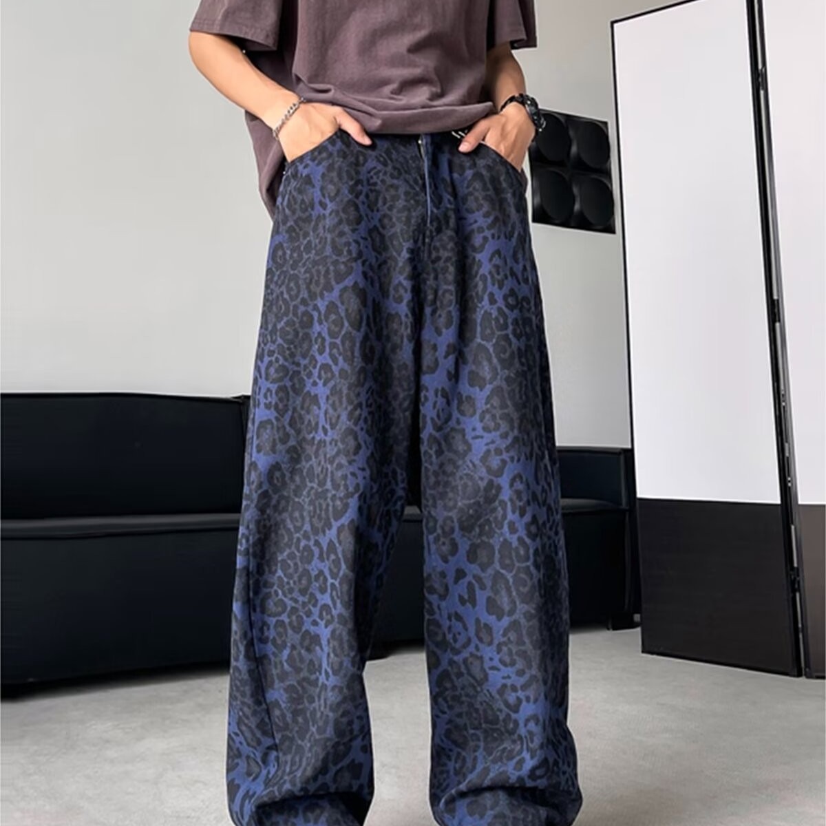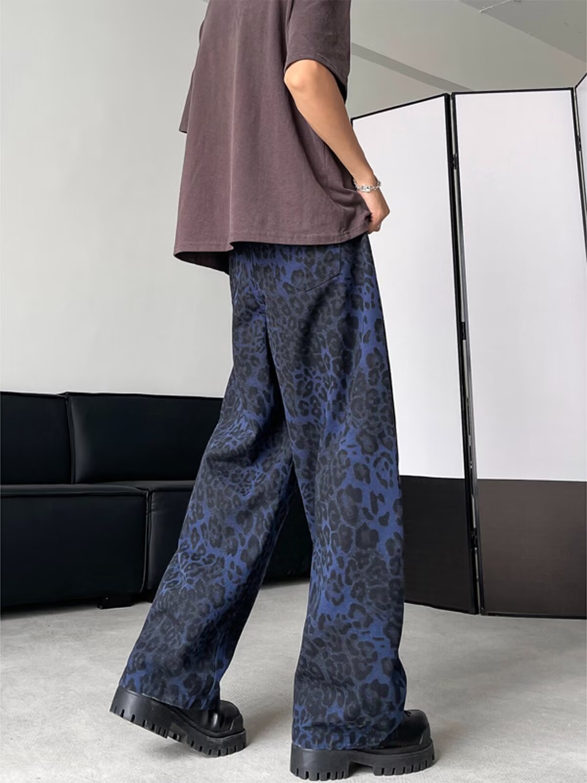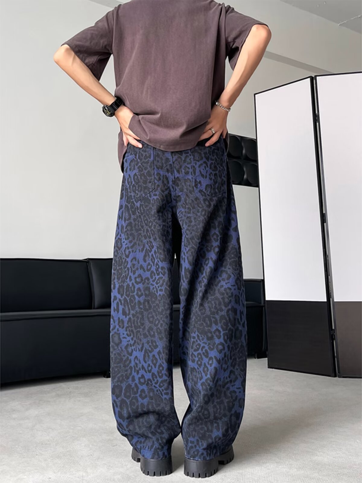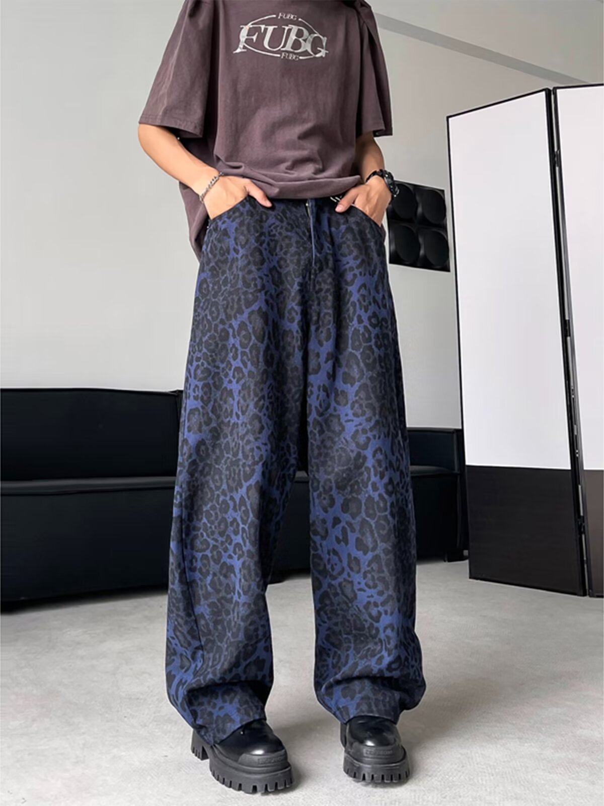 2024 여름 새로운 한국 스타일 틈새 디자인 레트로 오래 된 액체 블루 레오파드 무늬 청바지 여성의 트렌디 한 퍼플 블루스토어 가기