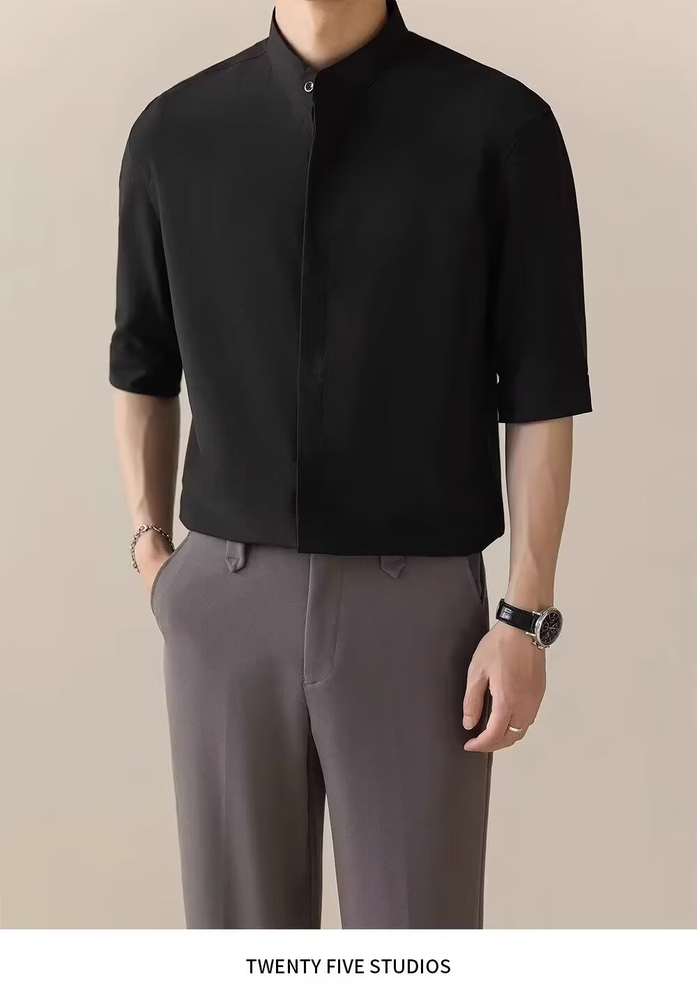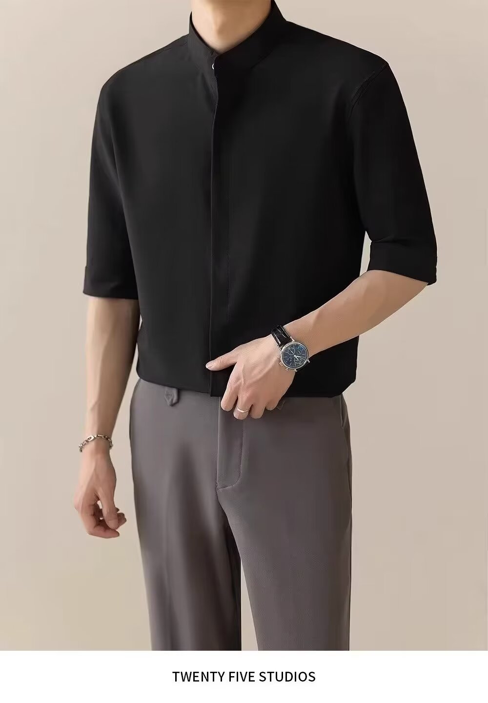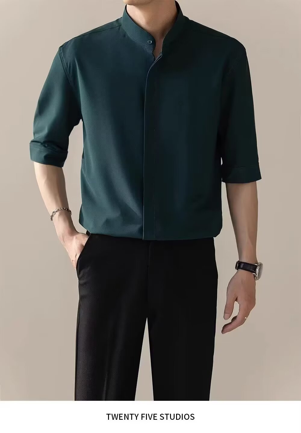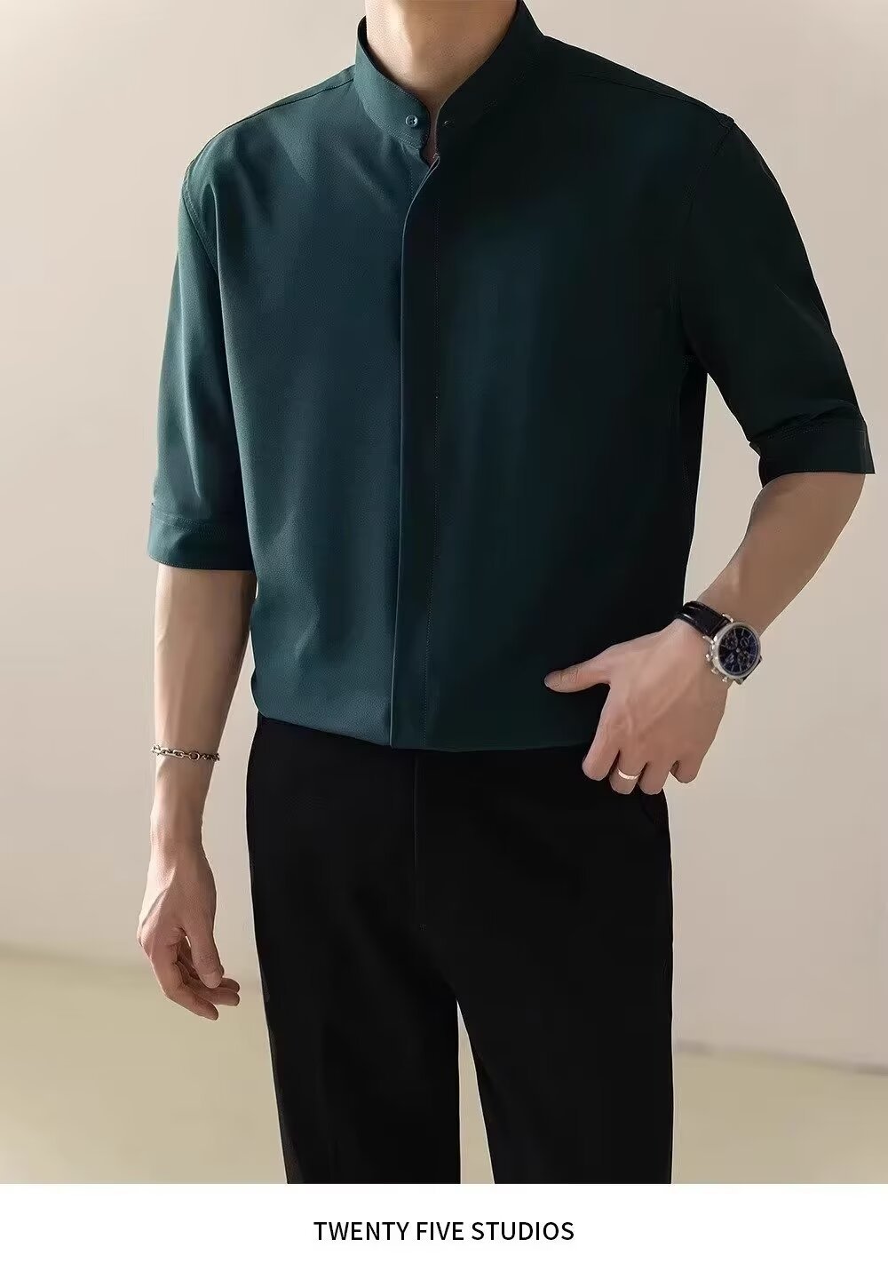 2024 새로운 중국 스타일 스타일 수직 칼라 느슨한 얇은 셔츠 남자의 중간 소매 포장 둥근 목 반 소매 셔츠 다크 그린스토어 가기
