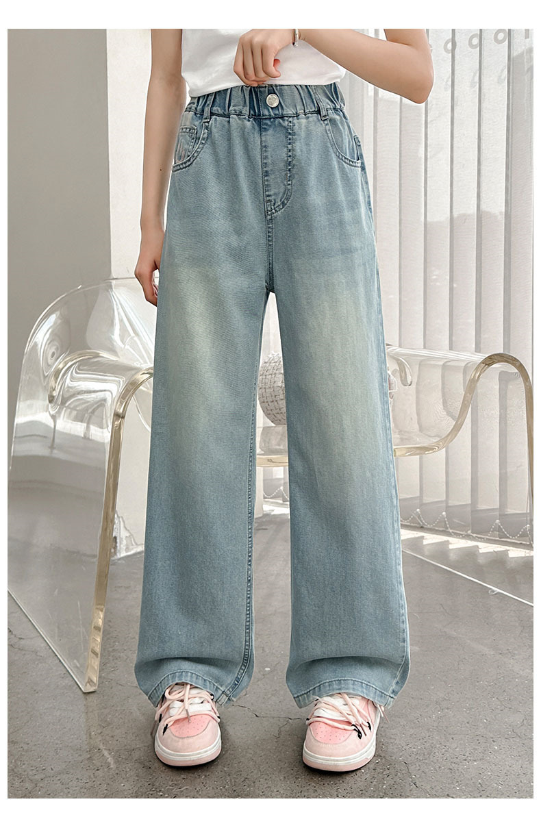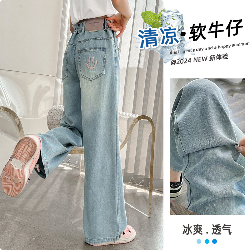 소녀 얇은 바지 여름 웃는 텐셀 청바지 2024 새로운 도착 대형 어린이 바지 여름 넓은 다리 바지