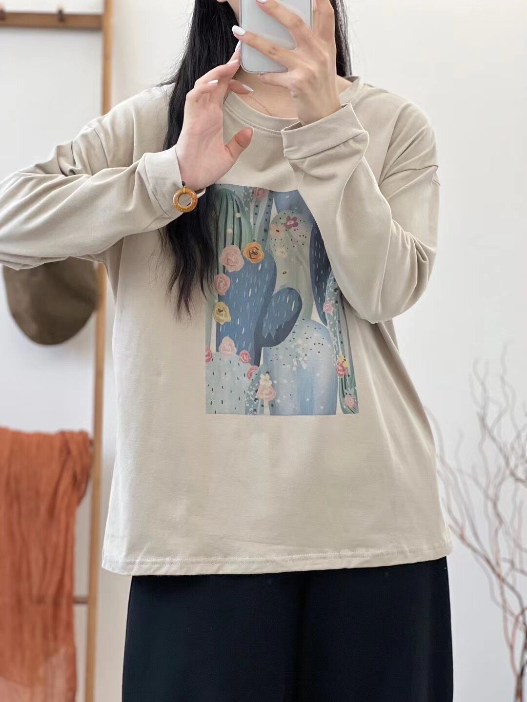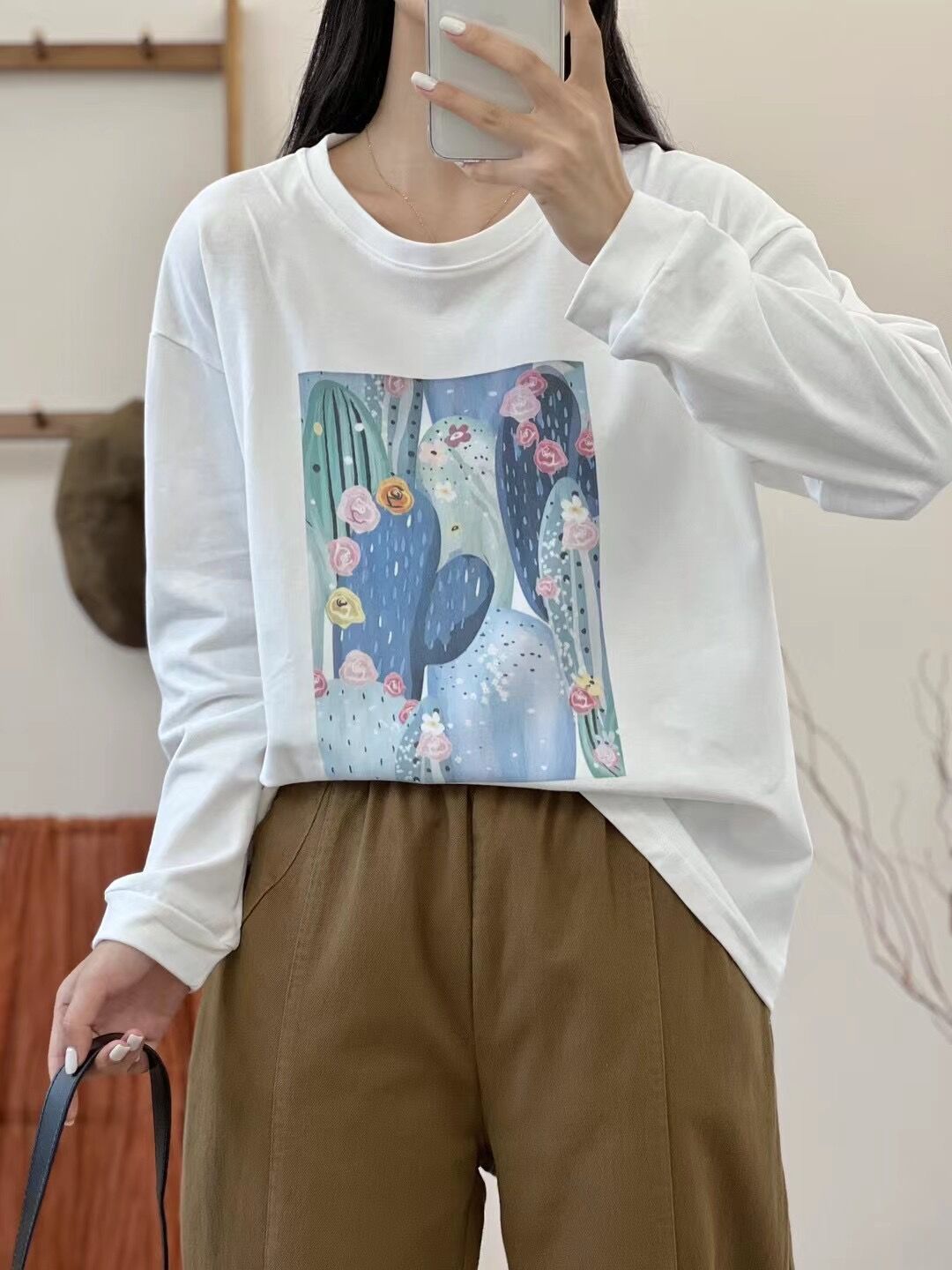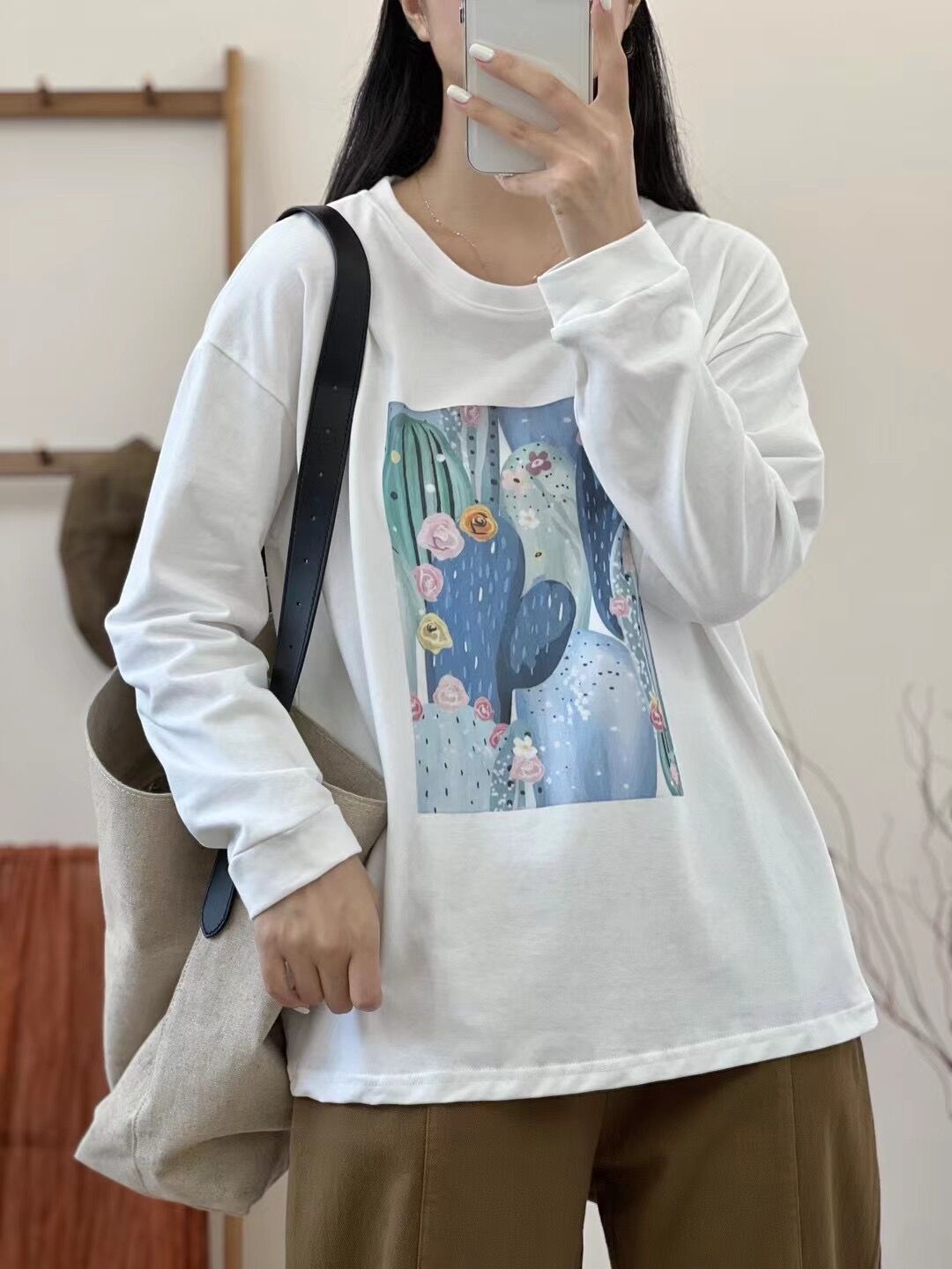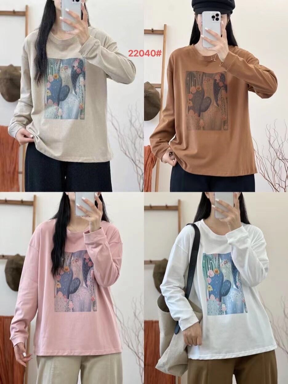 2024 가을 새로운 인쇄 티셔츠 연령 감소 패션 올 매치 크루 넥 탑 여성 예술적 느슨한 긴팔 티셔츠
