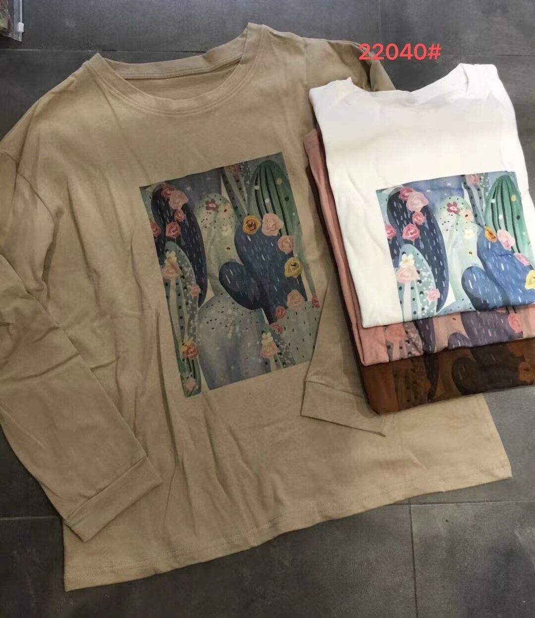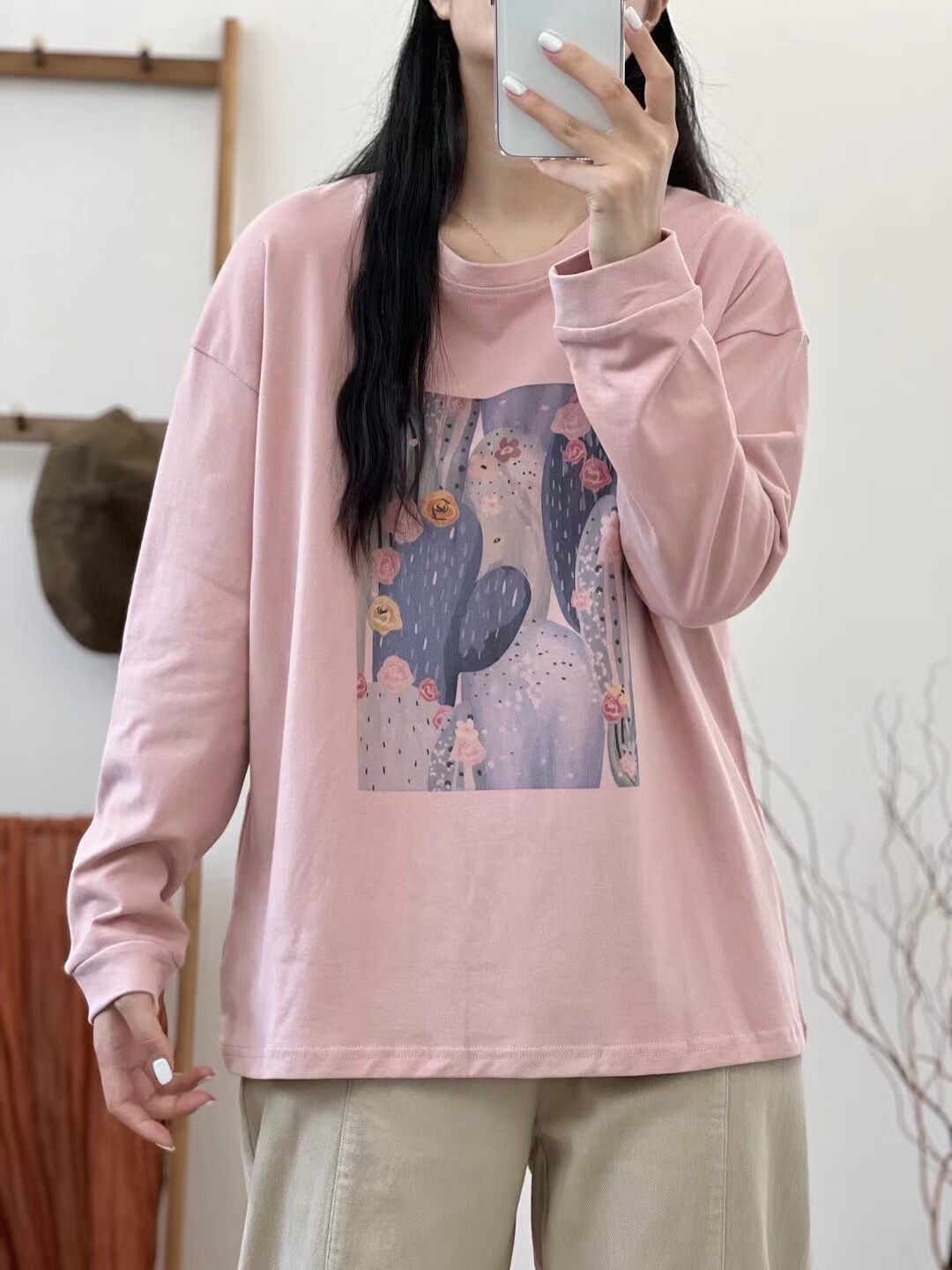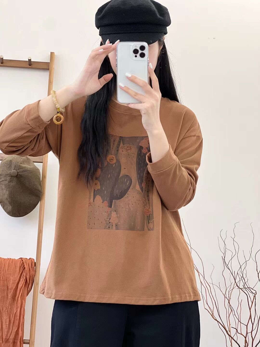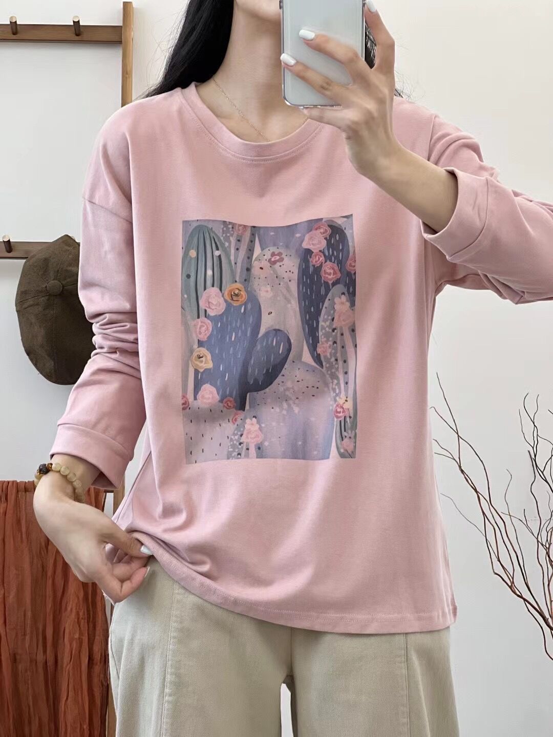 2024 가을 새로운 인쇄 티셔츠 연령 감소 패션 올 매치 크루 넥 탑 여성 예술적 느슨한 긴팔 티셔츠