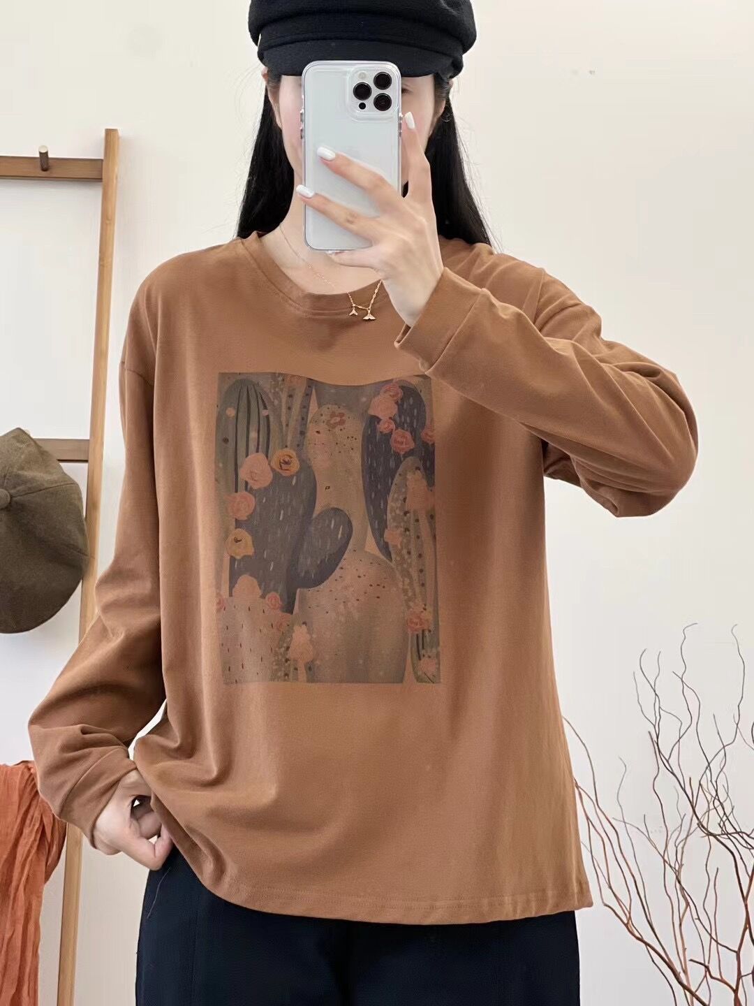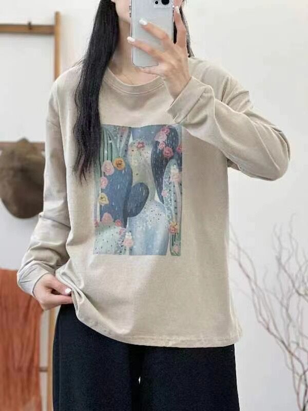 2024 가을 새로운 인쇄 티셔츠 연령 감소 패션 올 매치 크루 넥 탑 여성 예술적 느슨한 긴팔 티셔츠스토어 가기