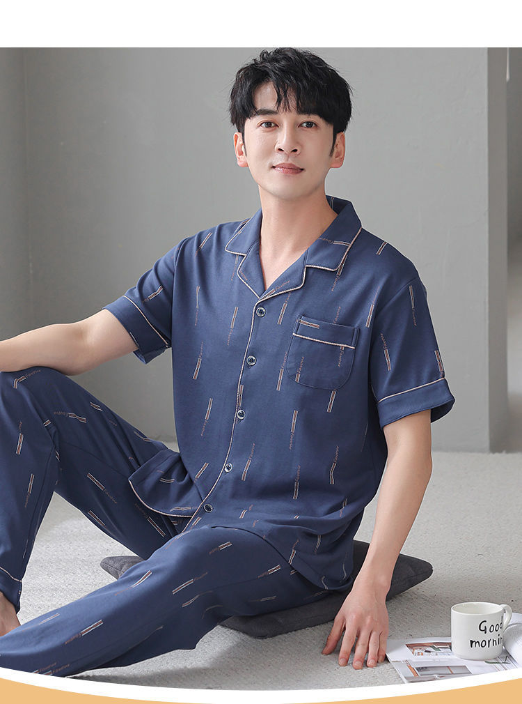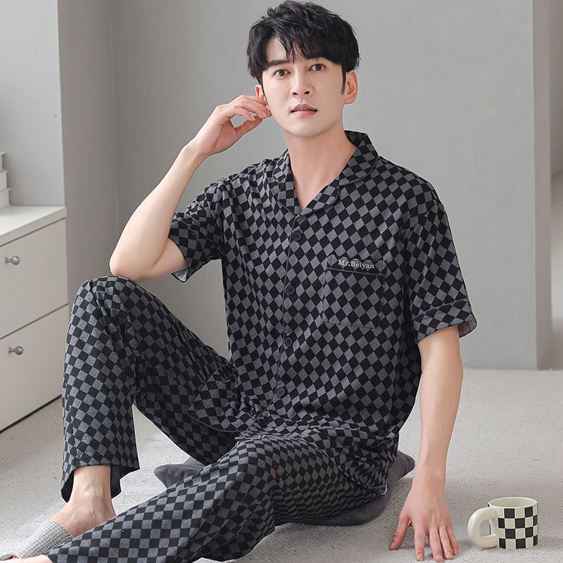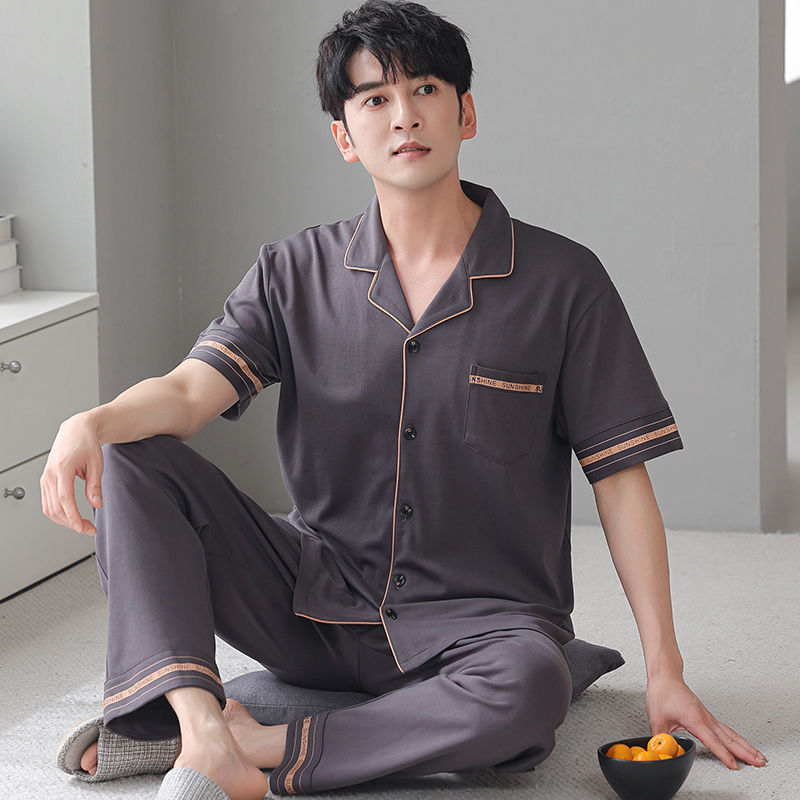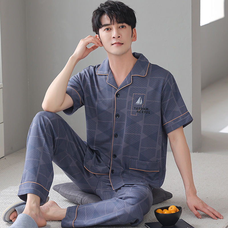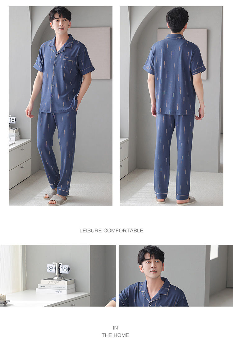 면 2024 새로운 남성 잠옷 여름 반팔 바지 봄과 가을 얇은 외부 착용 홈 옷